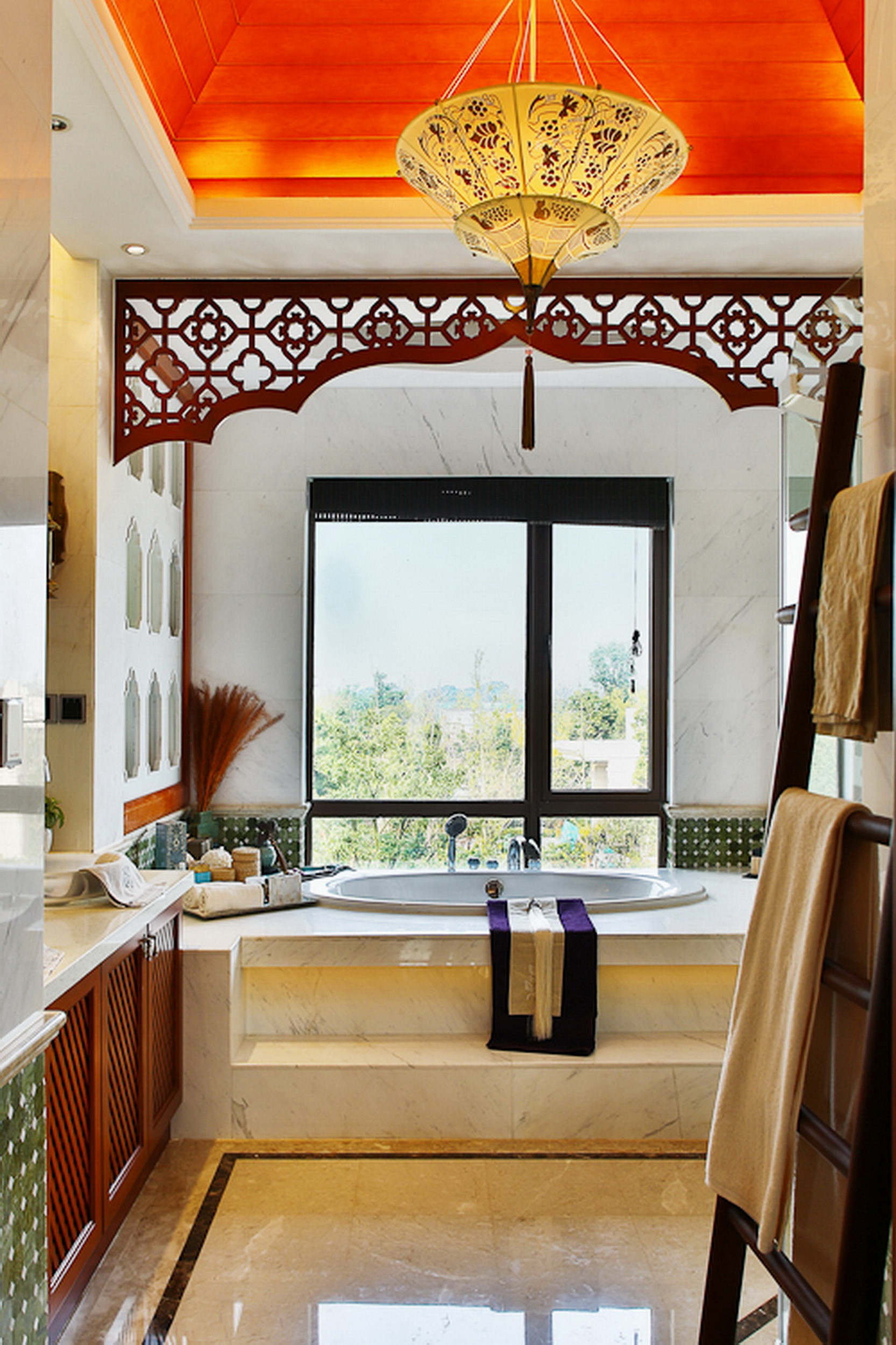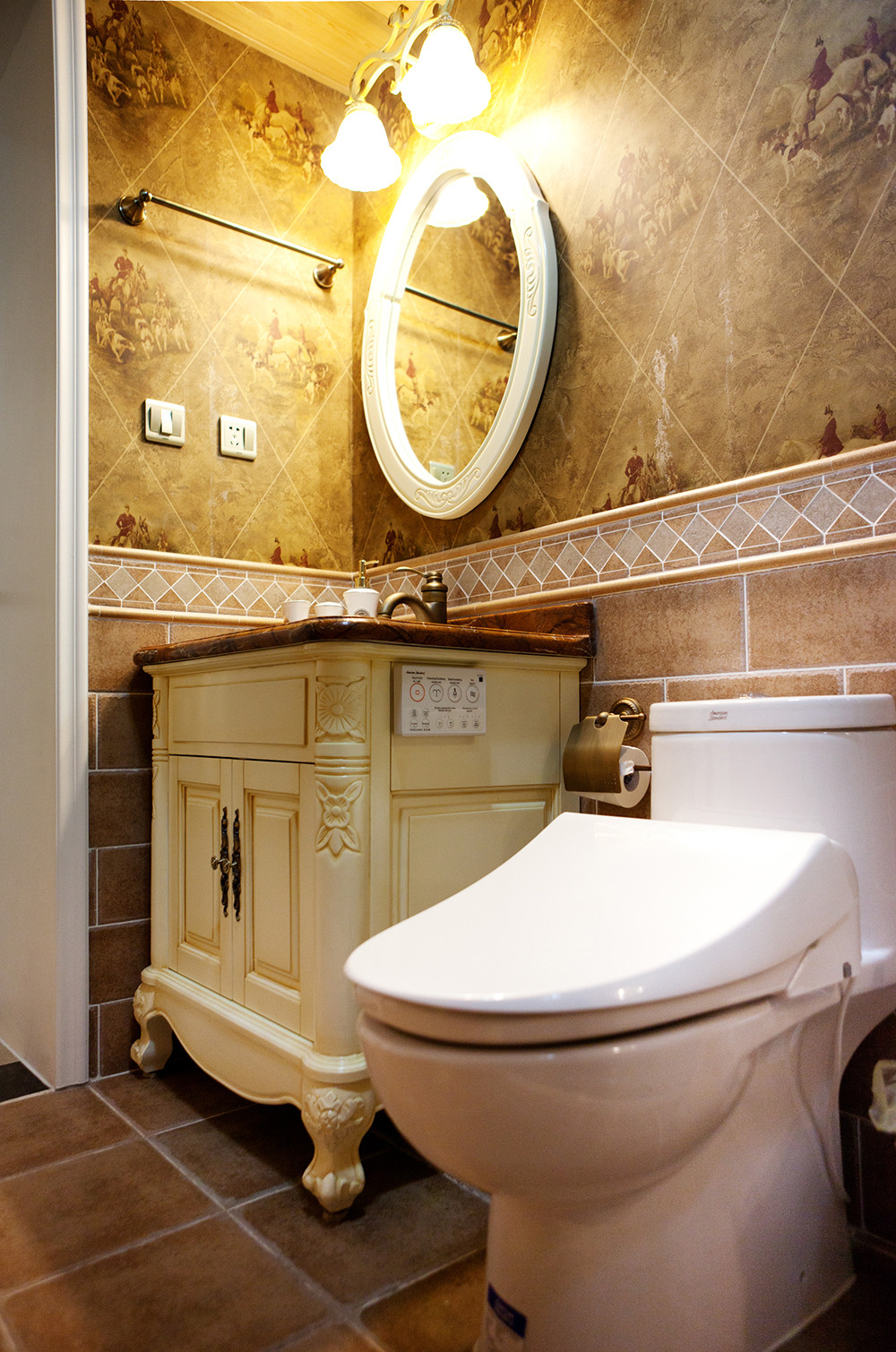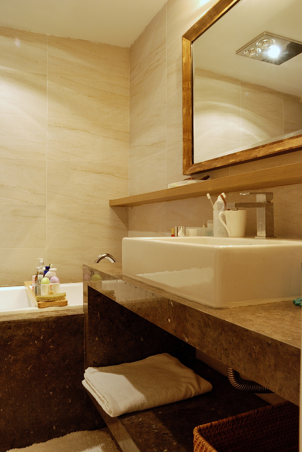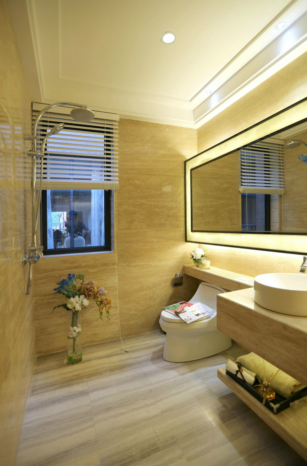 以明黄色的色调打造的卫生间,更显明亮温馨,在灯光的作用下,温和的氛围迎面而来,上厕所也是一件舒适的事情。