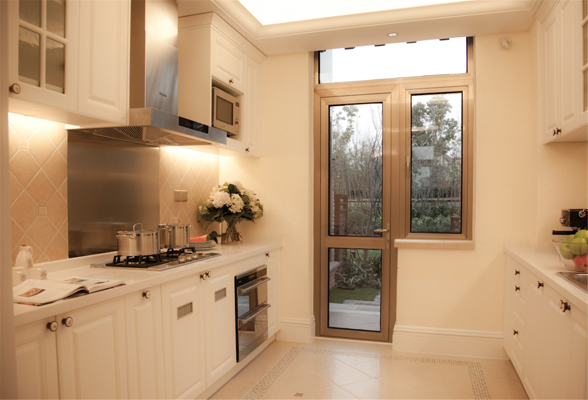 厨房的自然光线透过窗户舒缓地洒入厨房空间,烹饪用具根据平时使用习惯进行收纳。不拘一格的吊灯设计进行点缀,将纯粹的照明功能巧妙地转化为装饰的主角,赋予空间更多元的趣味性。
