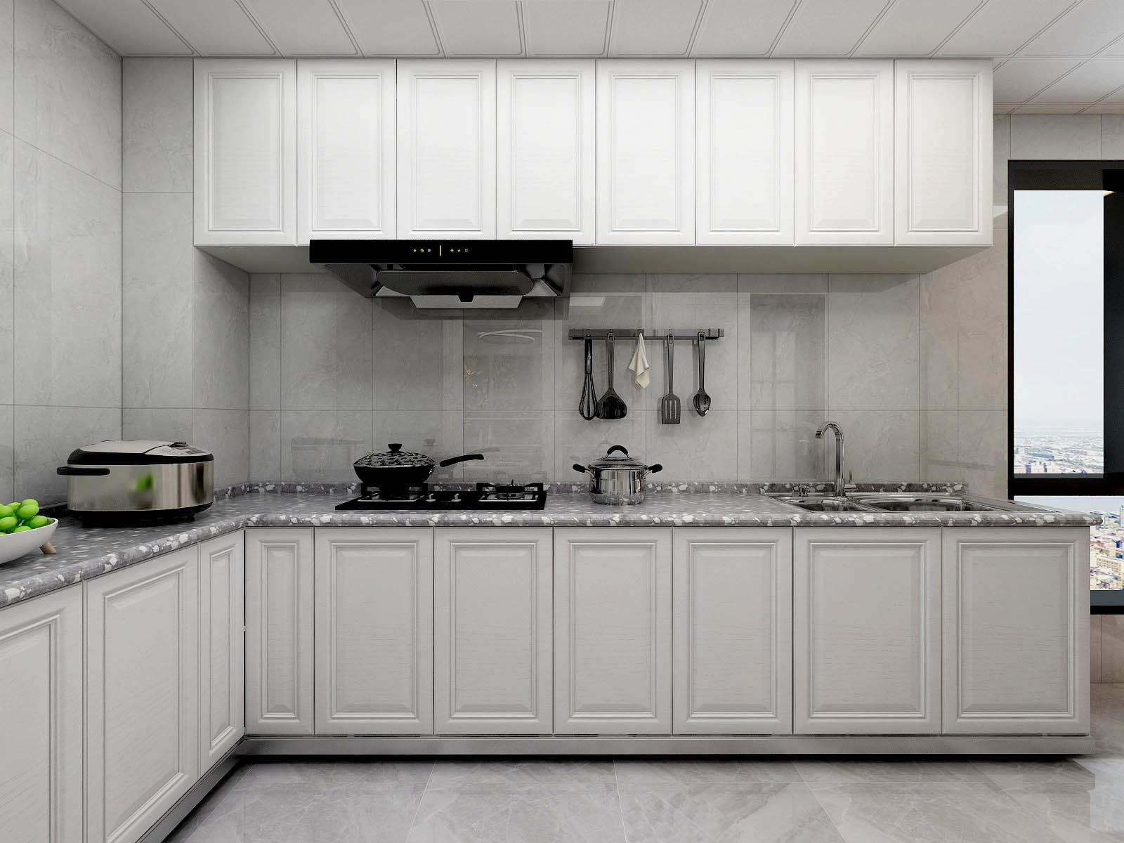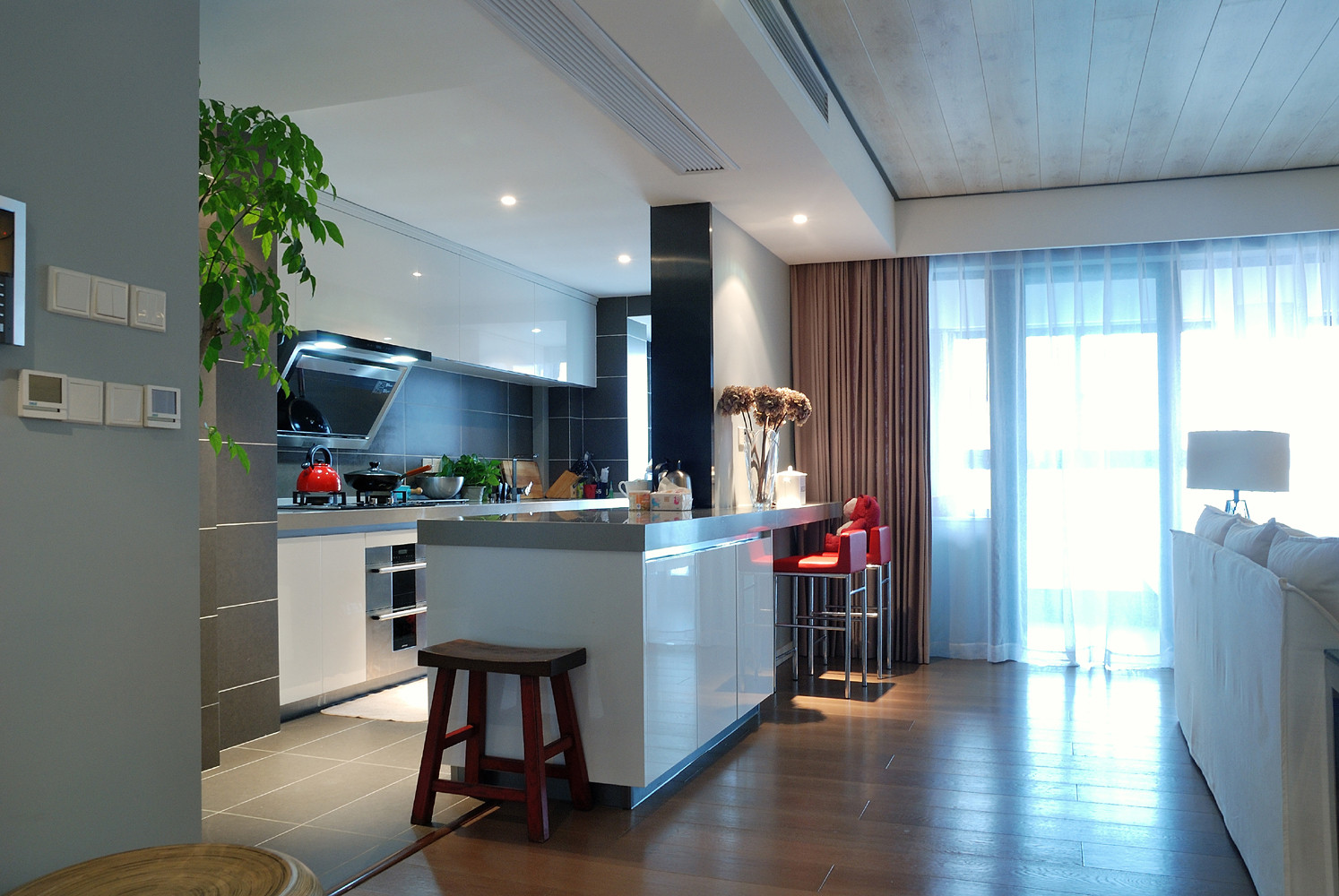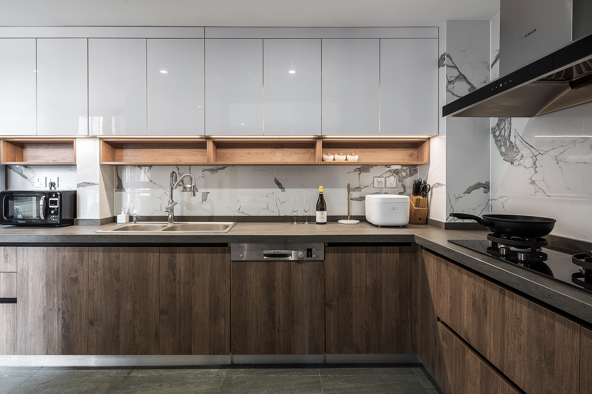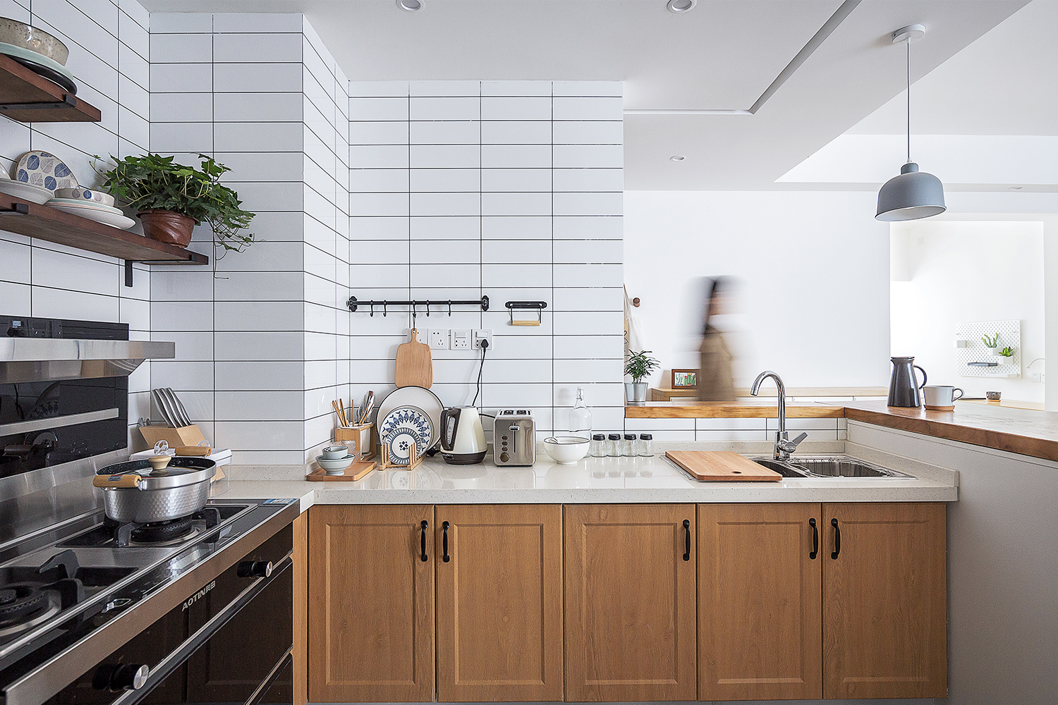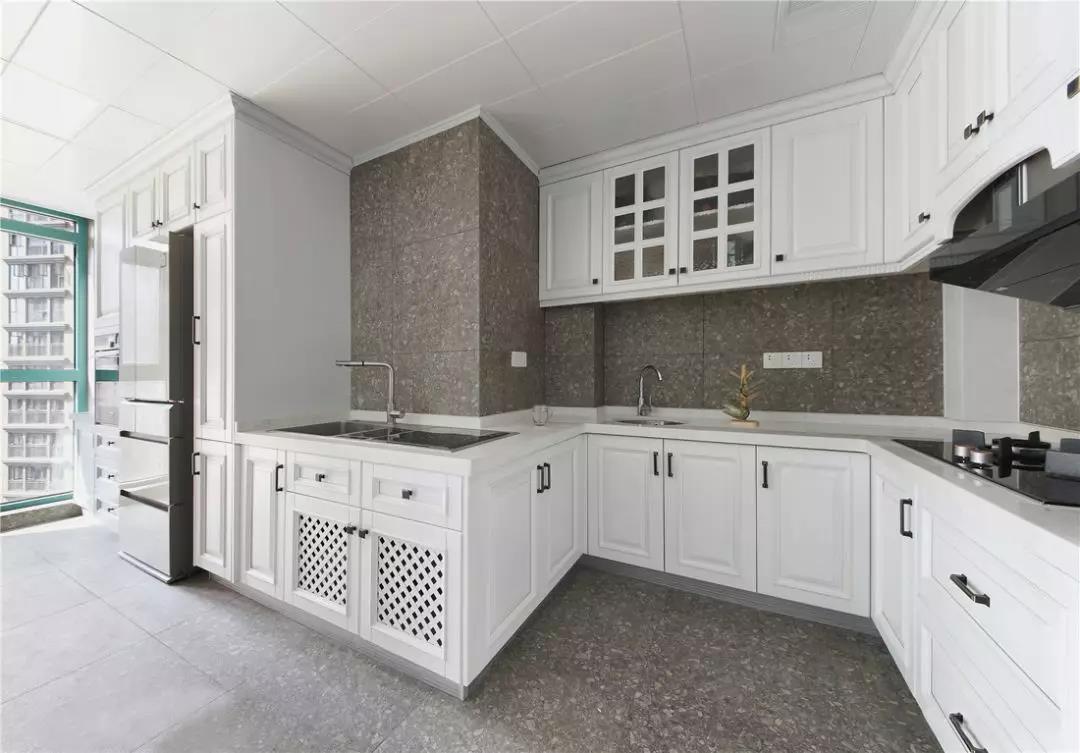 厨房设计了L型的橱柜,并且采用开放式的形式扩展了一些空间,把厨房做大。