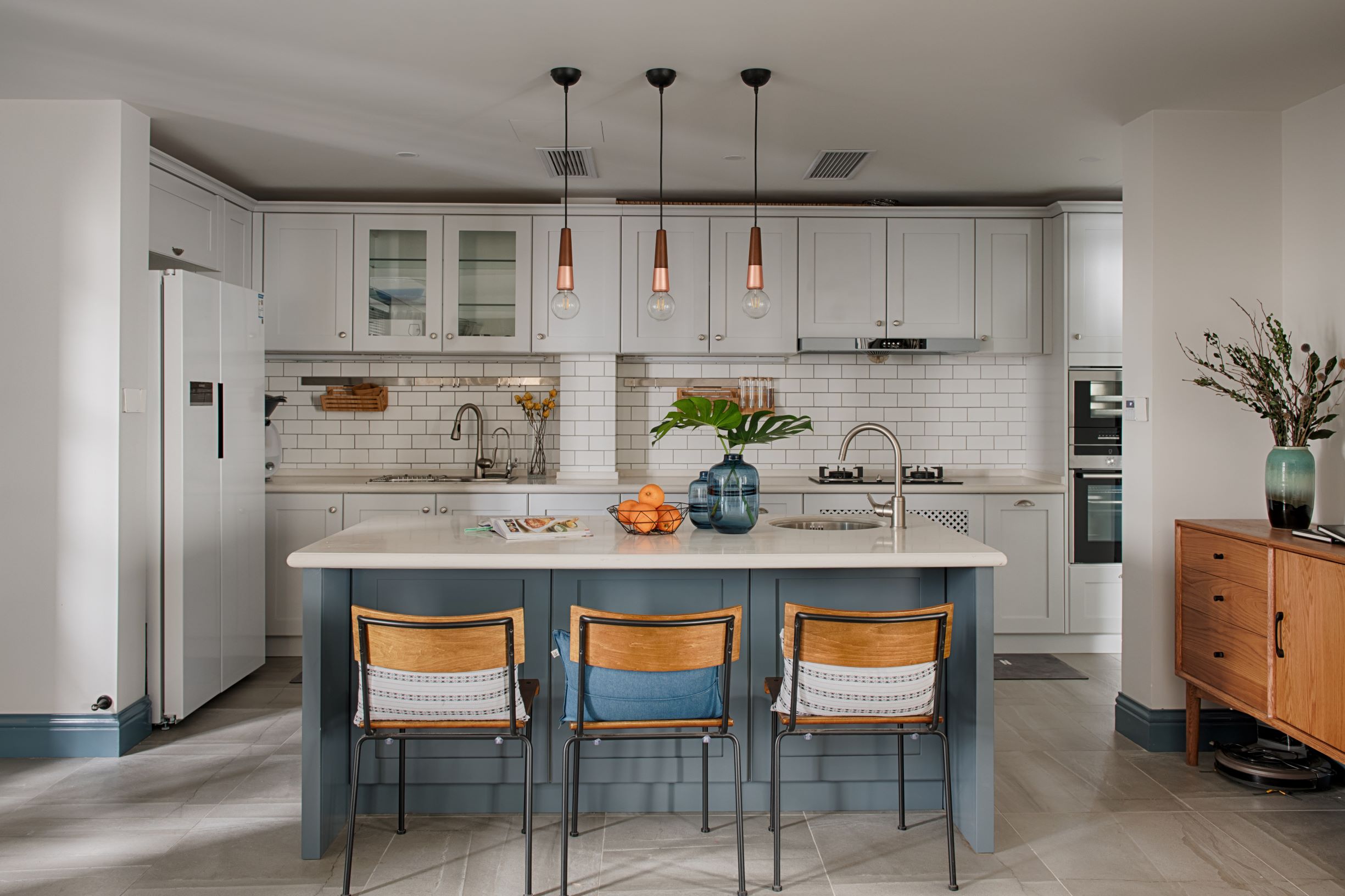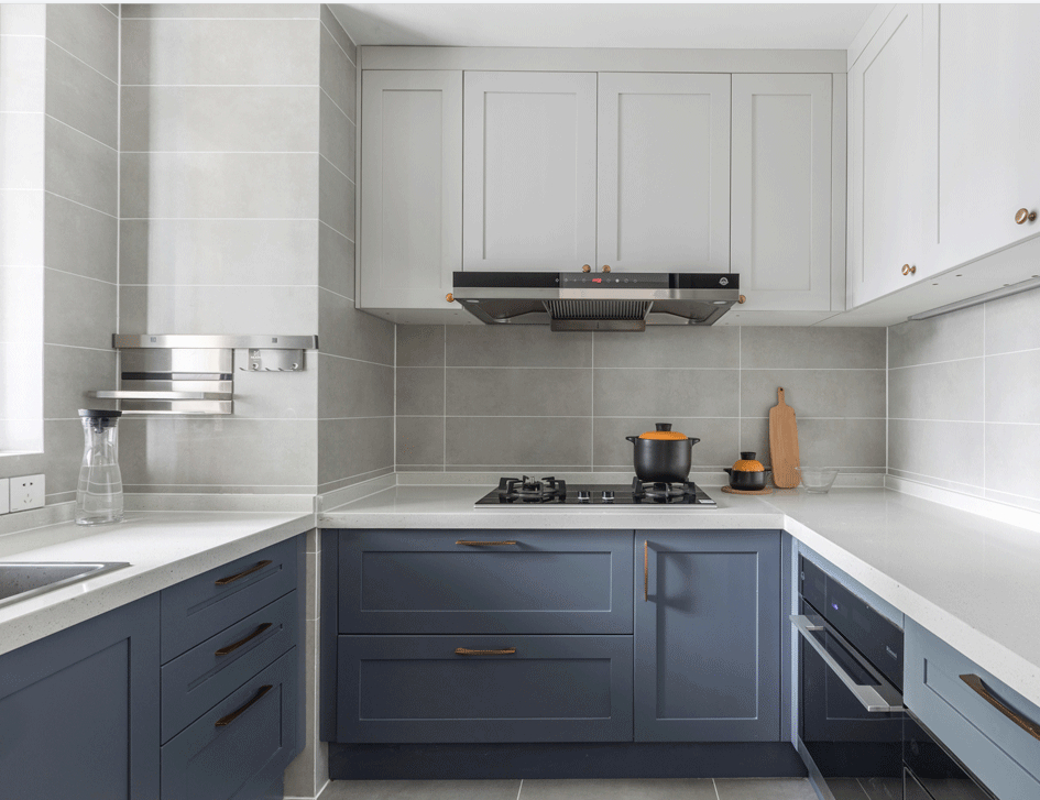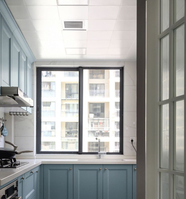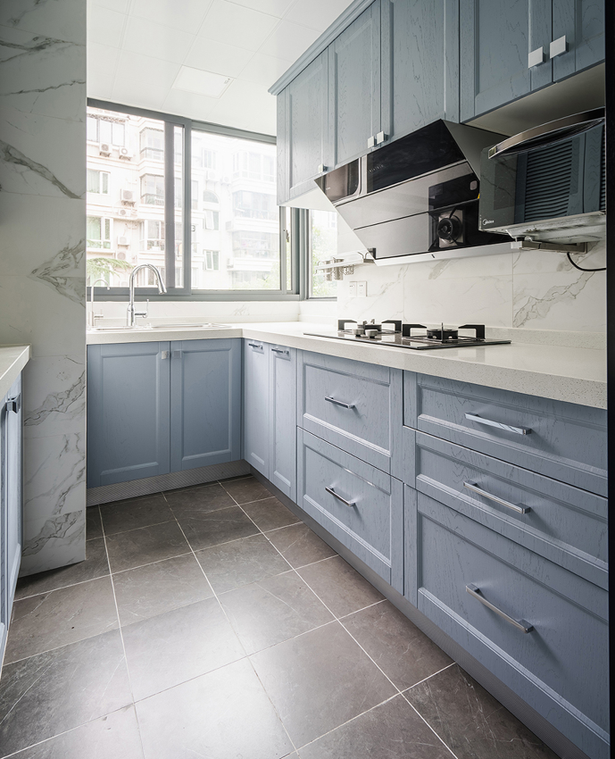 厨房以雾霾蓝为主色调,将欧式线条元素的精致感,与现代元素的时尚感相结合,运用白墙、多功能电器,营造了一个年轻时尚、高级有质感的空间。