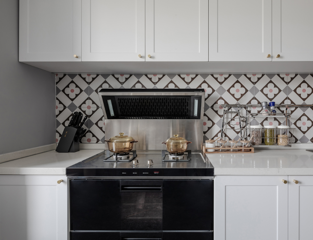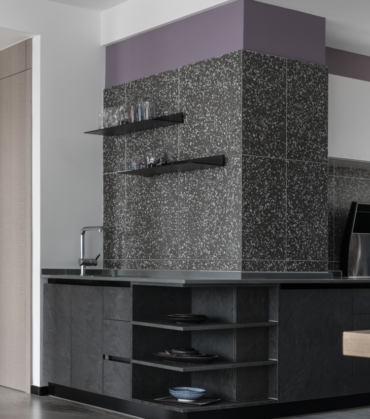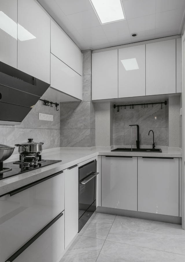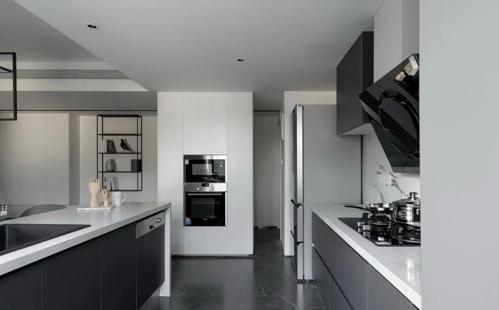 回字型开放式厨房,一如既往的经典风格,黑色岩板和白色台盆,完美搭配,简约耐看,满满的现代北欧风。