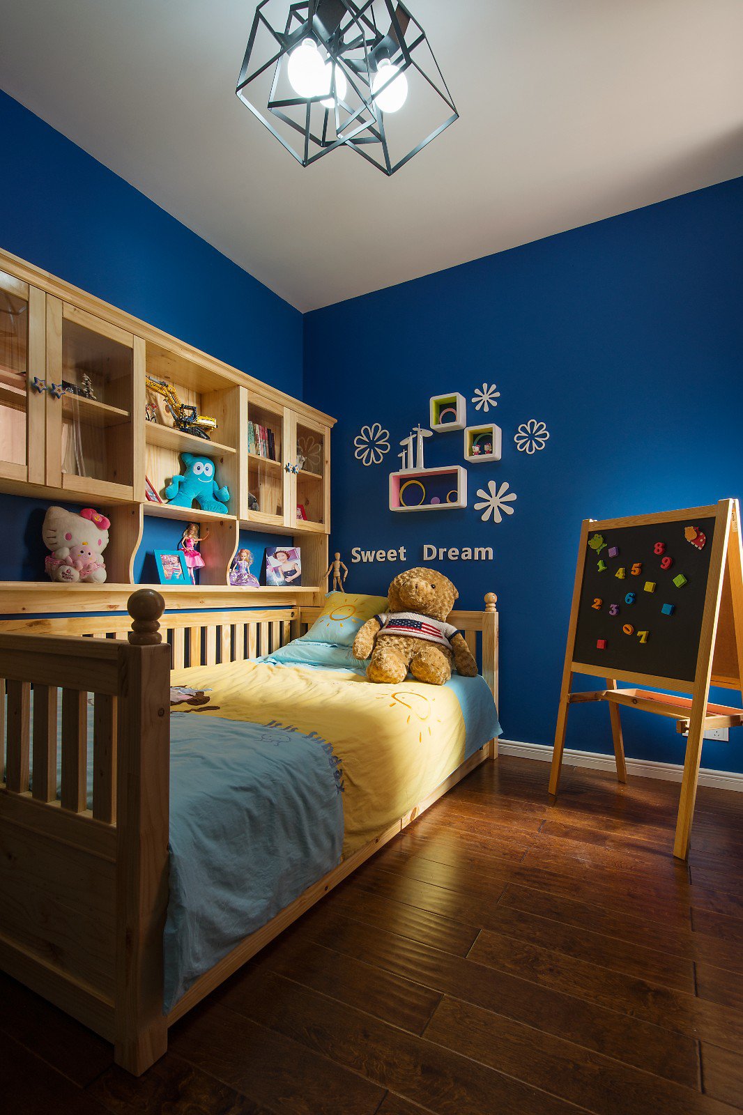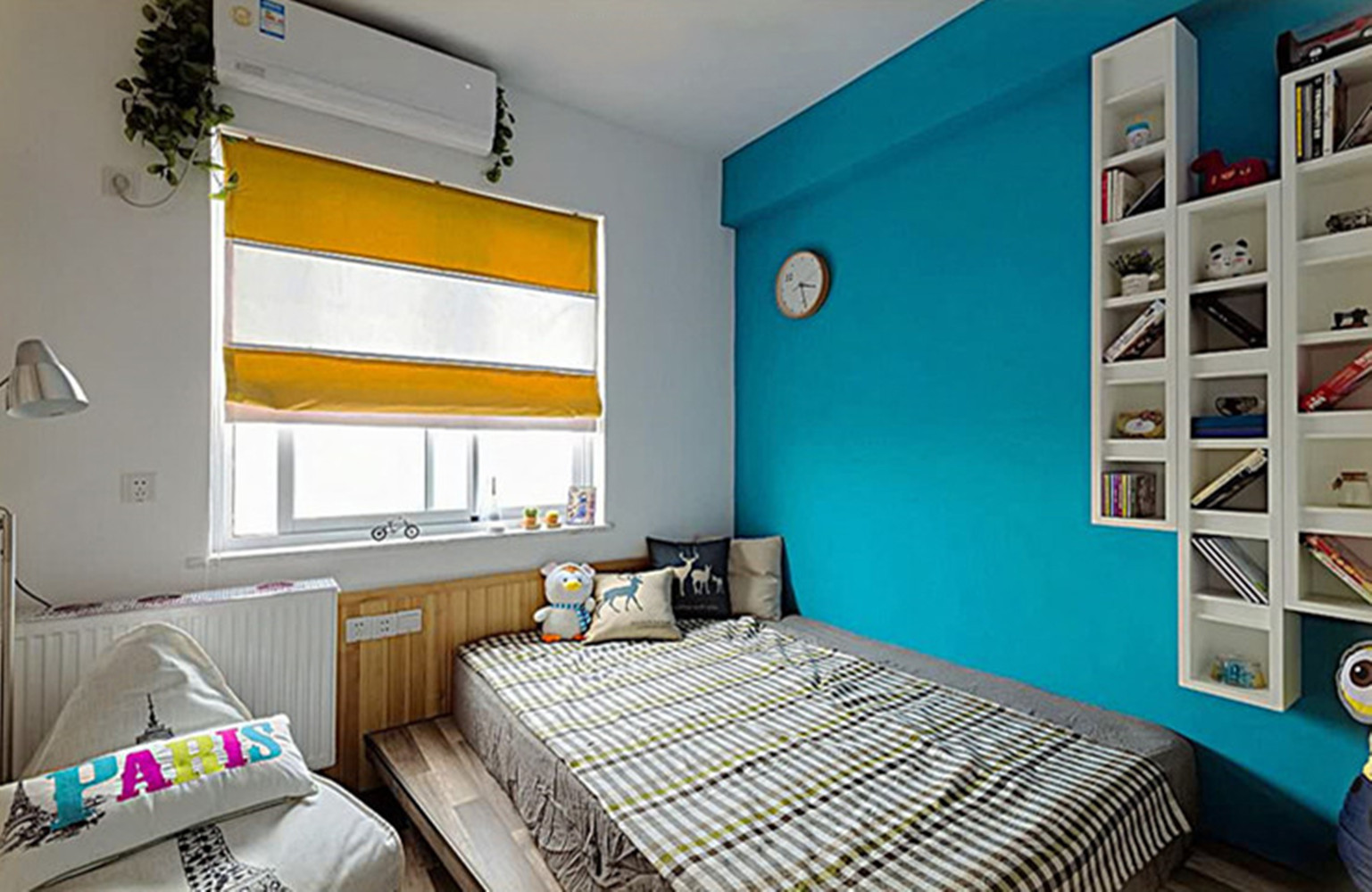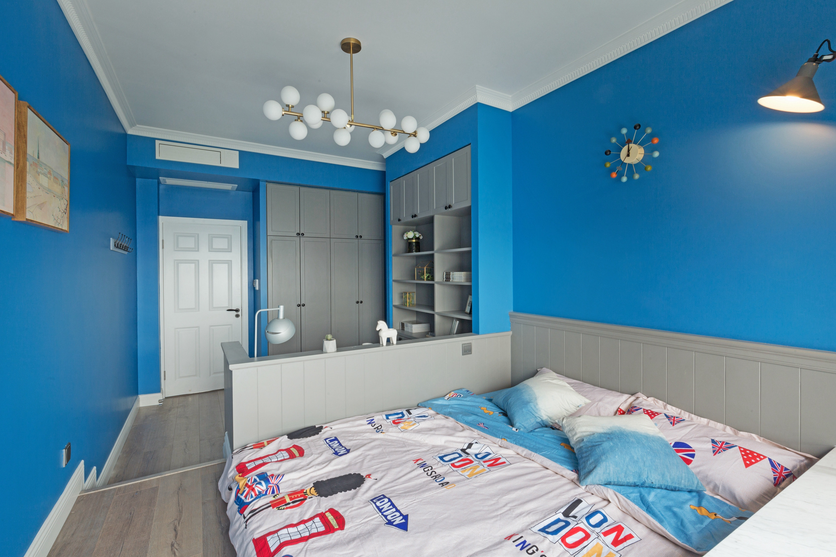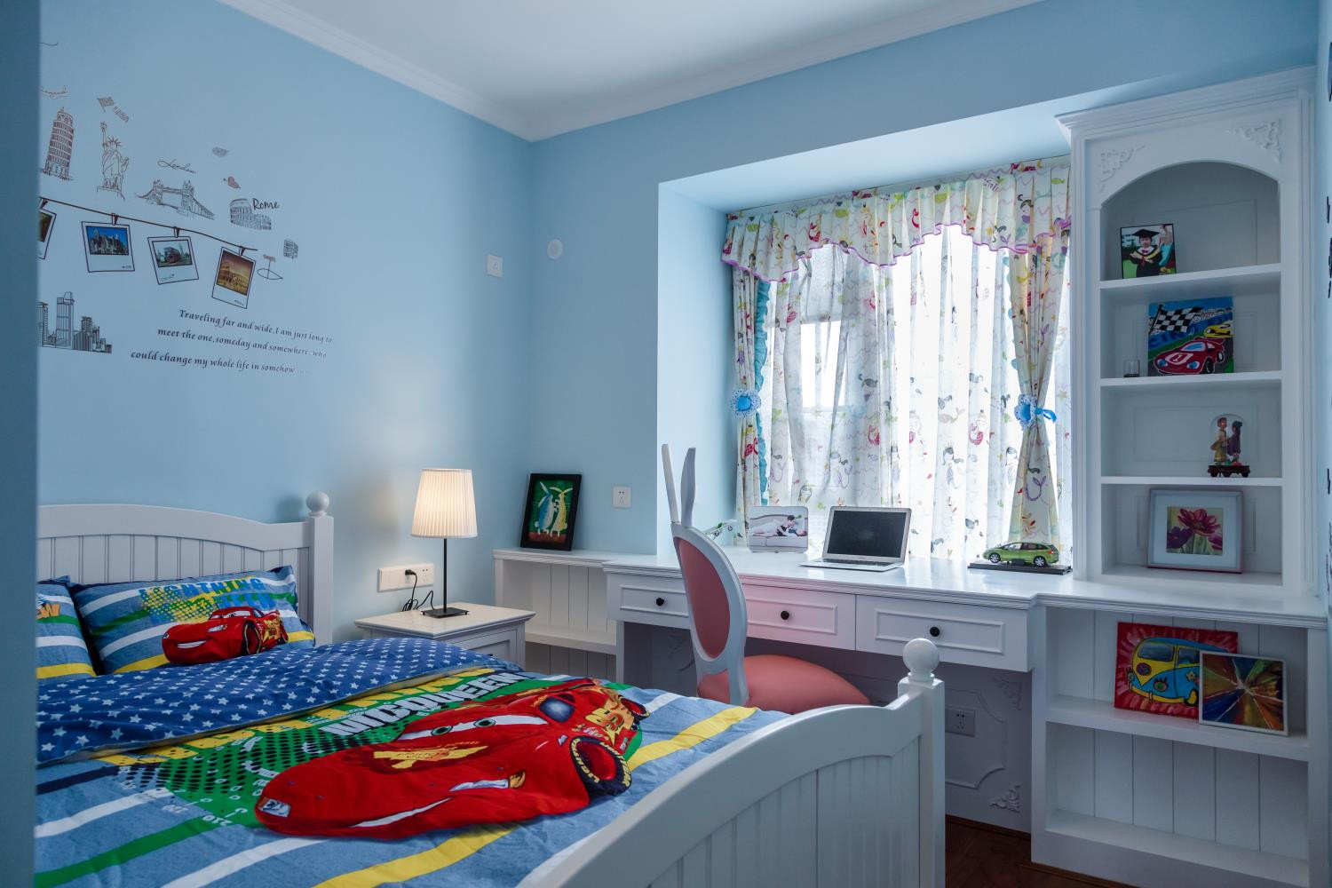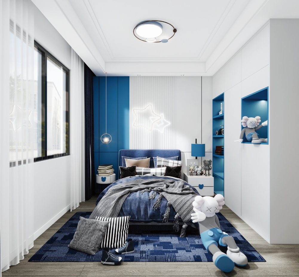 蓝白色调结合的儿童房,提高了空间的色彩饱和度,墙面采用书架设计, 方便孩子收纳学习用品、书籍和摆件等。