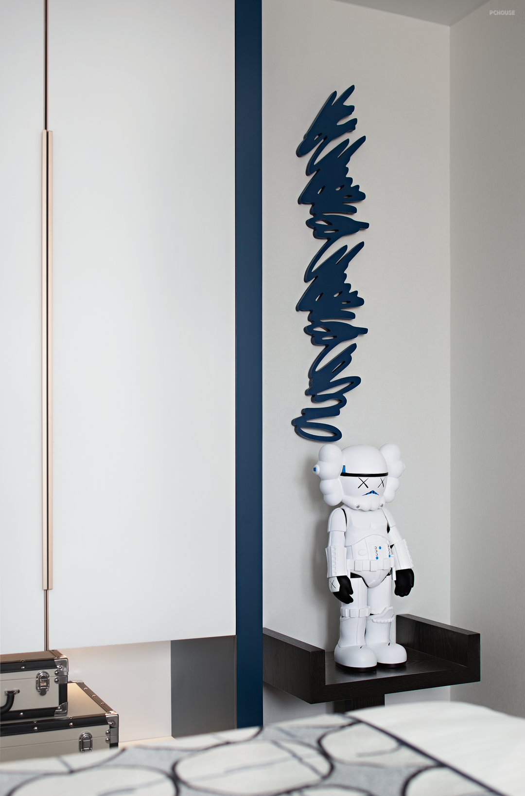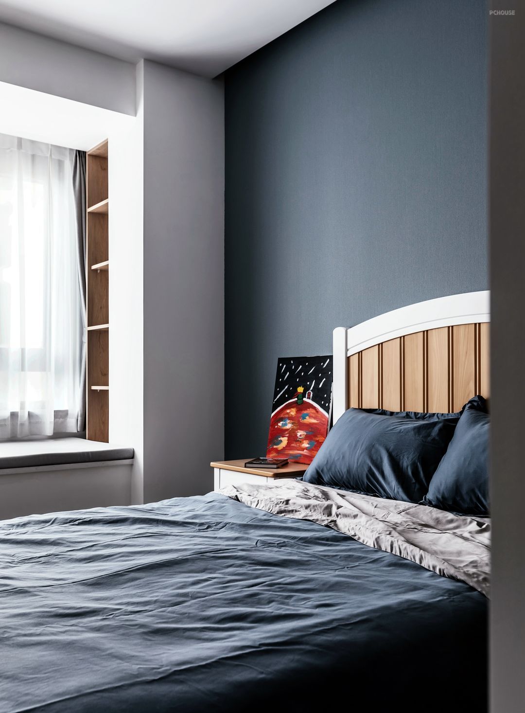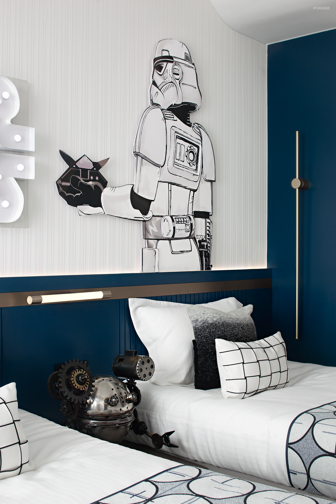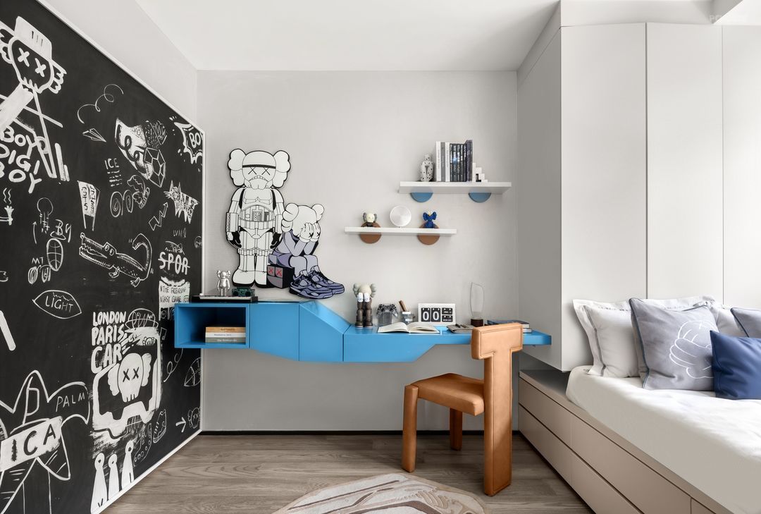 男孩子的房间以蓝色调为主,既点亮了整个空间,又添加了卡通英雄小摆件,用勇敢和英雄的卡通贴纸,为孩子营造一个梦幻的充满挑战的王国。