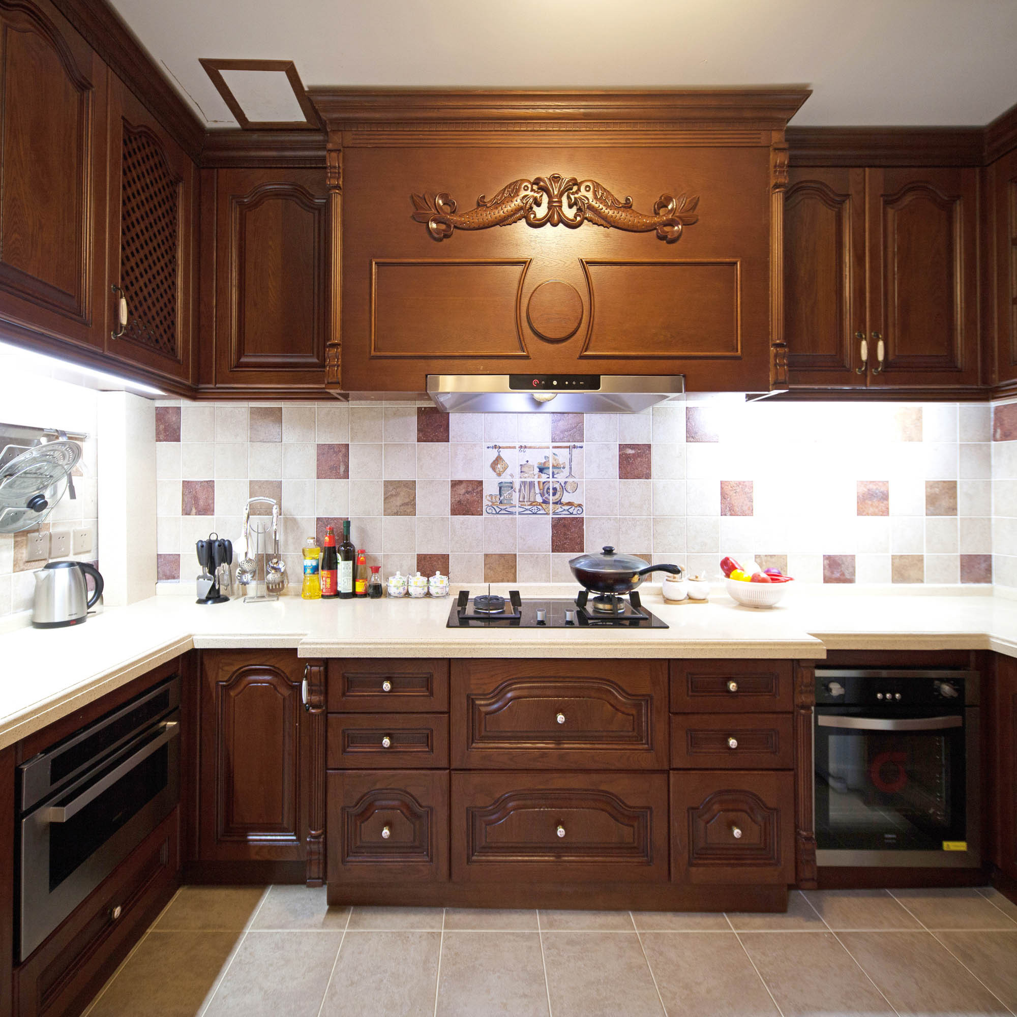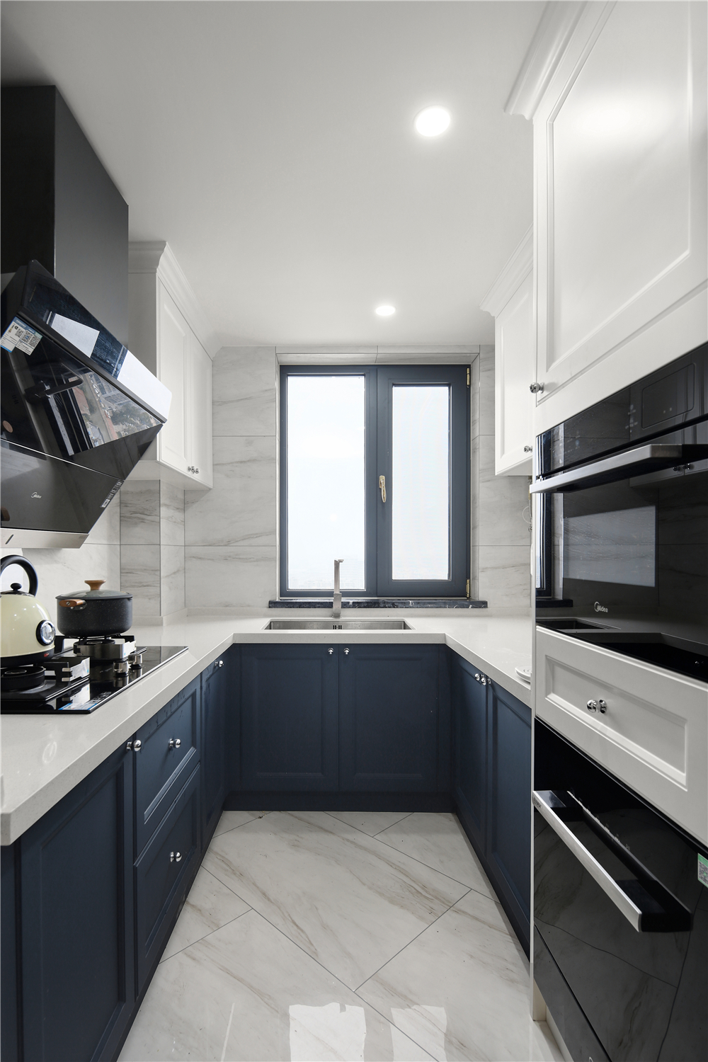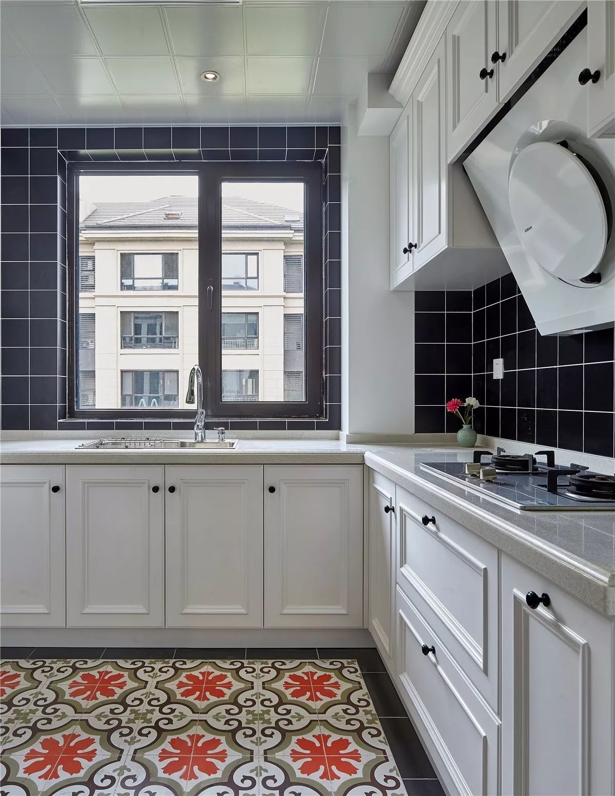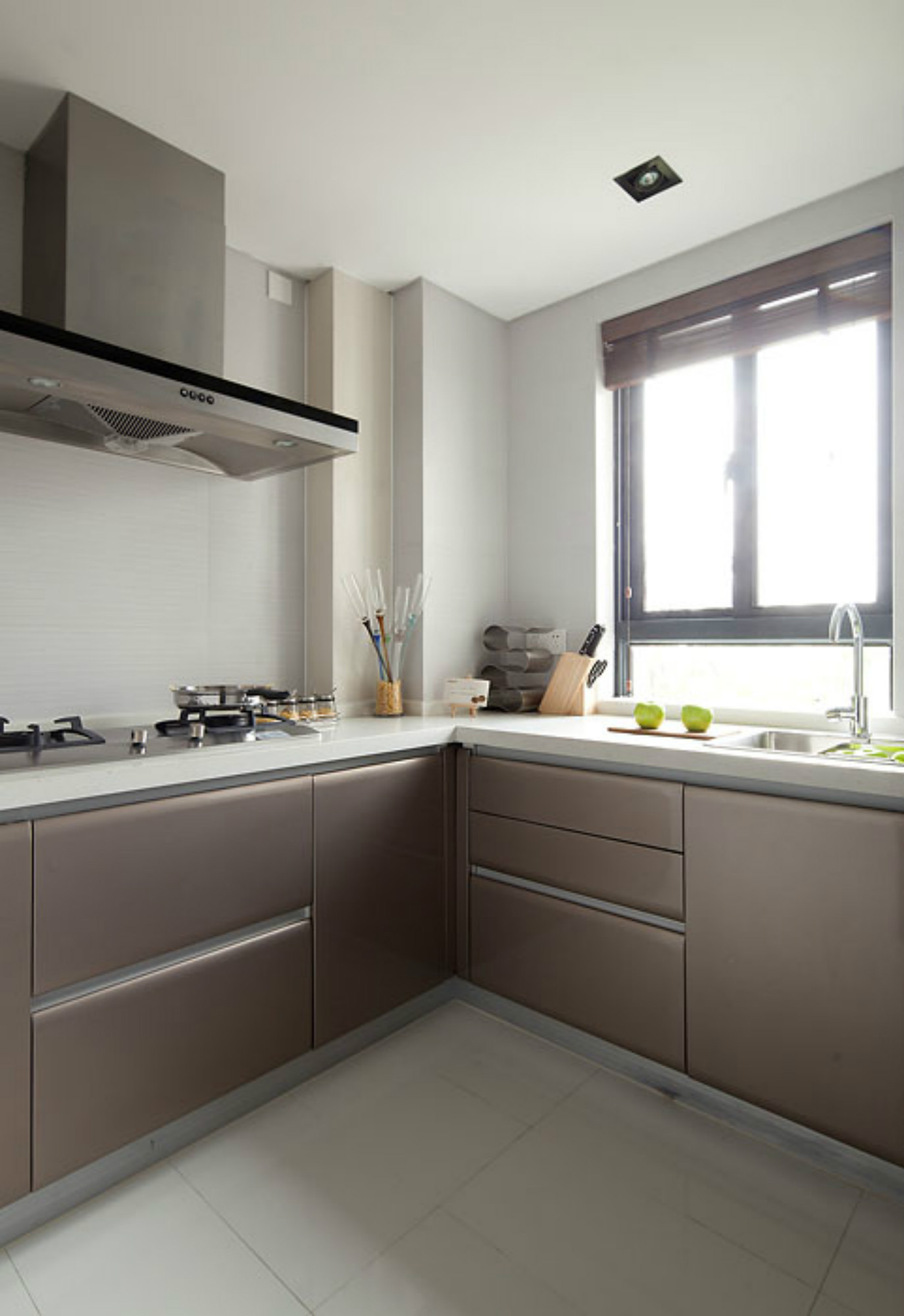 这款厨房装修采用了红色橱柜设计,柜面采用浅色大理石台面。红色让整个厨房充满着时尚与活力,让整体厨房产生一种清新与热情的碰撞