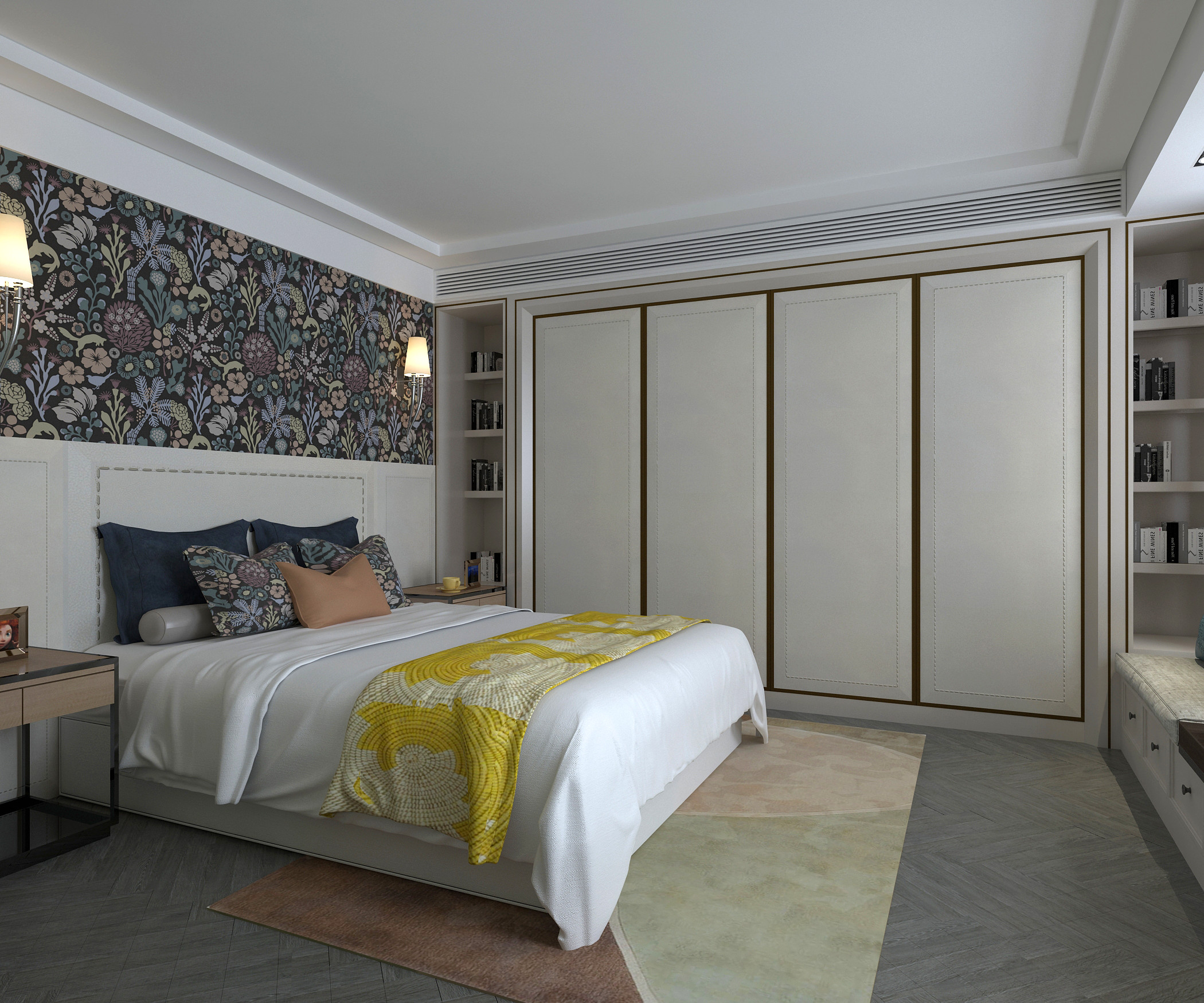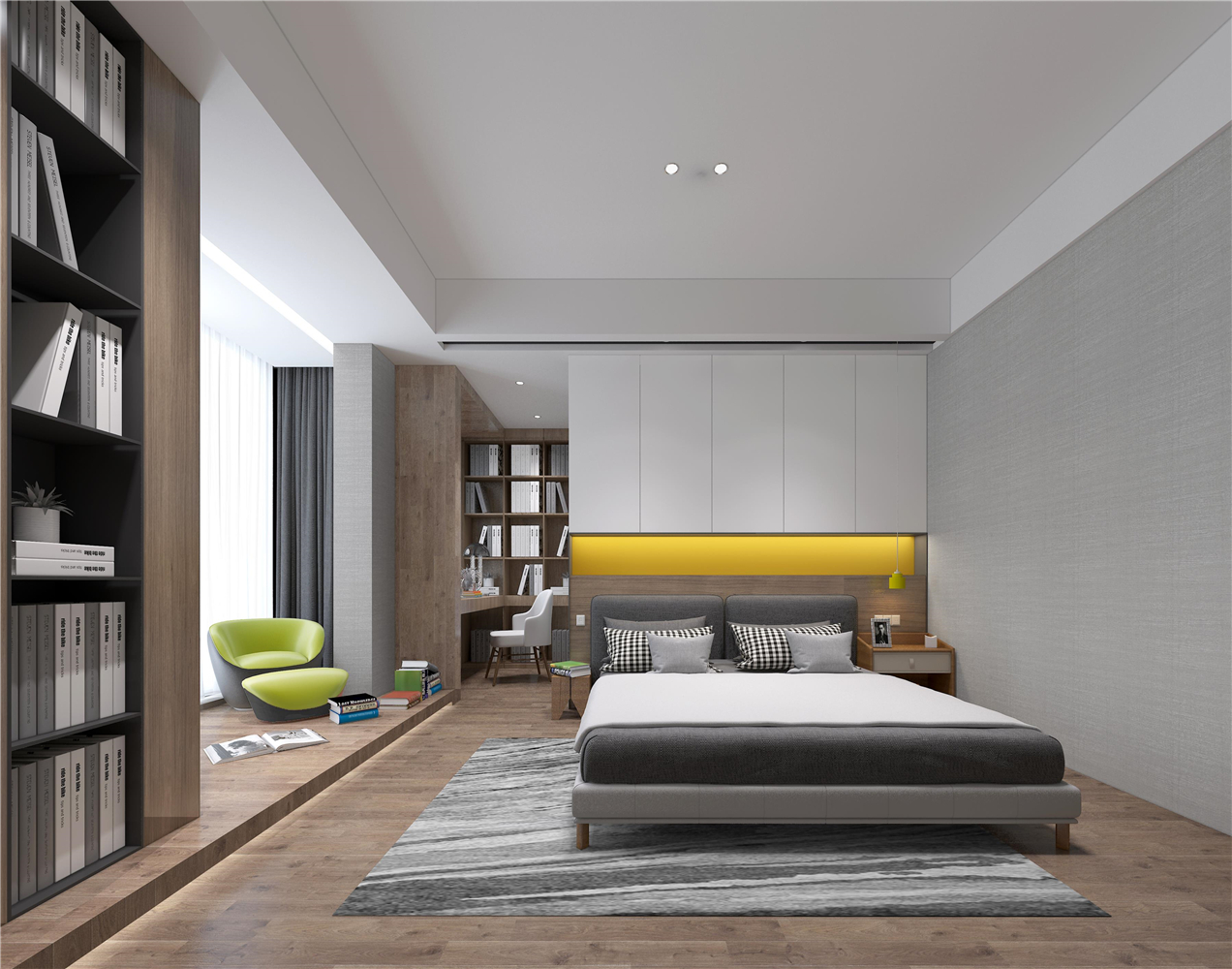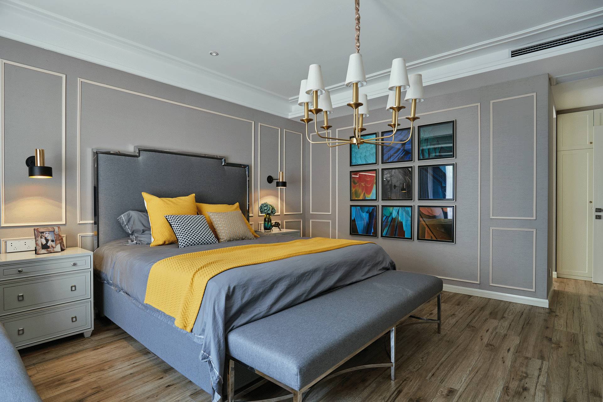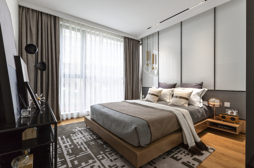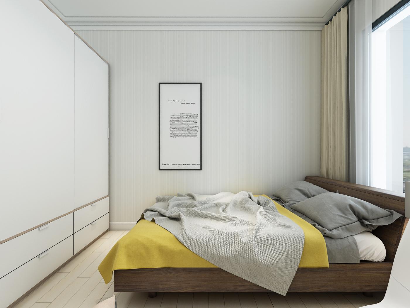 卧室的灰与黄搭配,属于明色与暗色的撞色,让空间中和起来,更显简约高级感,也显得房间更大更明亮。