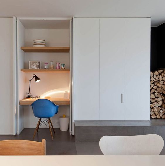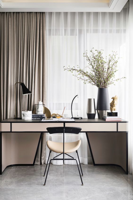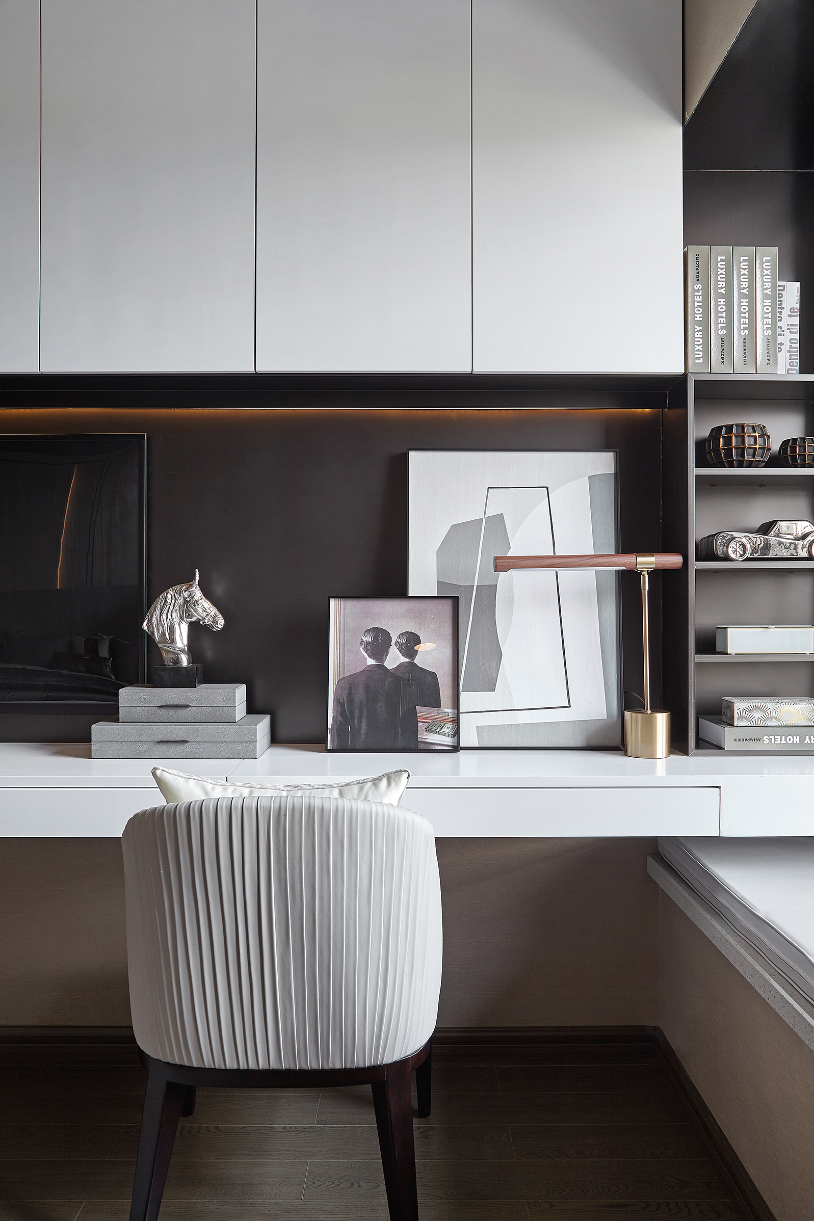 写字台通常应该与窗户成直角而设,这样的自然光线角度比较适宜。另外,尽量不要选用太亮的灯具,可以考虑使用一些辅助光源