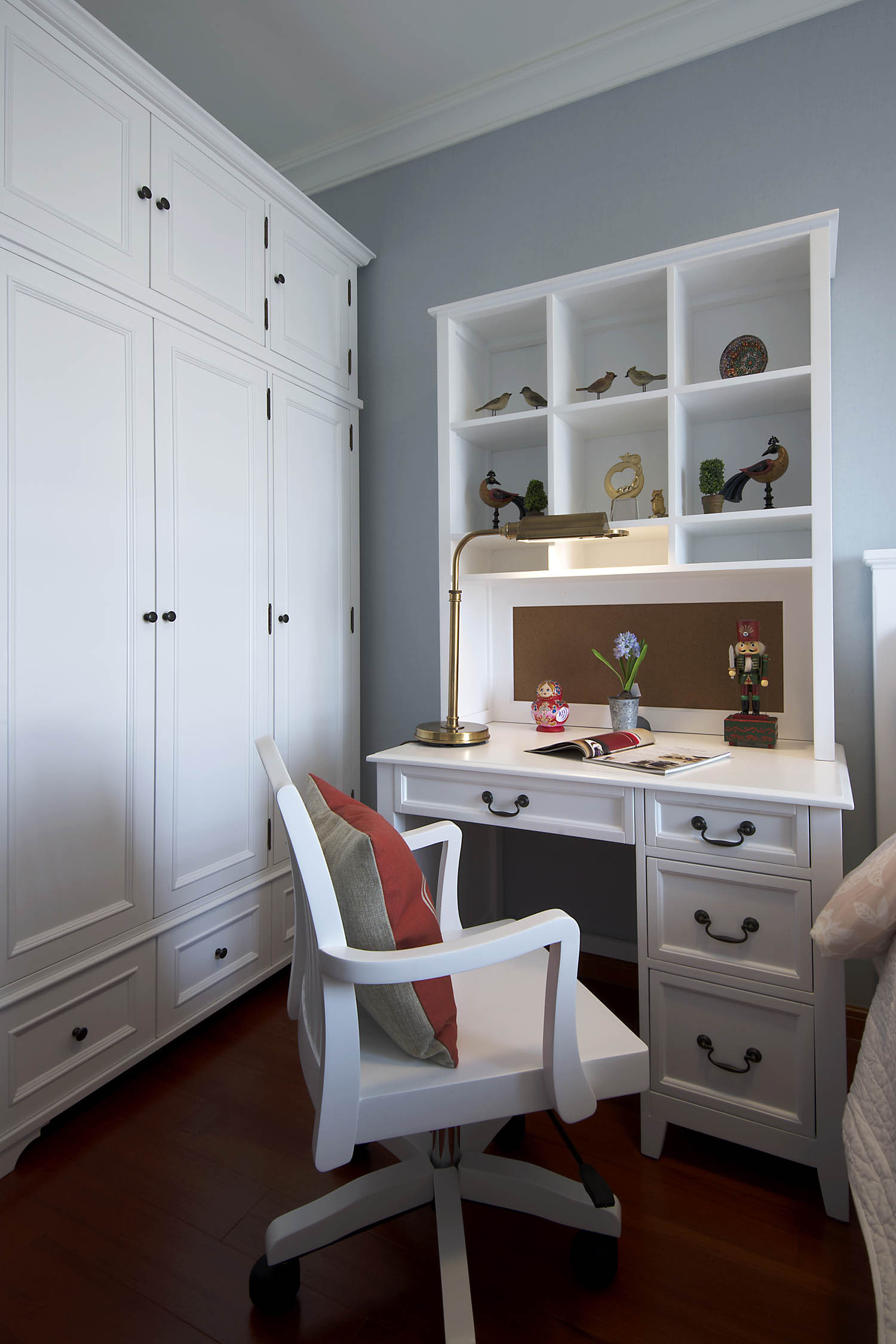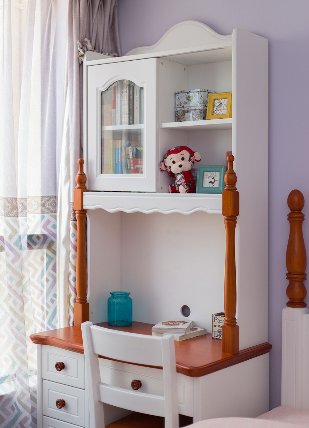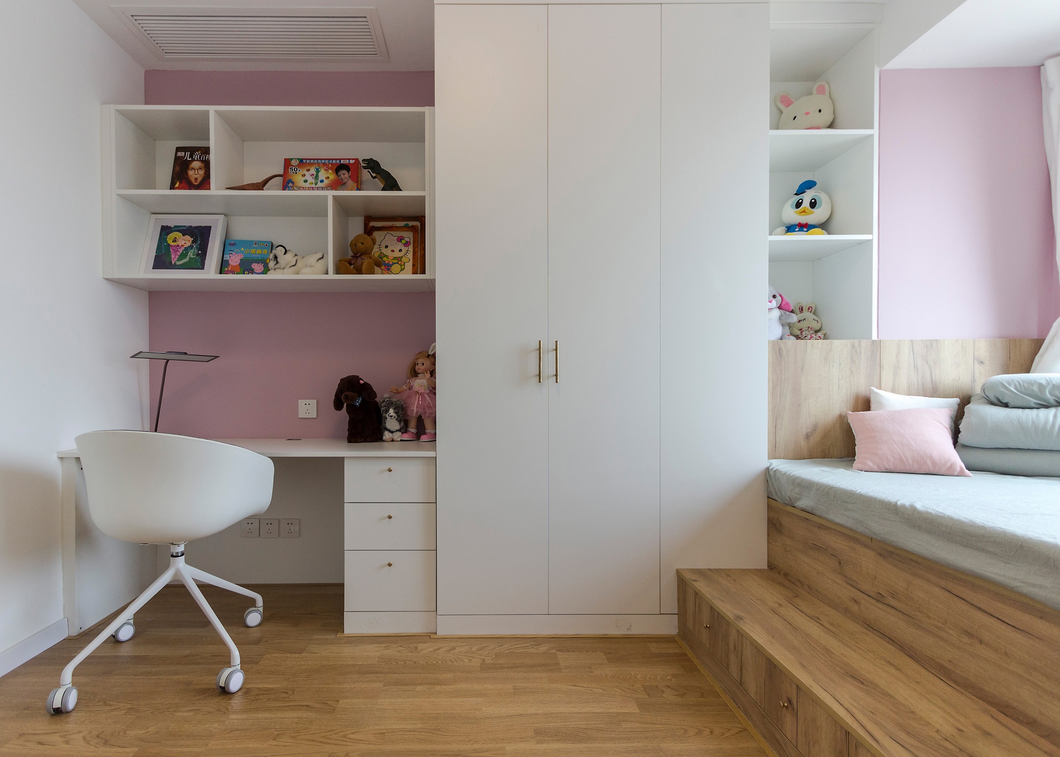 儿童房空间小,采用白色的小柜体设计,帮助孩子学会管理自己的小物品,学会收纳和分类,既实用又美观,墙上书架的设计也合理地向上利用空间。