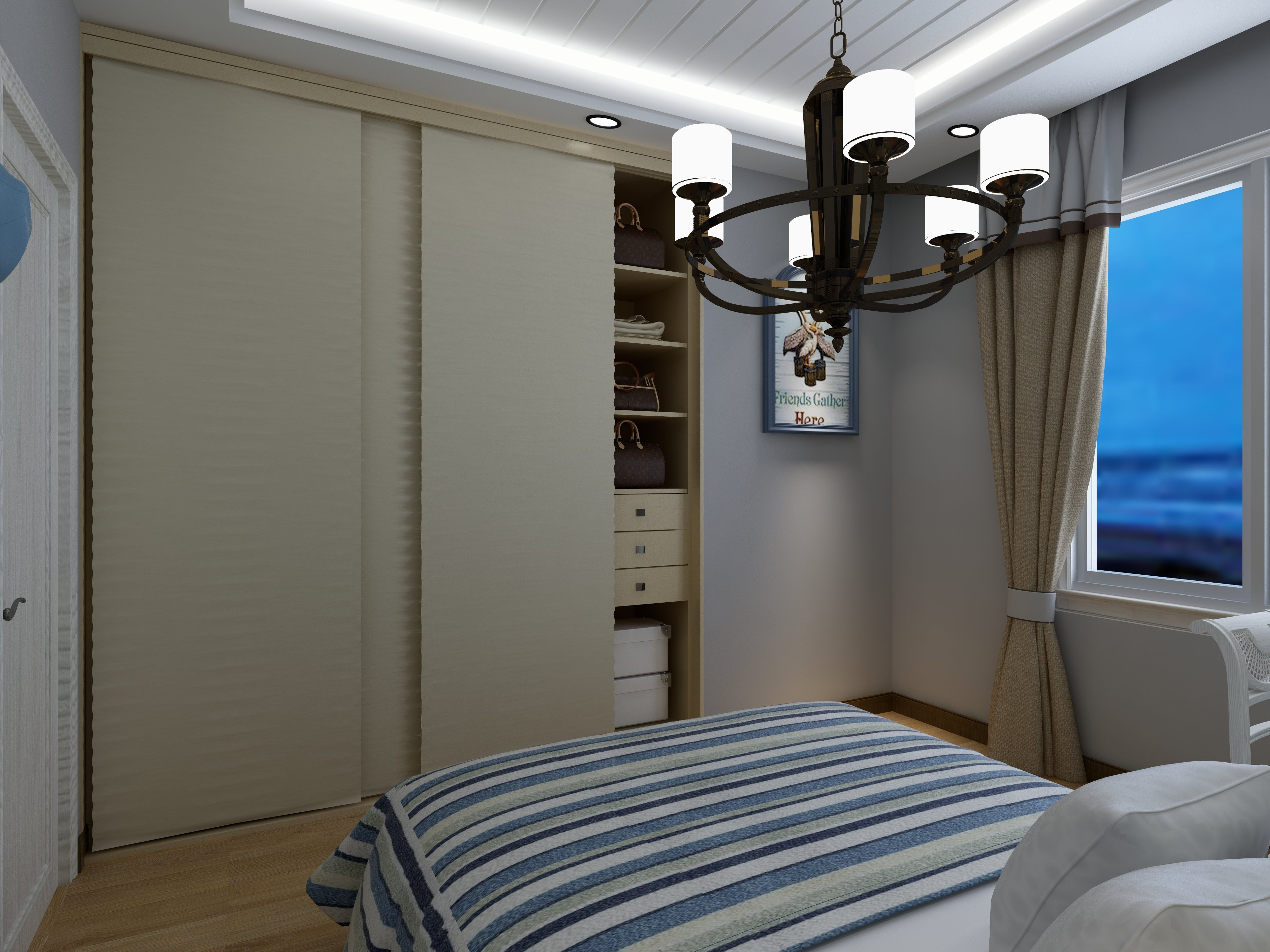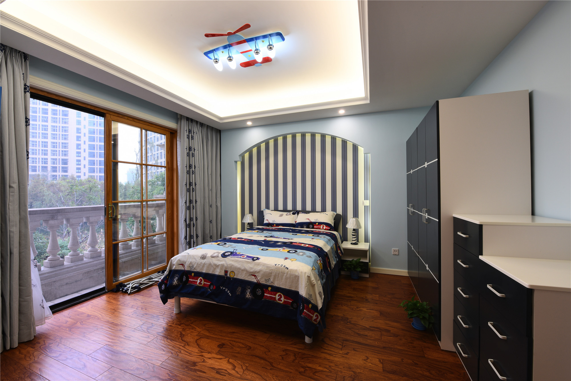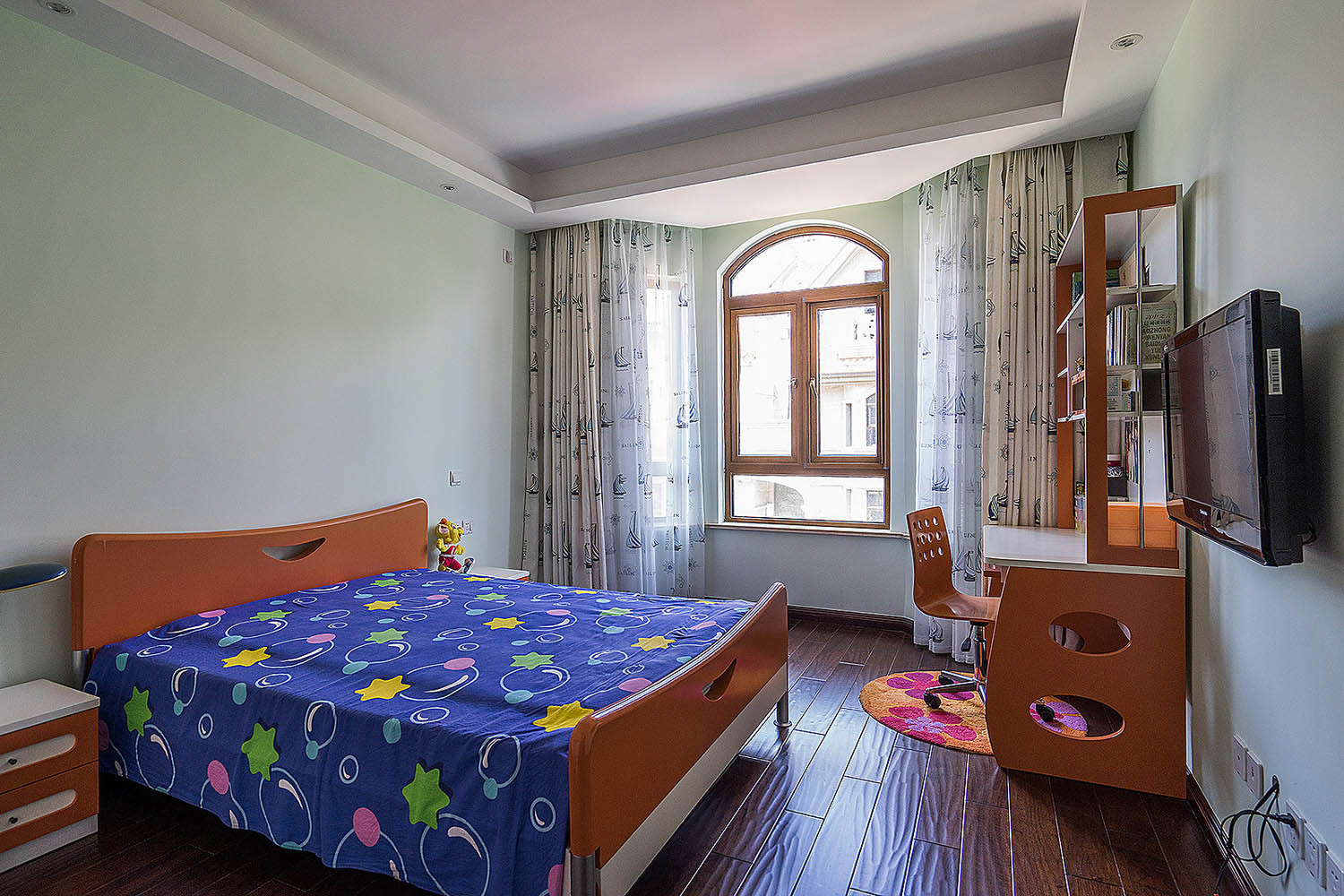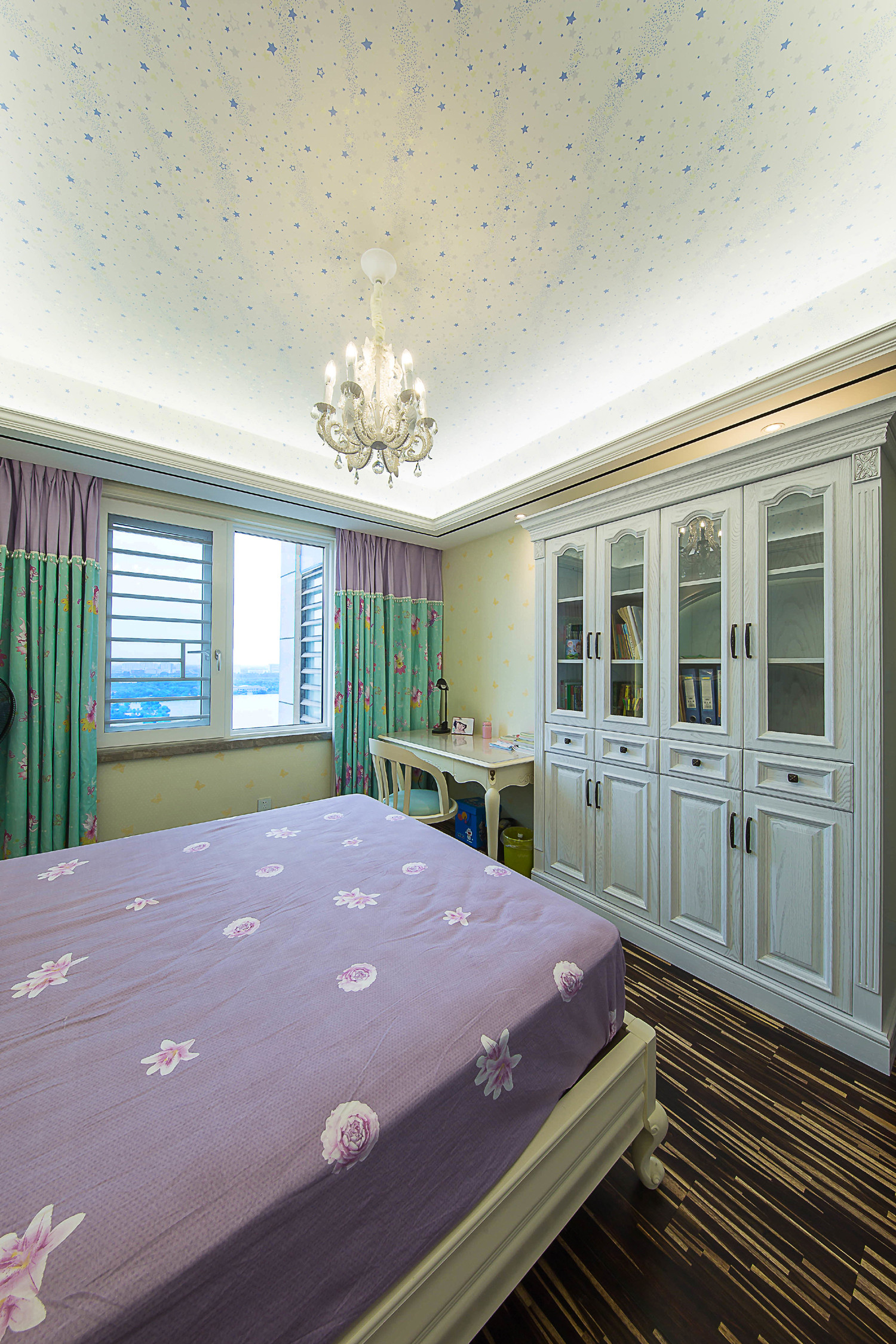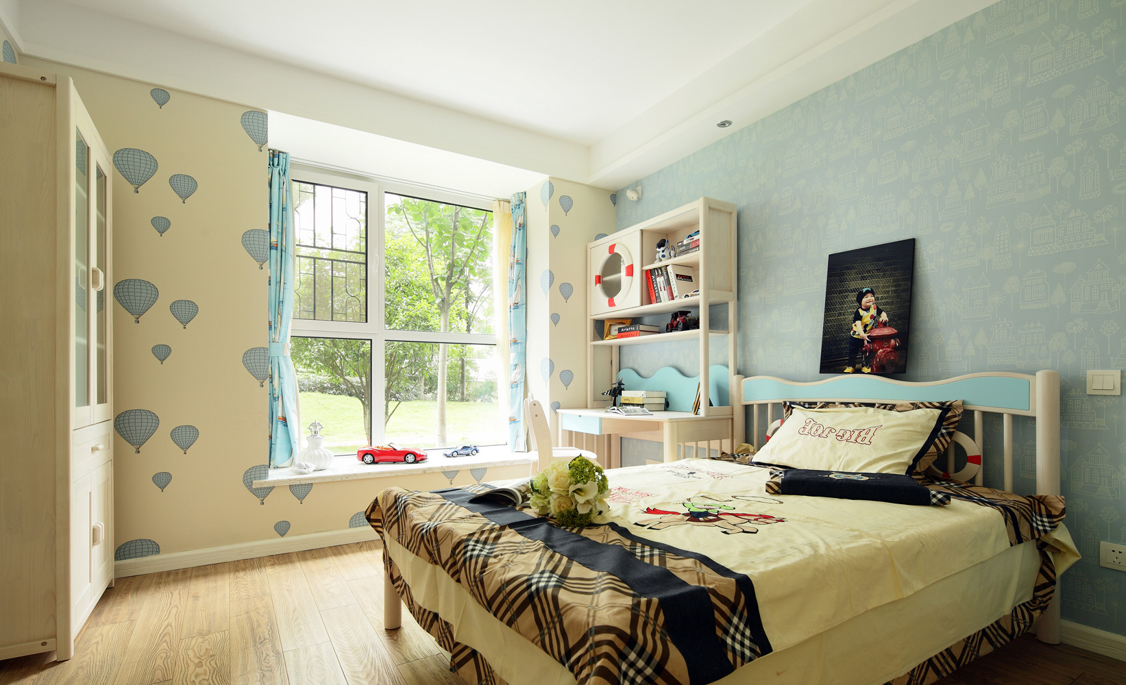 在儿童房的一面墙上,我们设计了一个可开可合的窗户,主要是方便儿童房的采光,同时也给封闭的空间,增加一些趣味与通透的可变性。