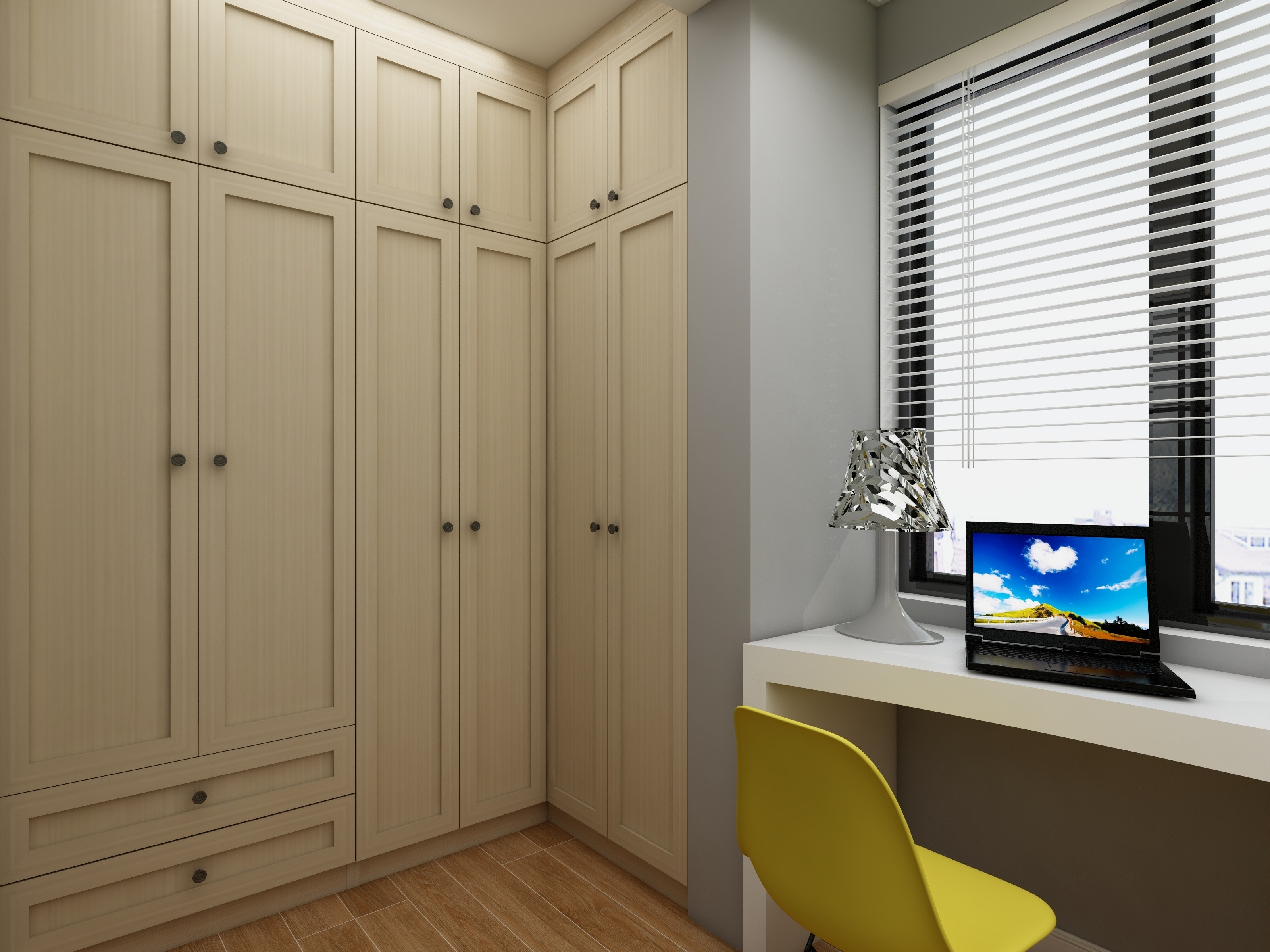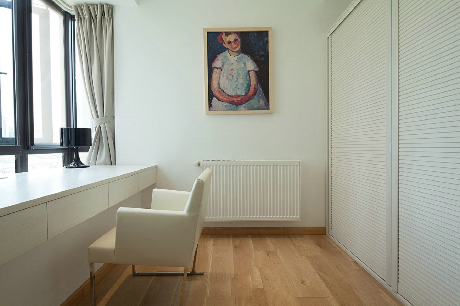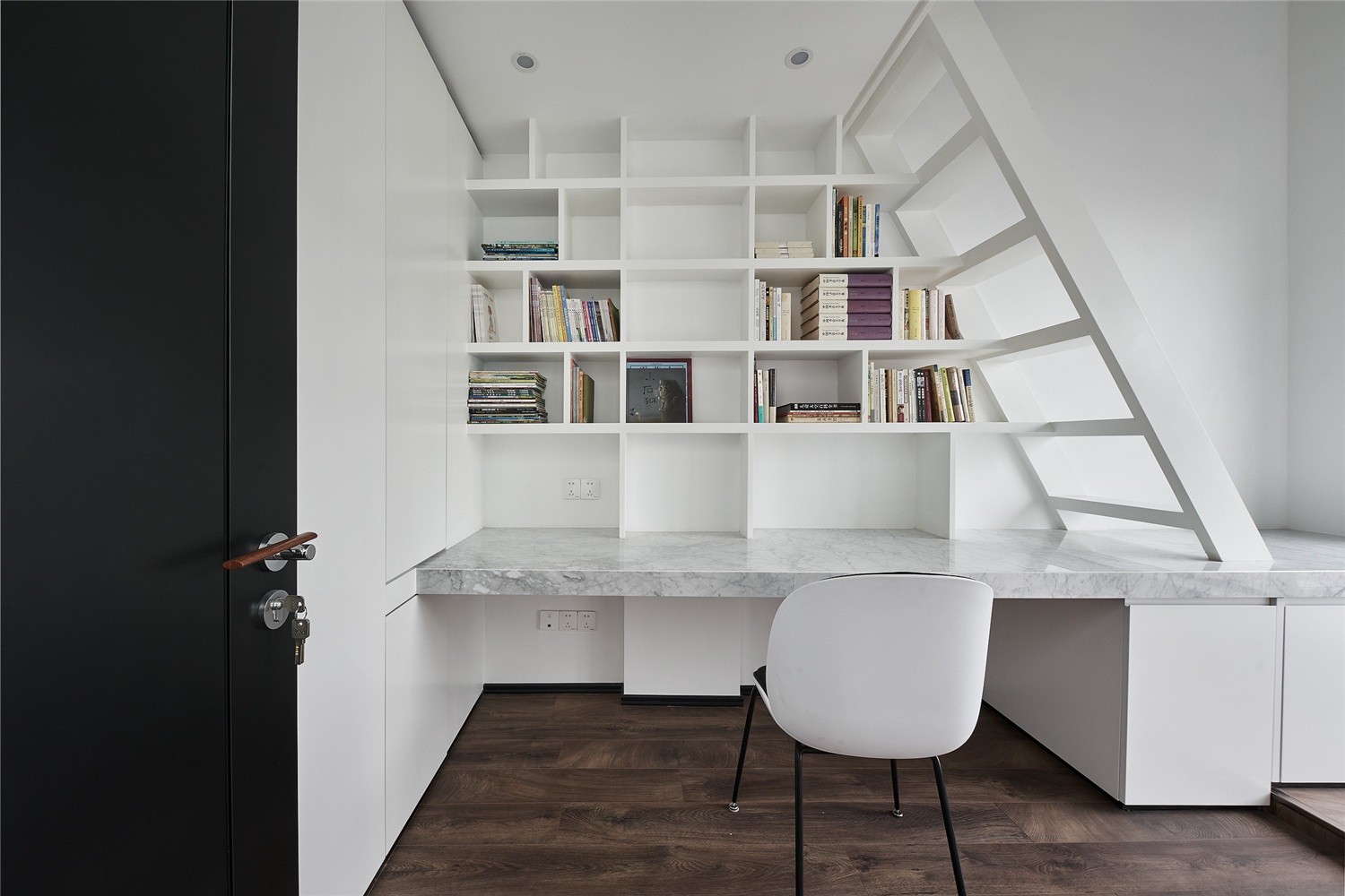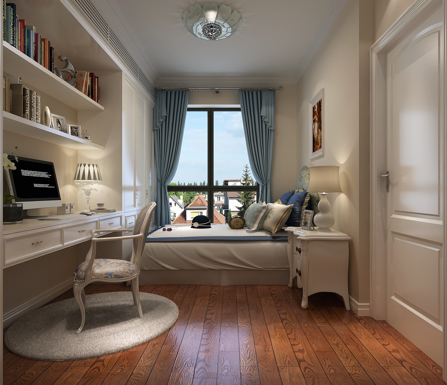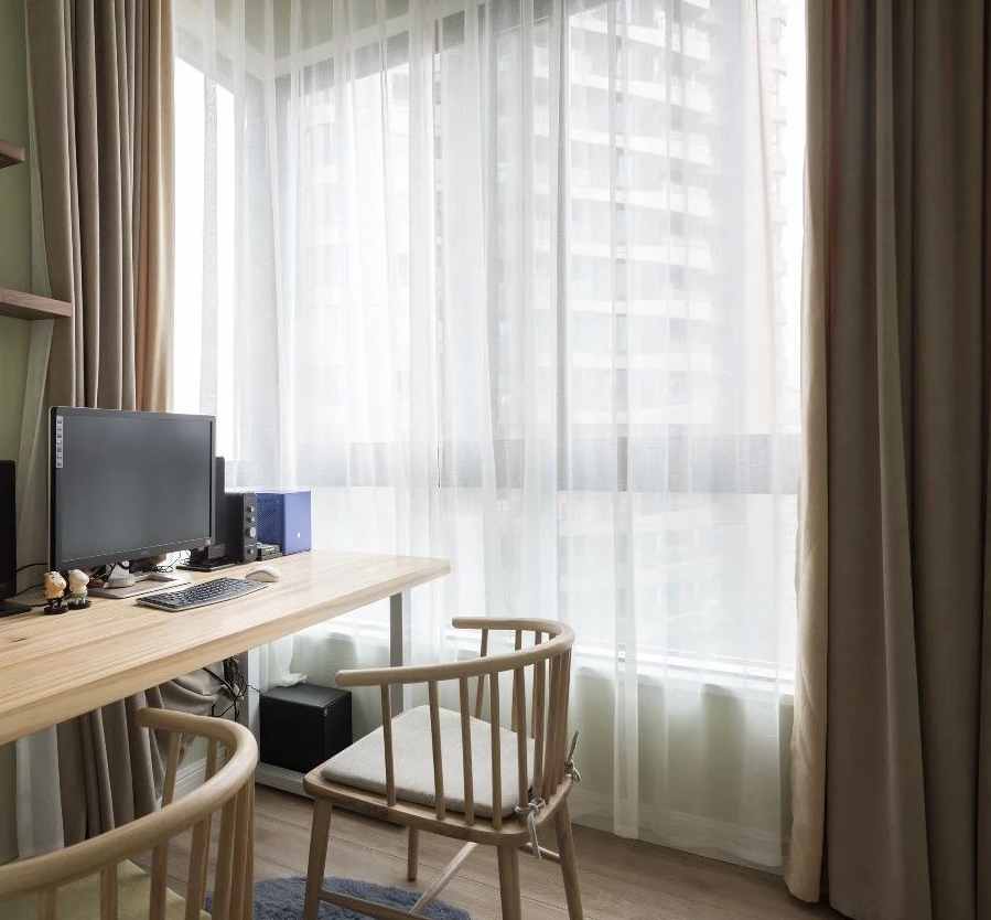 在儿童房靠近窗户的一侧,设计了一个长方形书桌,白天在这里学习可以有充足的自然光。这么长的学习桌主要是供后期父母陪同孩子学习的使用。家长的陪伴,对于儿童来说是多么的重要!