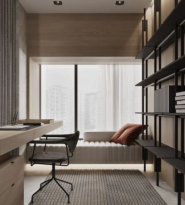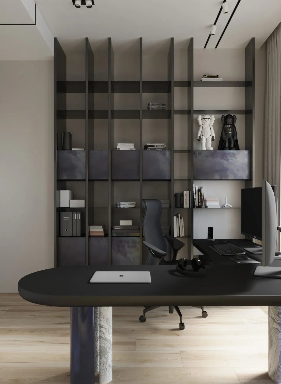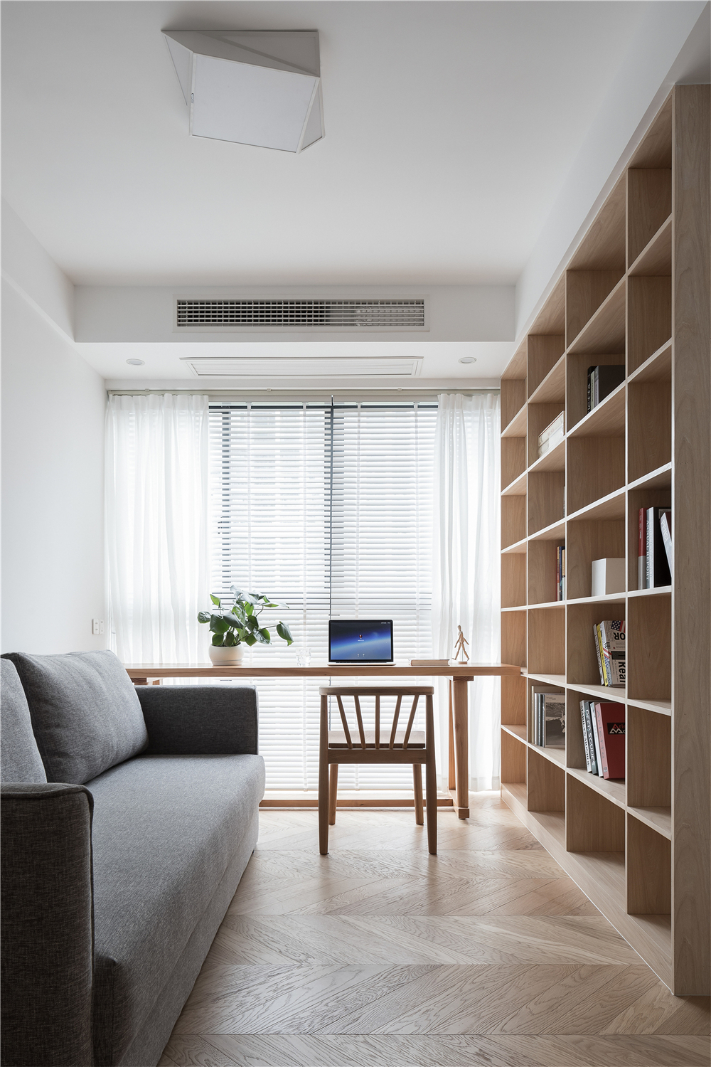 现代风格设计的书房,格局开阔布置完善,色彩搭配简约,满墙落地的书架太实用。