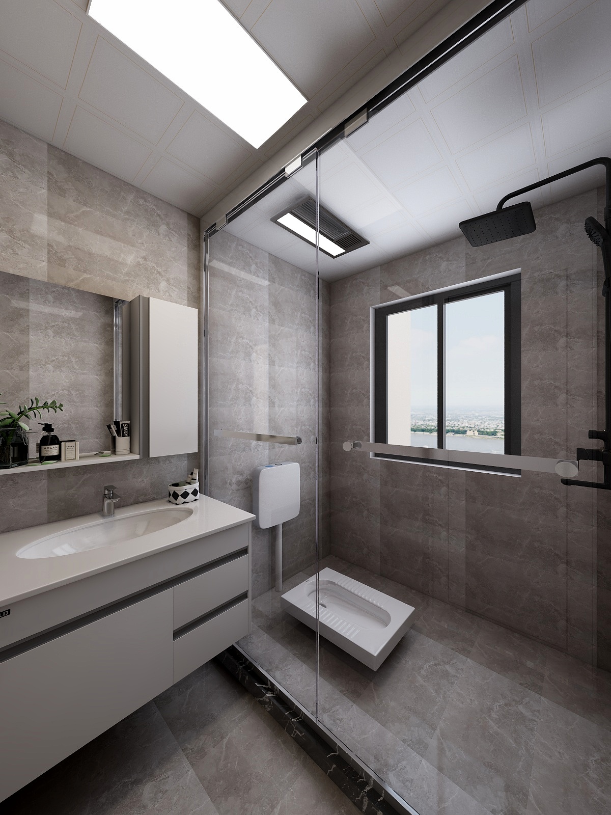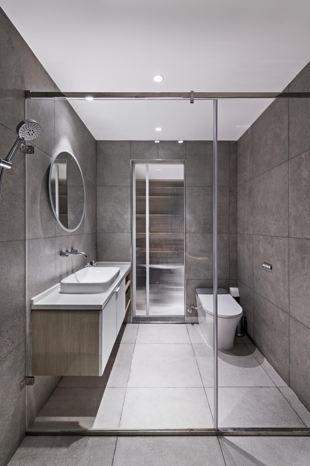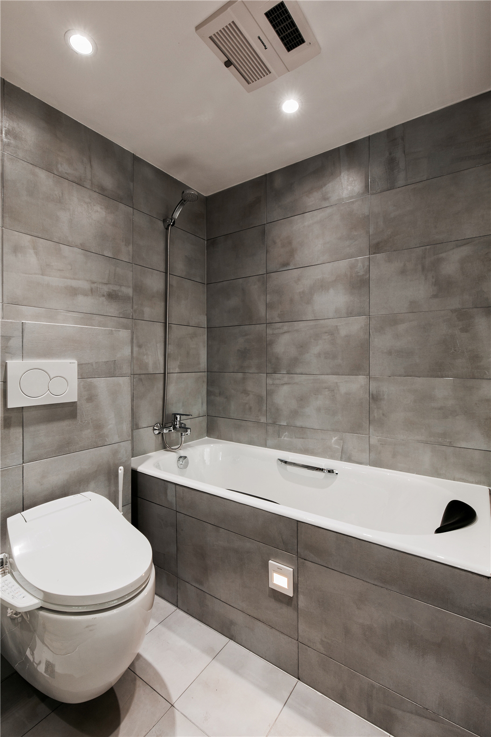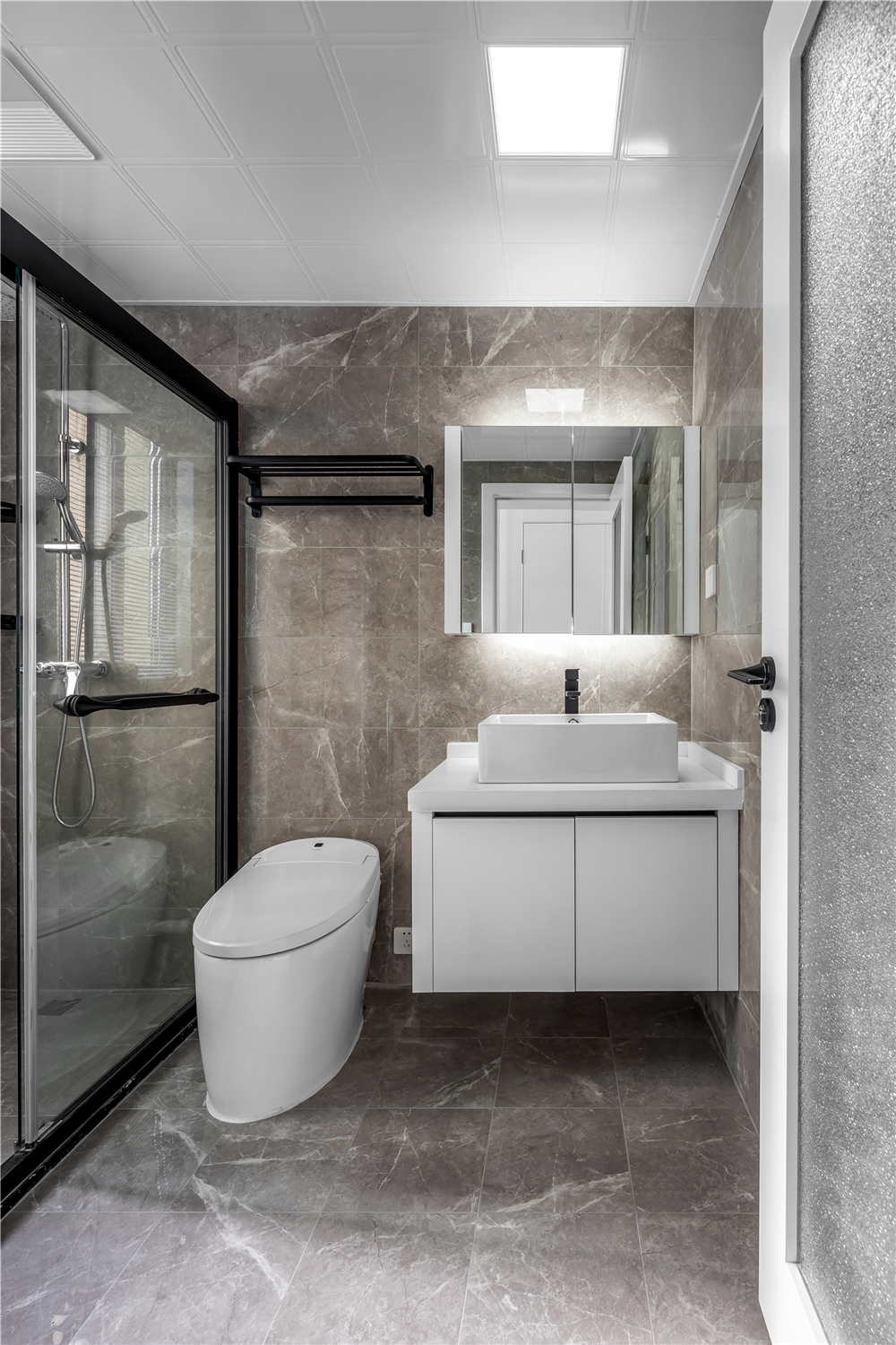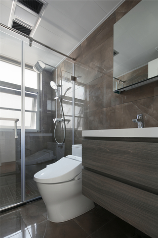 卫生间的墙砖和地砖运用相同的灰色调花纹,光滑的平面更显质感,却又时尚耐看。