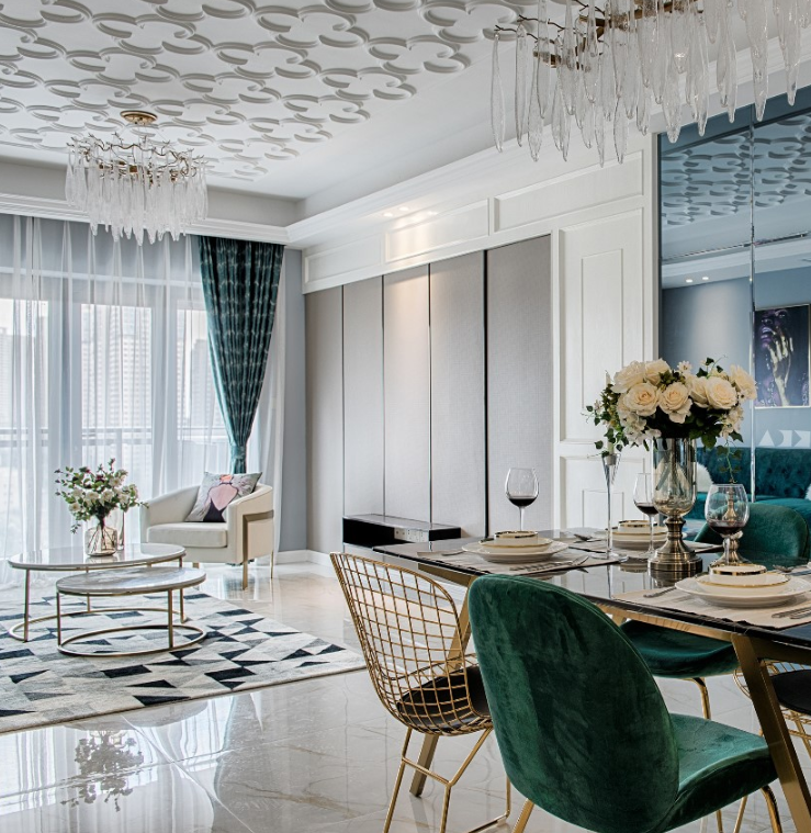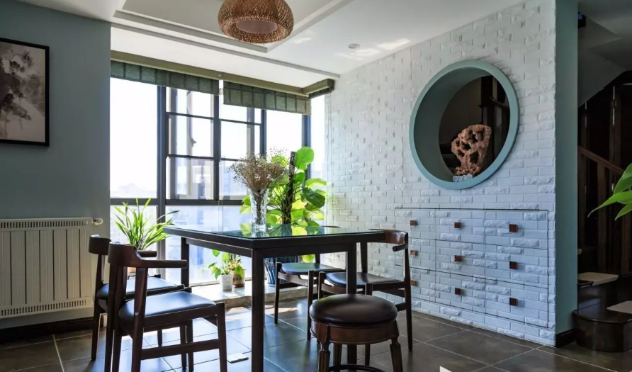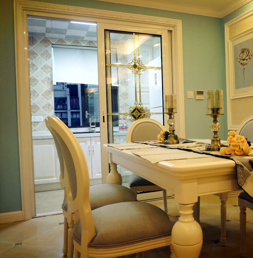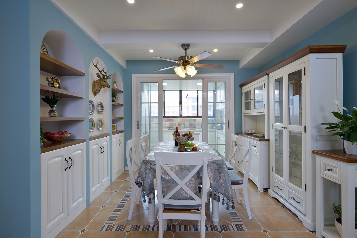 餐厅的区域采用天蓝色作为墙面的颜色点缀,与精美的灯饰搭配,呈现了一种温馨、沉稳和谐的餐桌氛围。