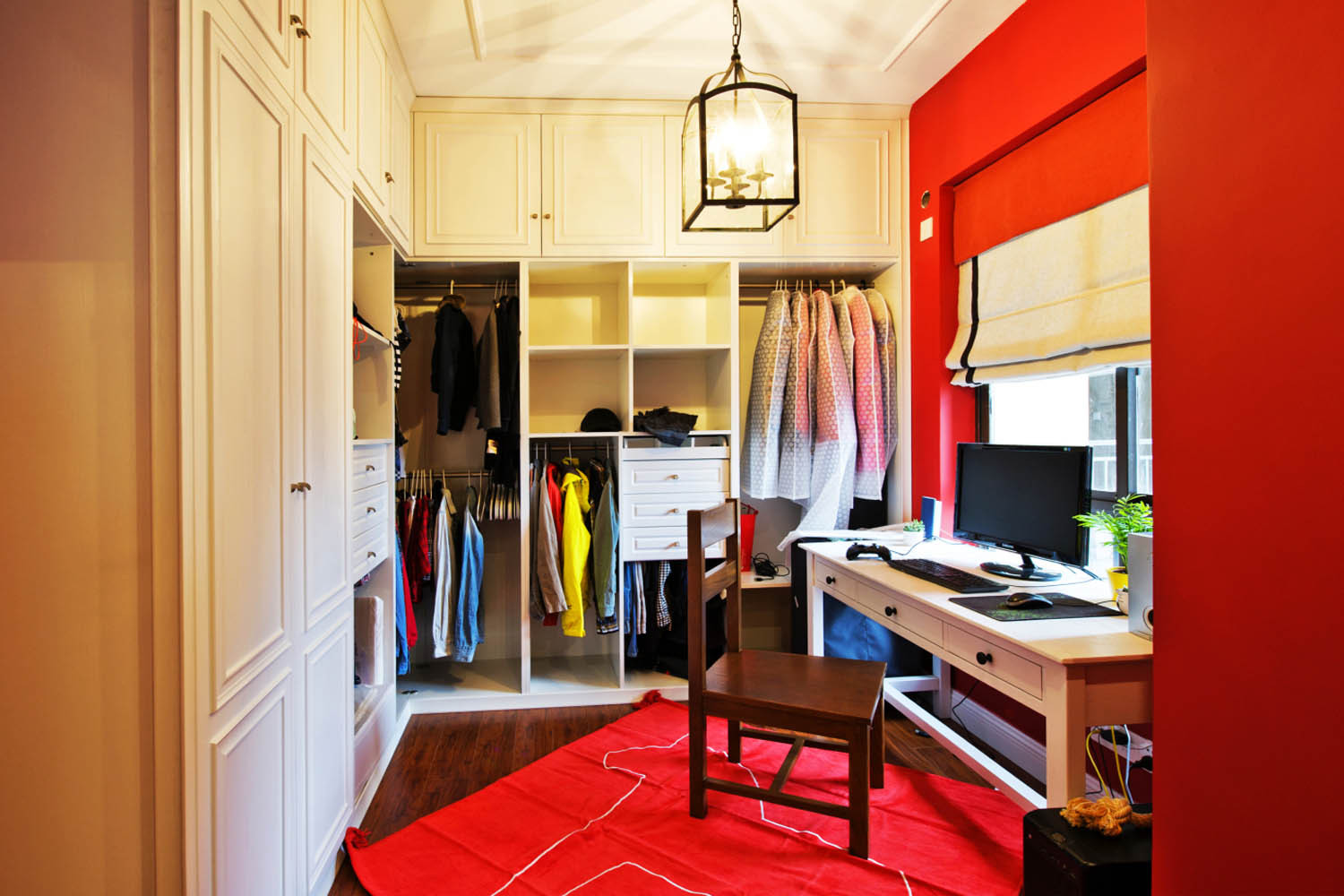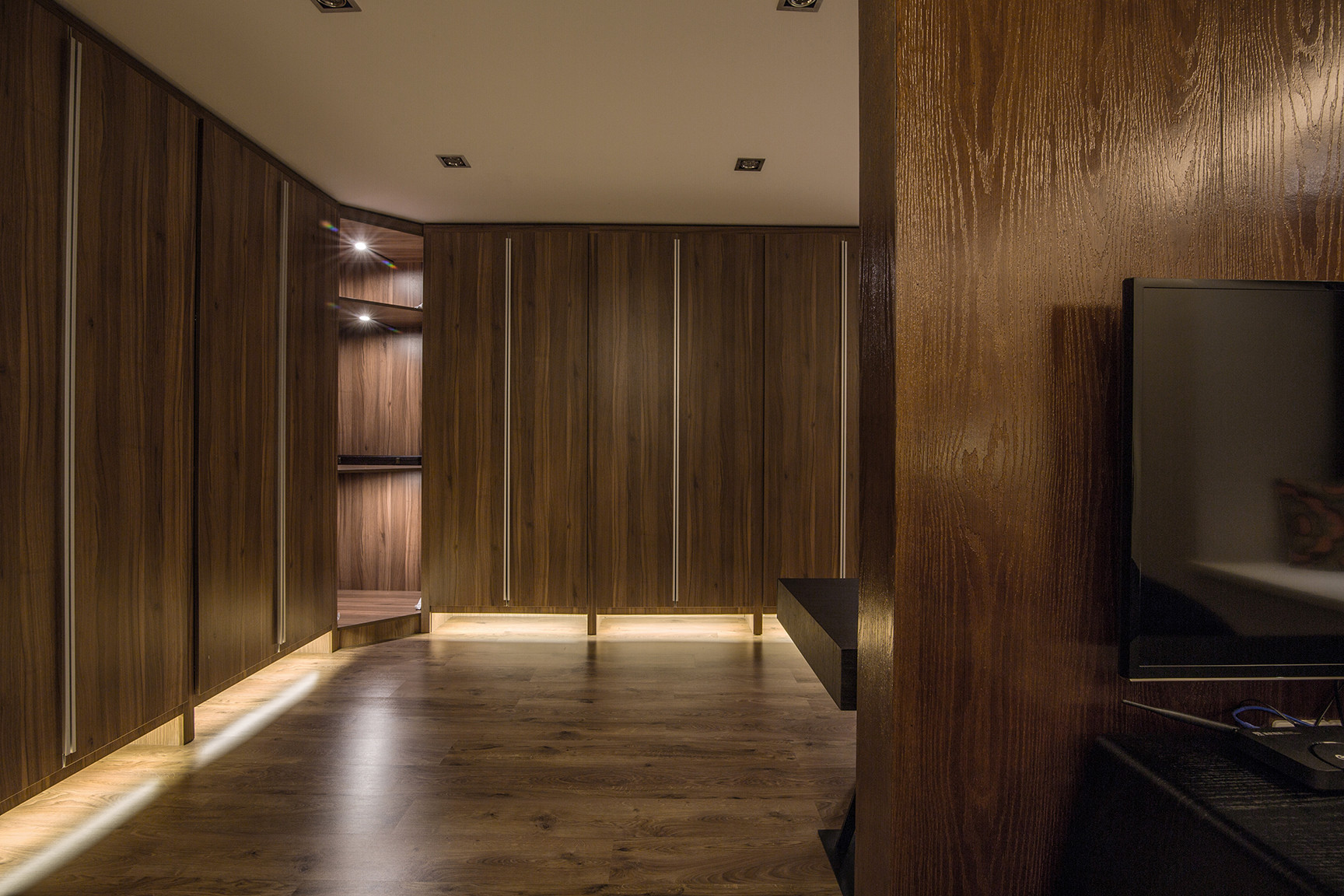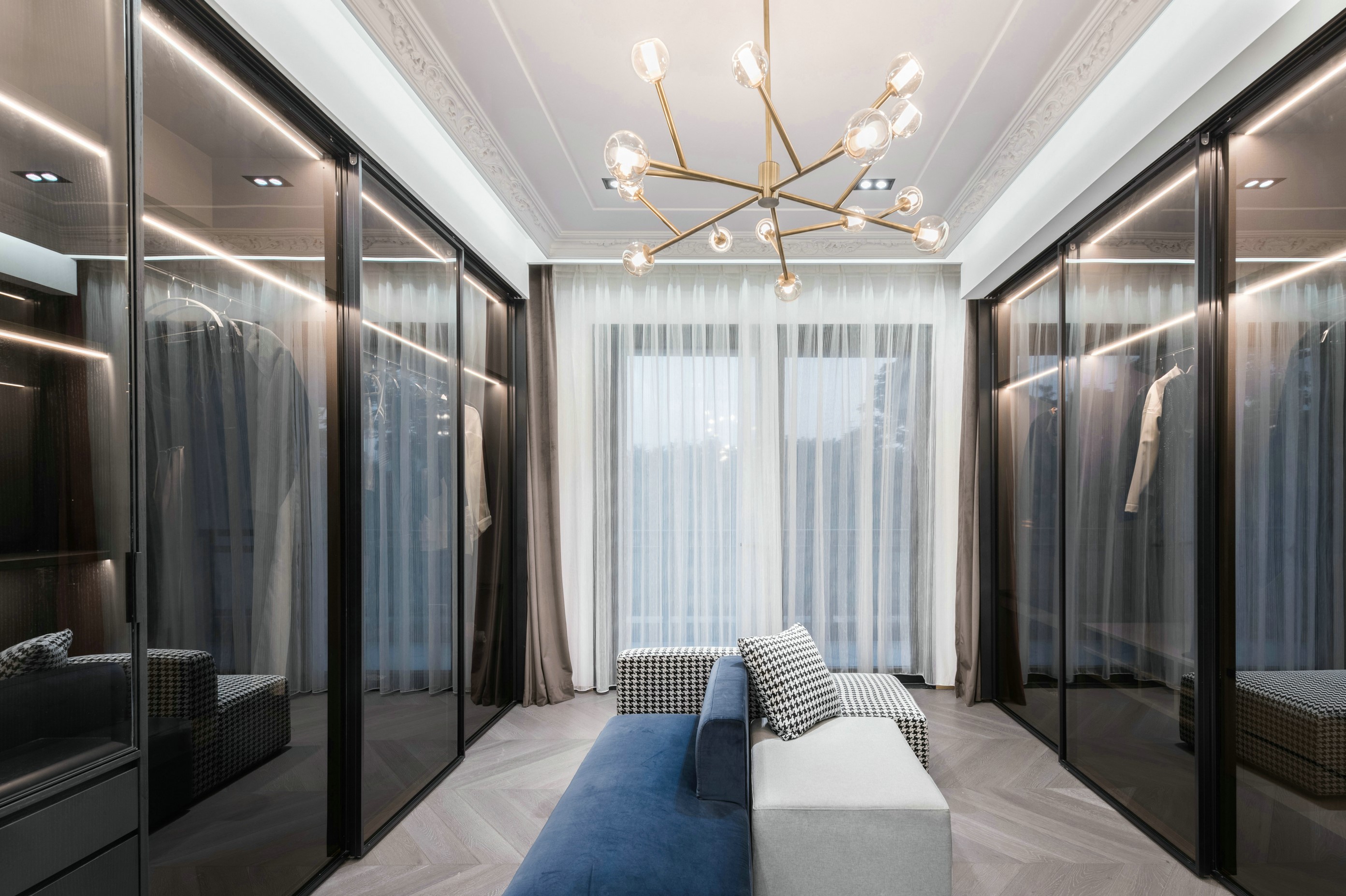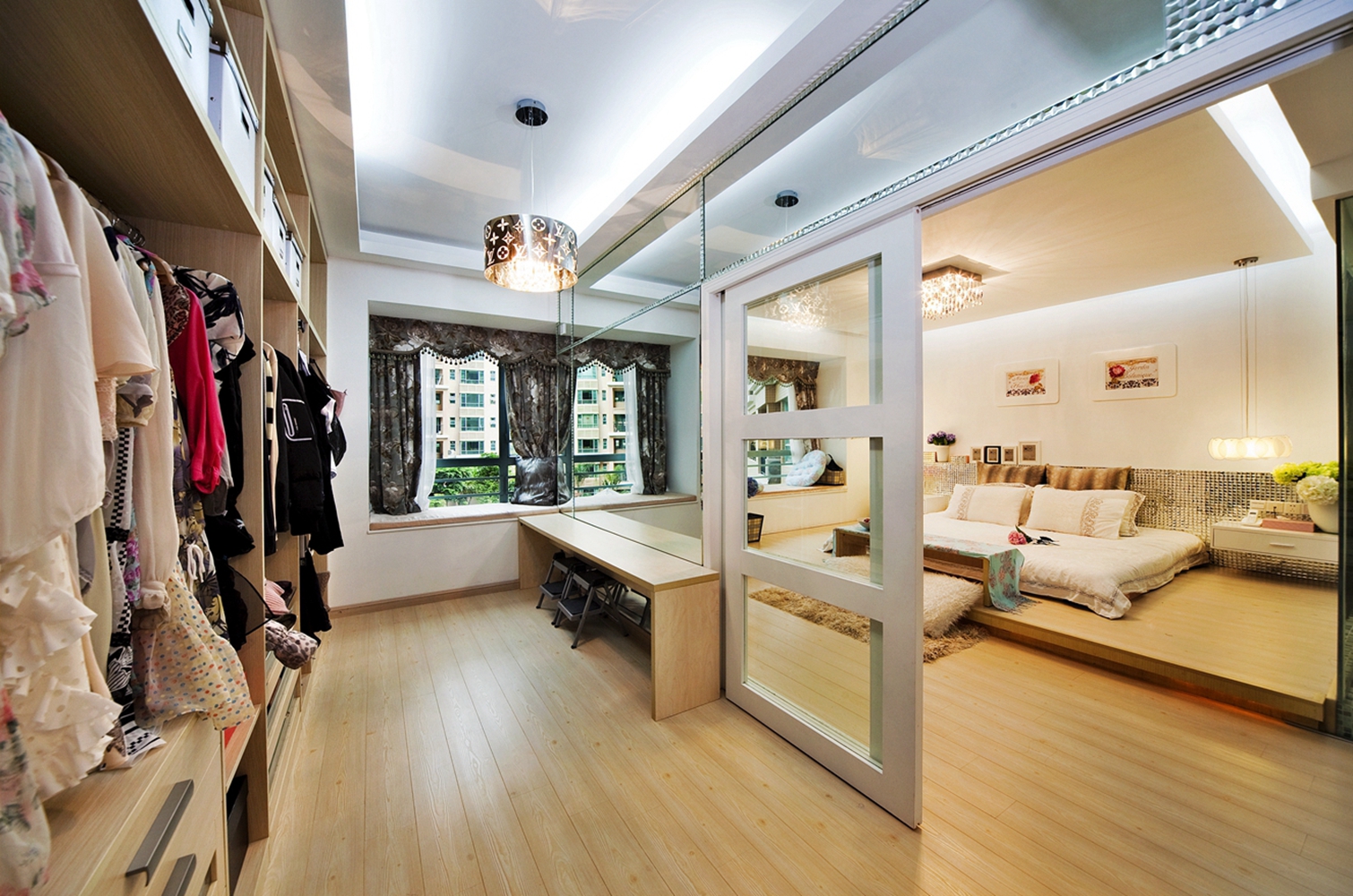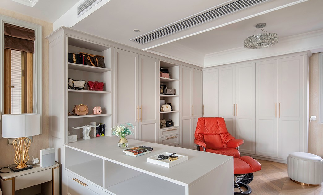 衣柜采用玻璃间隔,使得空间通透,衣柜内部规划不同的挂衣区,这样会更加整洁一些。柜子内部暗藏灯带,增加光源让家的高级感触手可及!