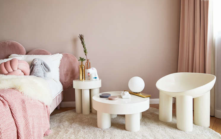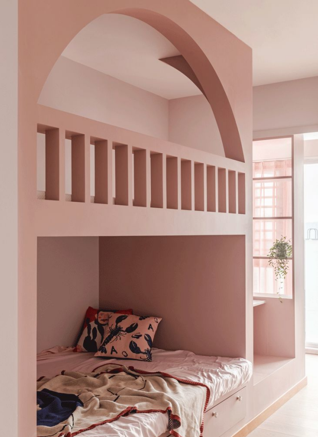 女儿的房间主打粉色调,采用定制的粉色造型,给予孩子自由活动和玩耍的空间。