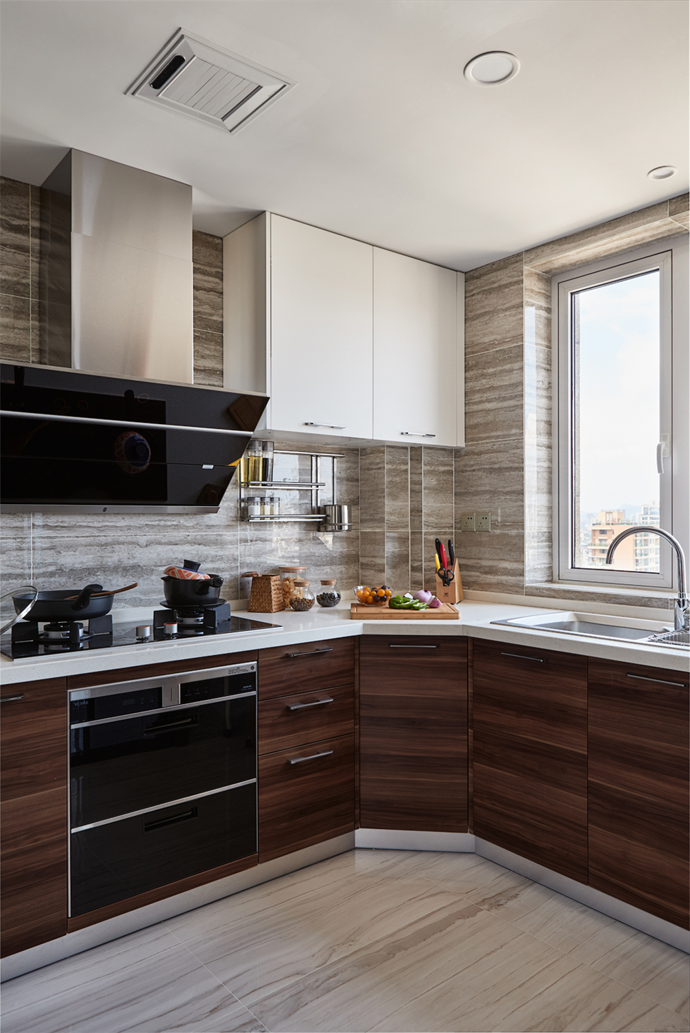 实木在厨房的环境很难打理,容易变形,也并不耐用,由于实木组装橱柜的大面积柜体板时不可避免会用到胶,环保上也并不令人放心,比较好的选择是用实木贴皮,既有木材天然的温度,又保证耐用