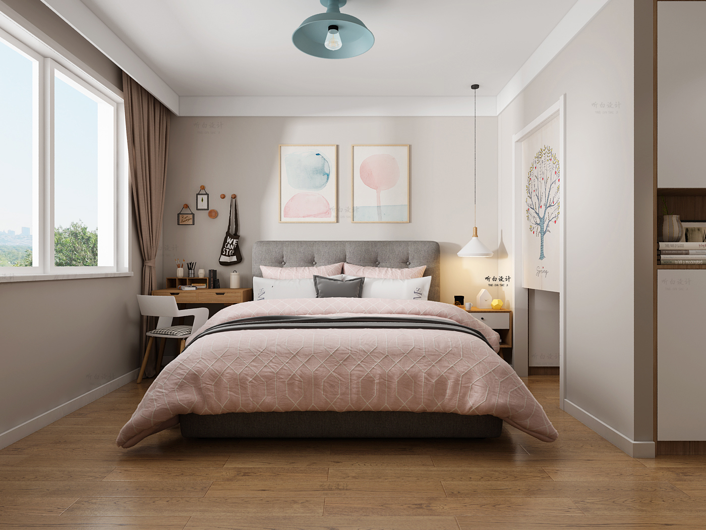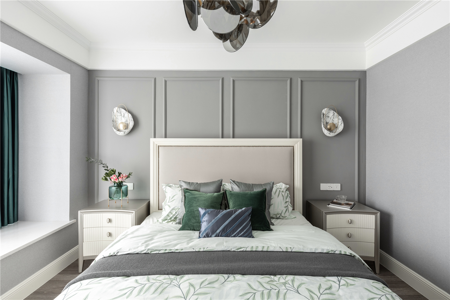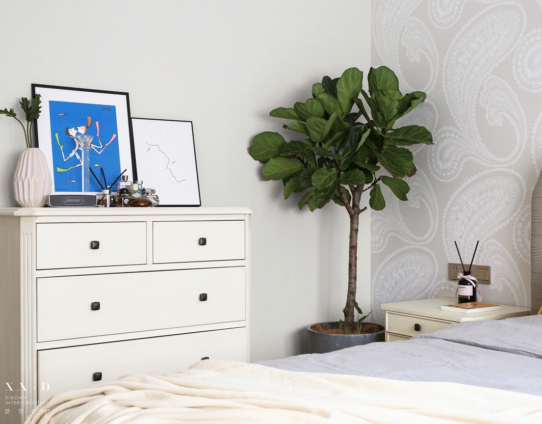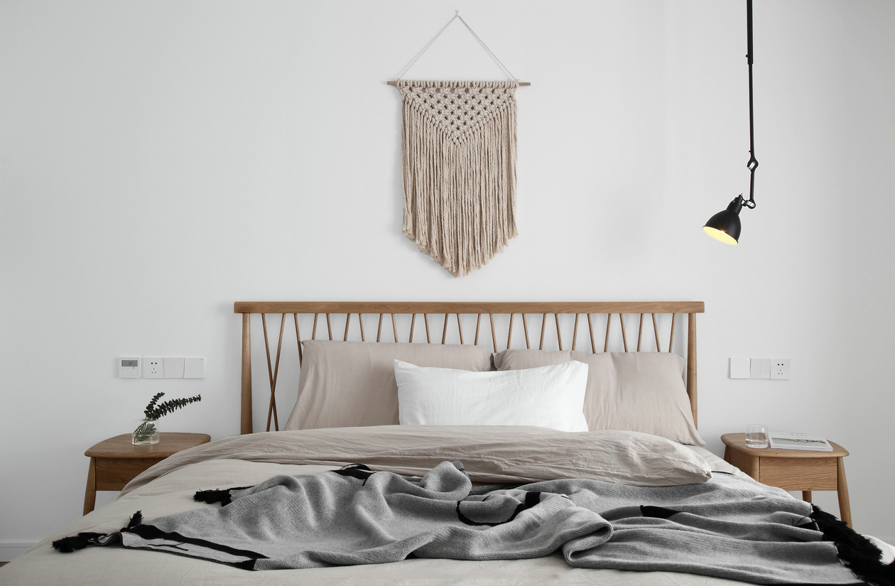 在一片纯白的卧室之中,更能摈弃杂念、快速入眠。选用深色系窗帘,营造静谧的睡眠氛围,加上一盏有品位的床头灯,提升精致感。
