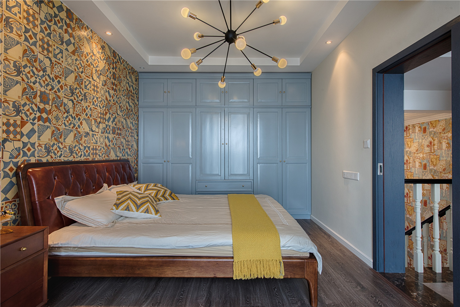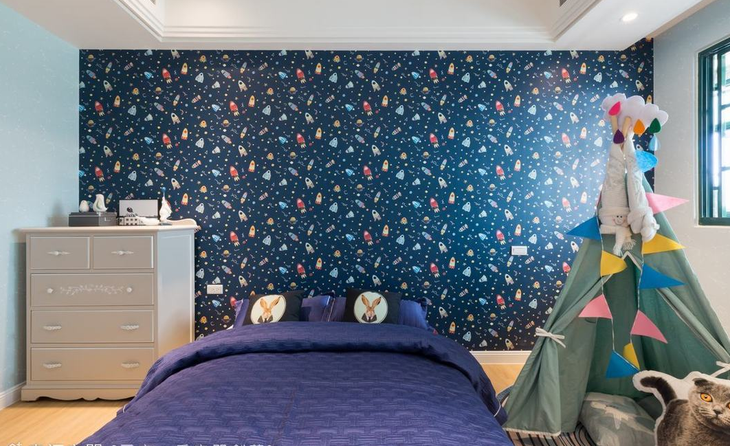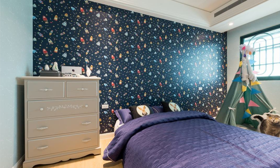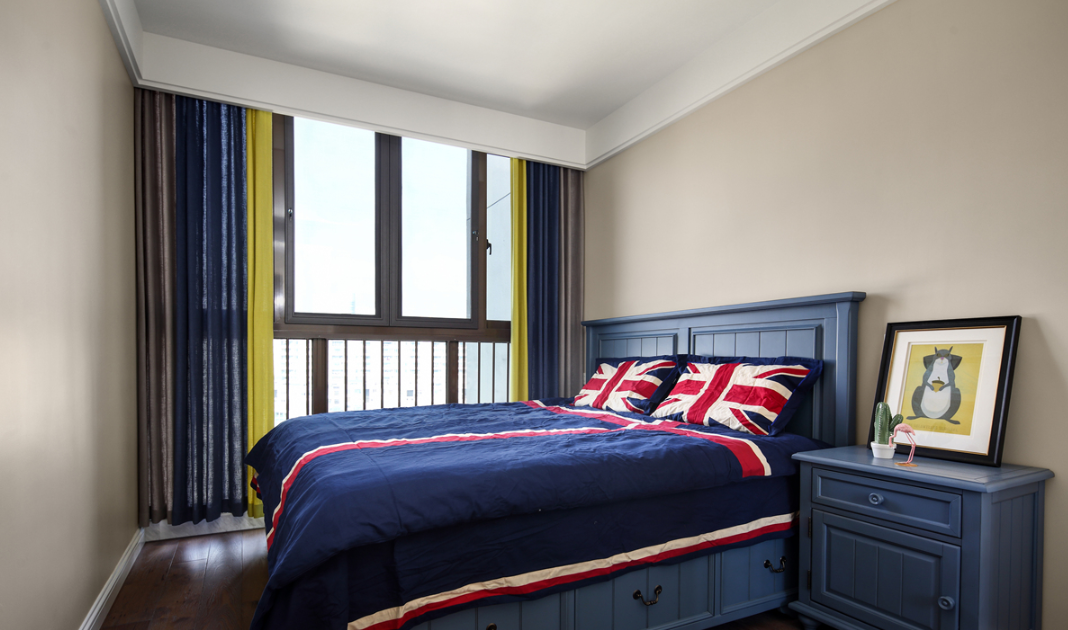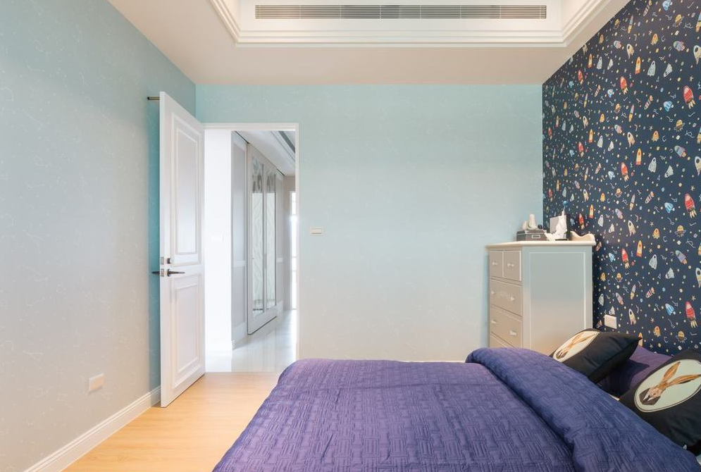 卧室选用了一抹蓝作为空间的颜色点缀,加上白色的收纳柜,总体呈现一个温馨沉稳的休息空间。
