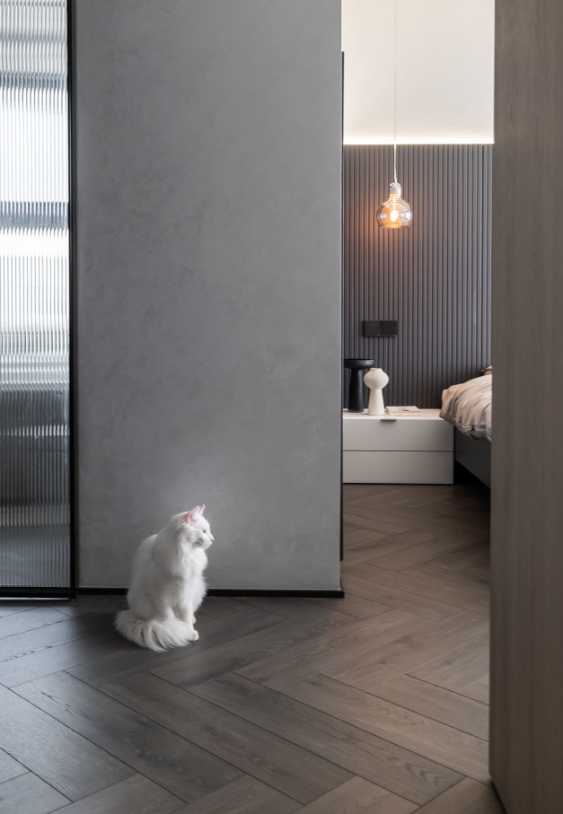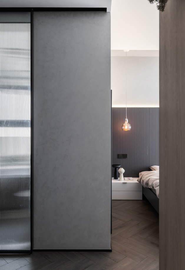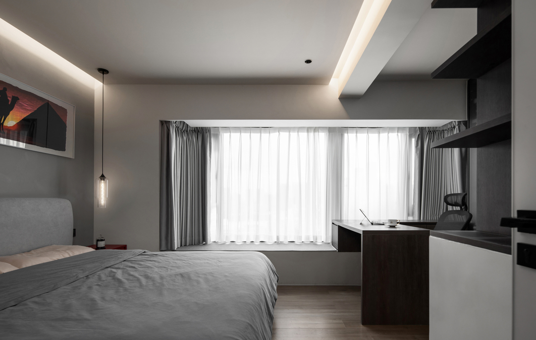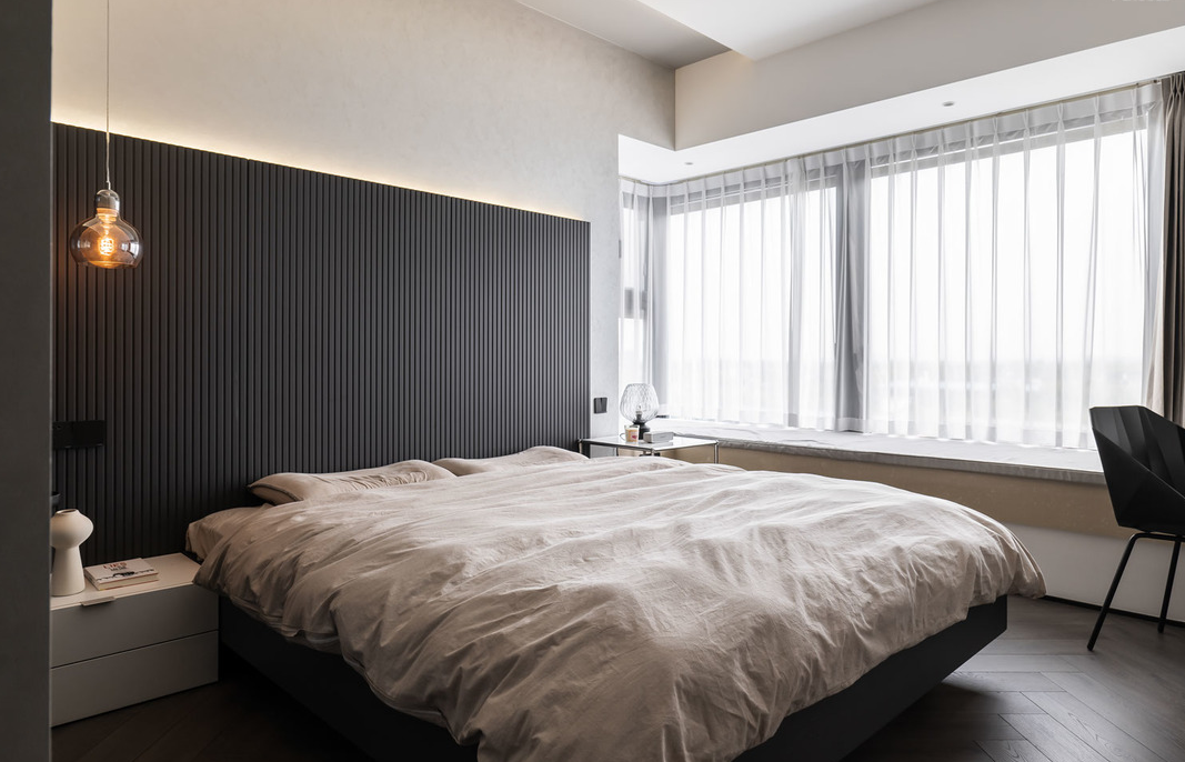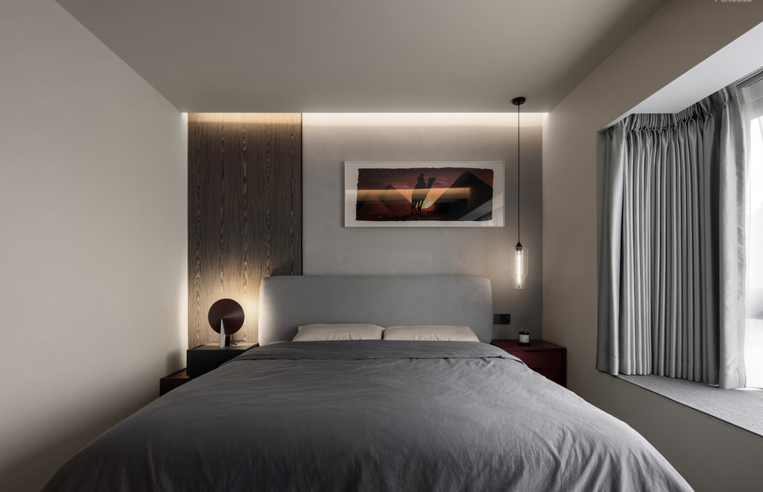 卧室的面积不大,尽量以简单的家具为主导,浅灰色床头背景和奶咖色的床上用品中和搭配,达到理性与温馨的相遇,肌理与材质的平衡。