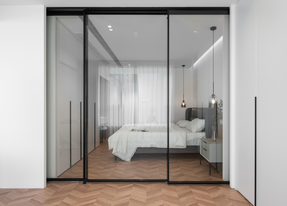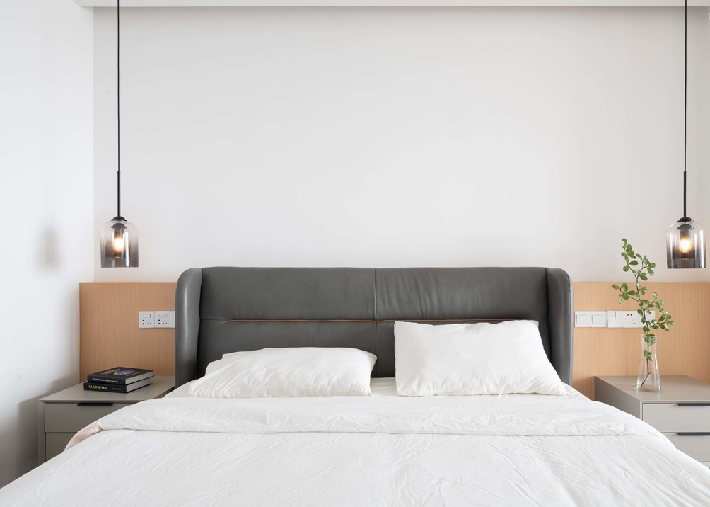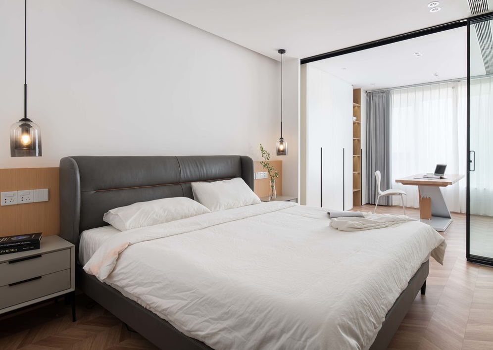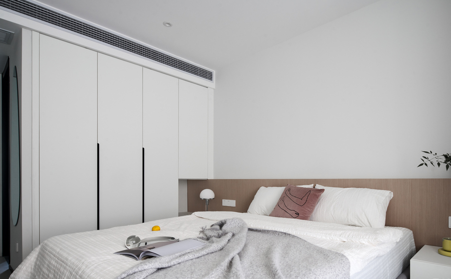 主卧的背景墙使用木饰面拼接的半墙设计,搭配纯白的色调,简简单单,却又内敛而素净,为屋主营造舒适的休憩时光。