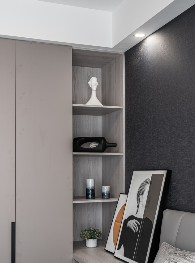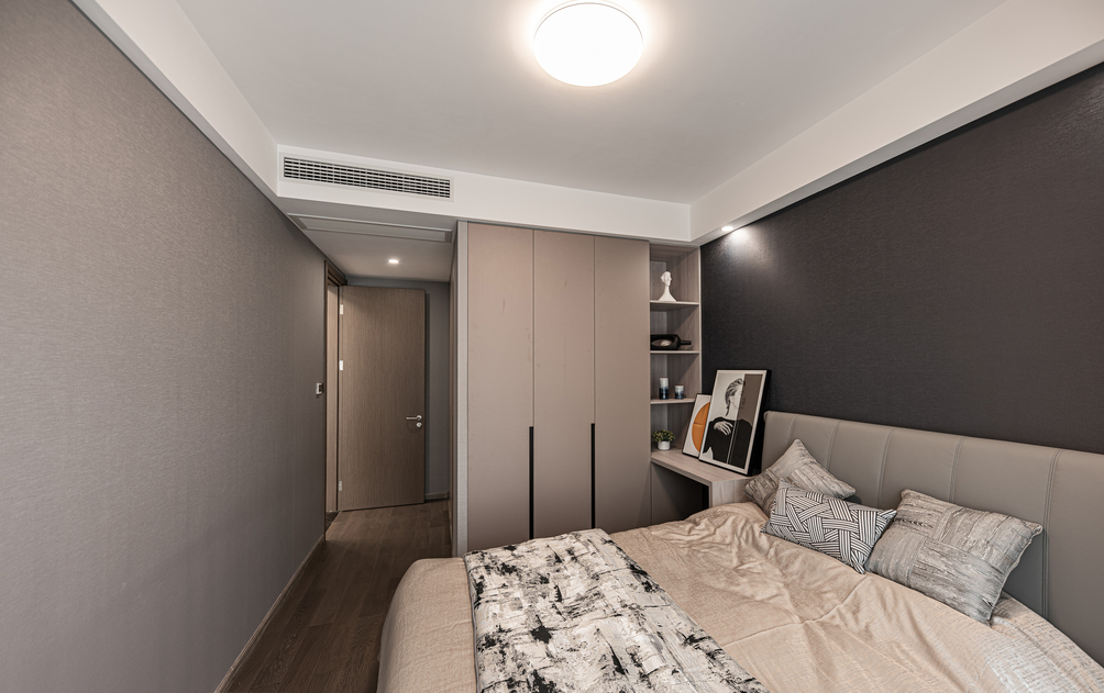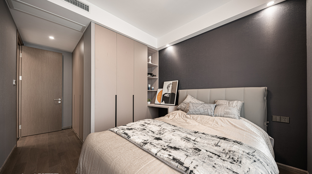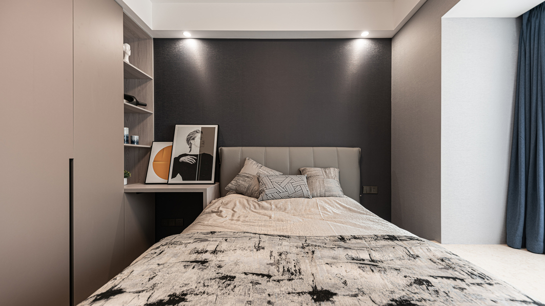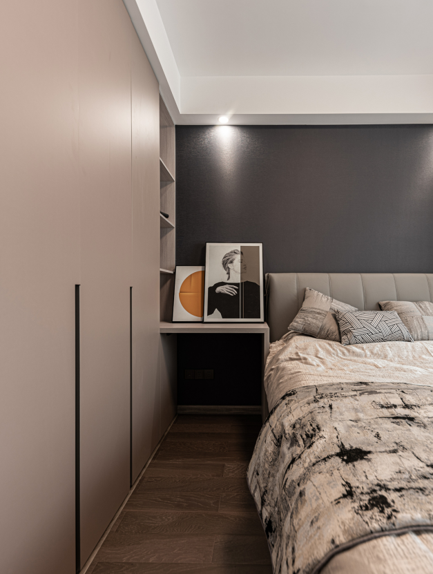 主卧选用灰色和奶咖色搭配,让空间更加温柔简洁,床头侧边采用收纳柜和分格的形式,满足屋主拿取书物的需求,提升了休憩阅读的舒适度。