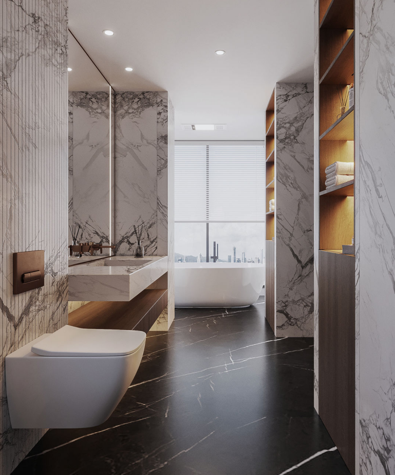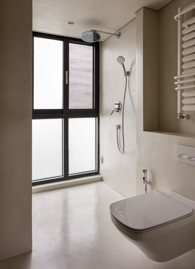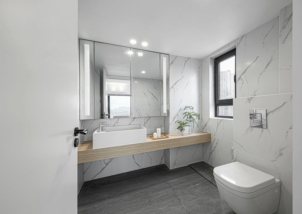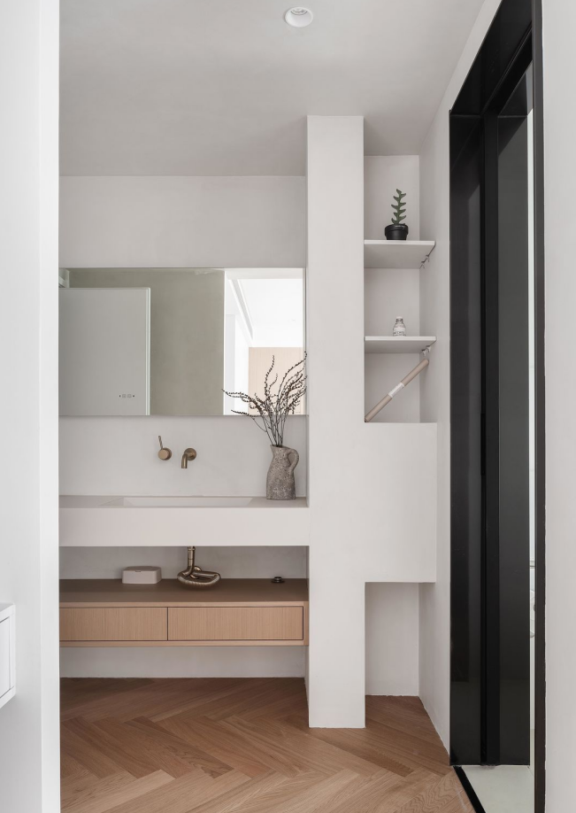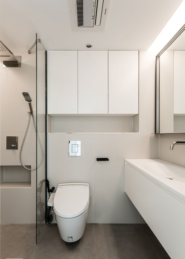 卫生间采用悬空的柜体让空间更加通透,也便于打扫。湿区淋浴采光好,带来清爽素净的沐浴体验。