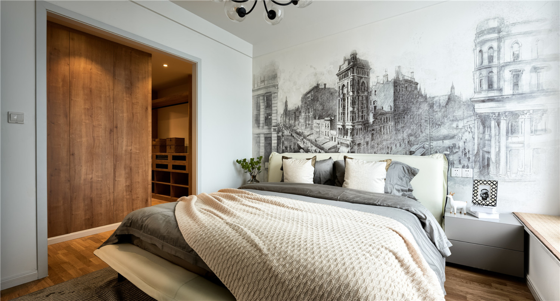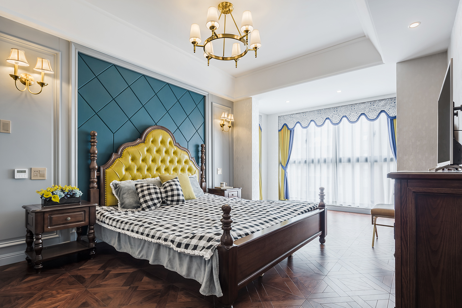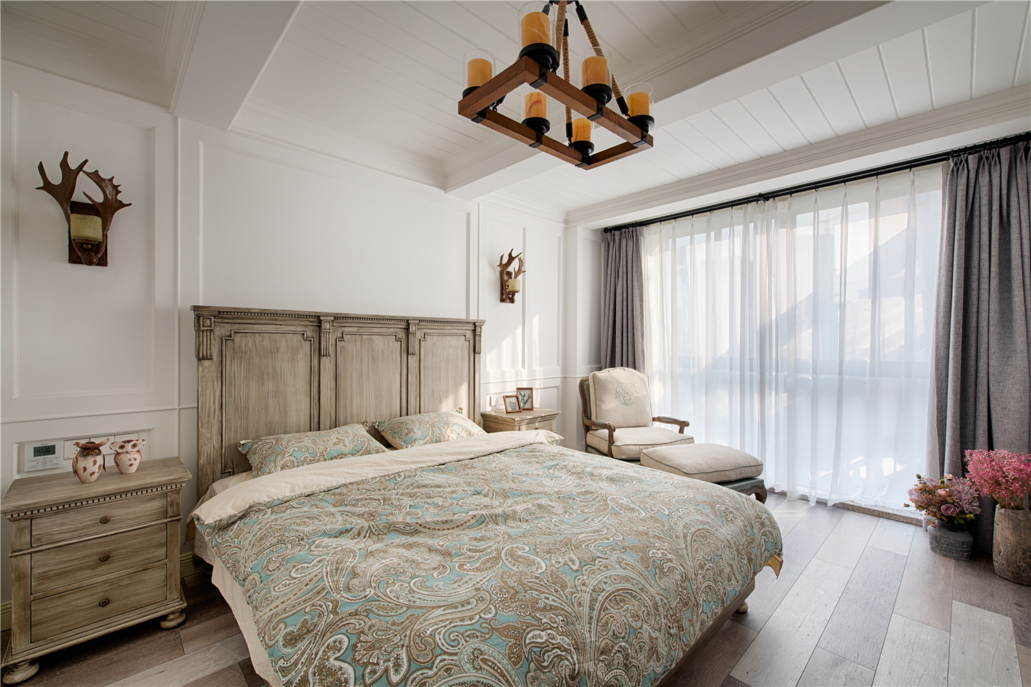 美式家居的卧室布置较为温馨,作为主人的私密空间,主要以功能性和实用舒适为考虑的重点,一般的卧室不设顶灯,多用温馨柔软的成套布艺来装点,同时在软装和用色上非常统一