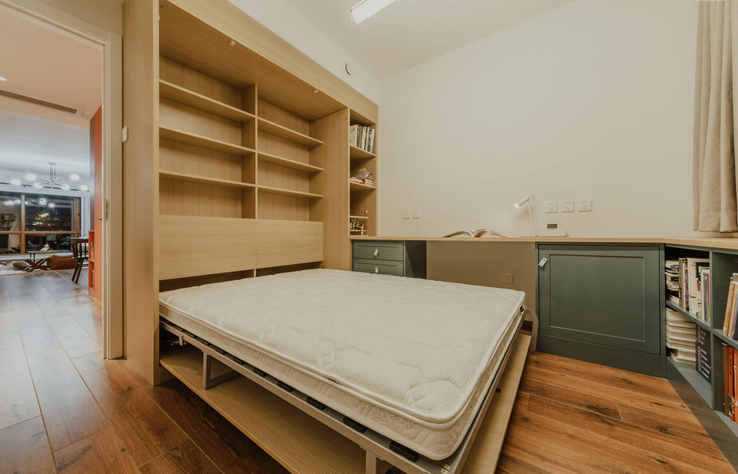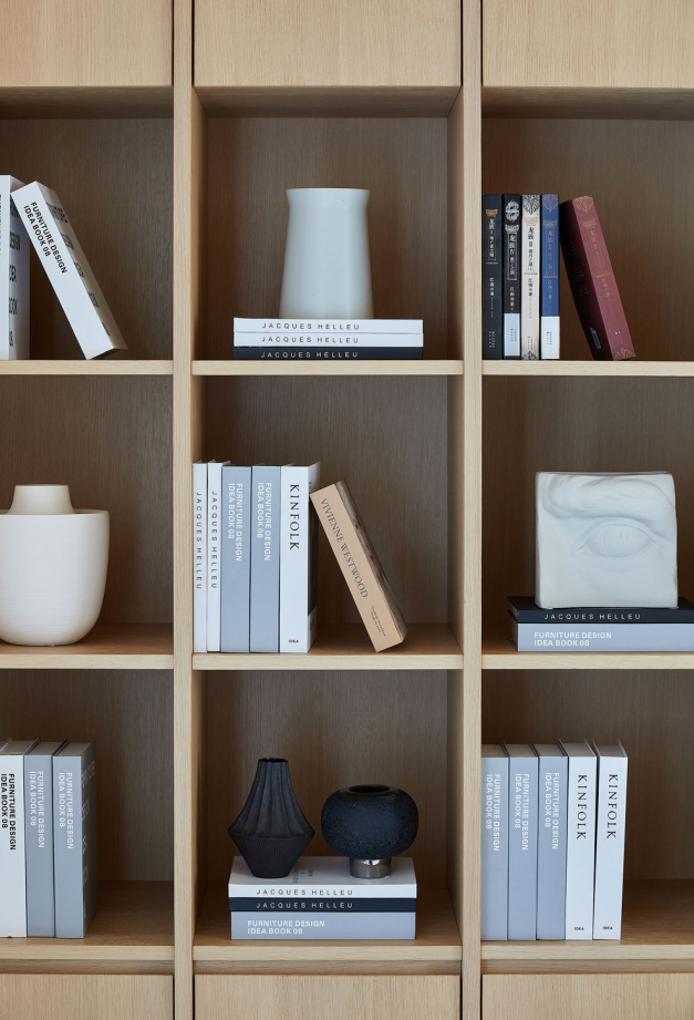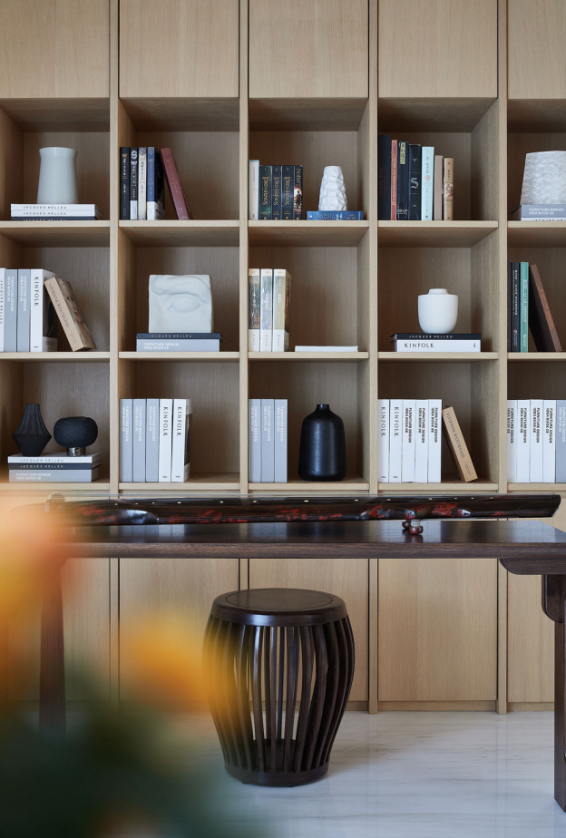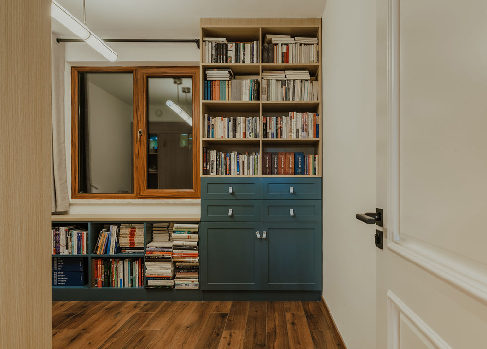 书房利用原木的材质,定制了木质柜体,多个分格形成了整排收纳墙,分类明确,整个房间充满书香、简约和雅致的气息。