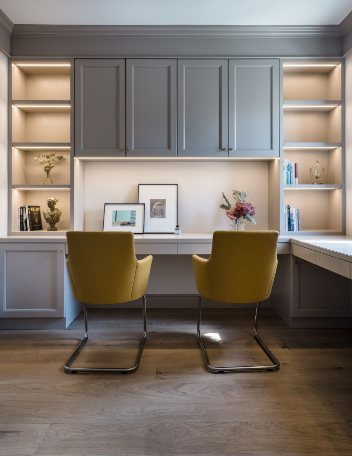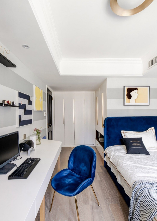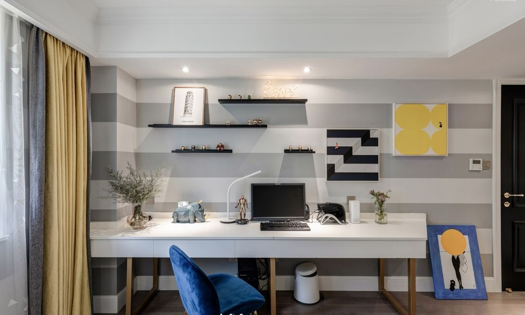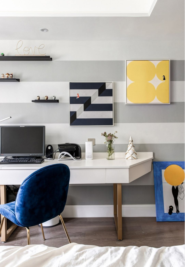 书房以白色调为主,辅以黄色、深蓝中和,让休闲空间更加明亮温馨,壁画也增添了艺术气息。