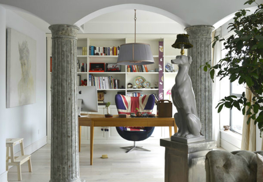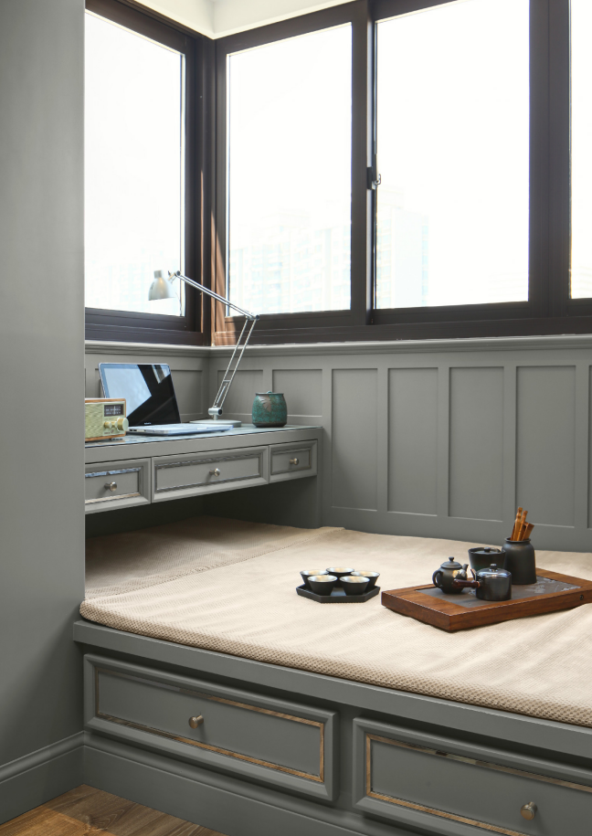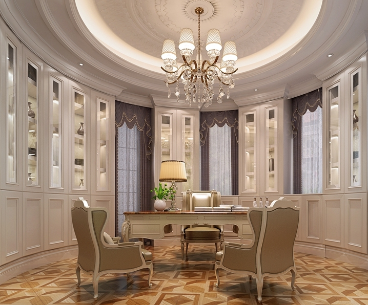 书房放置了一个落地书柜,采用弧形的造型设计,让书柜和空间更加别致,又不像全封闭式那样刻板。