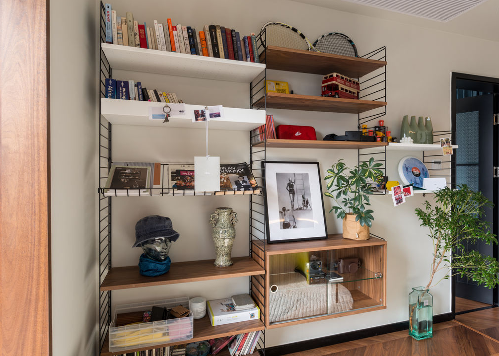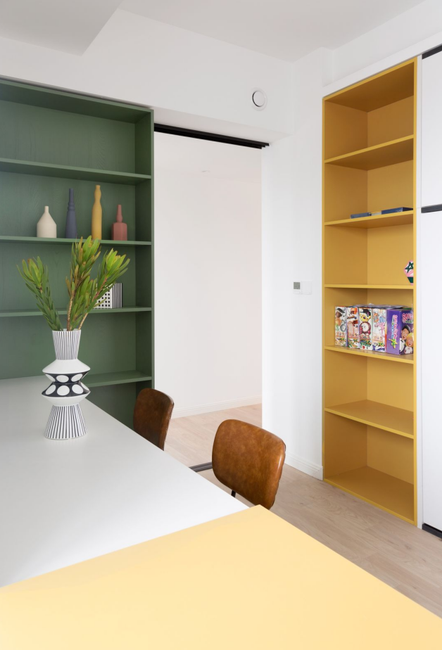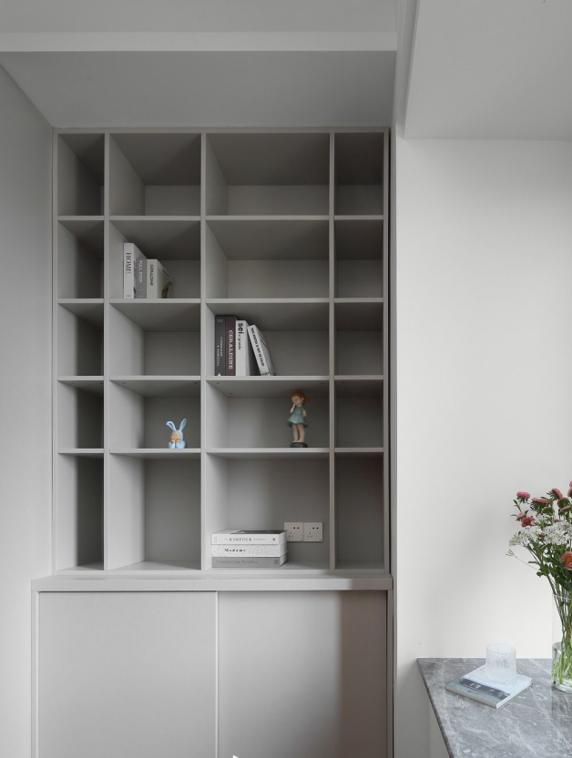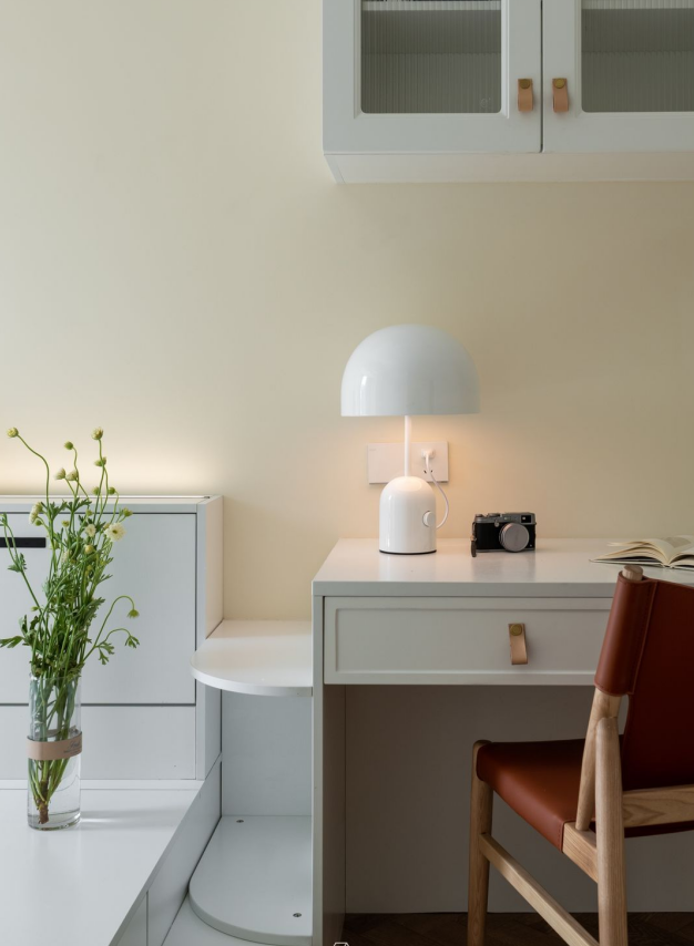 书房采用纯白为主调,靠墙的柜体和分格增强了收纳力,一盆绿植恰当地装饰了空间,更显清新雅致。