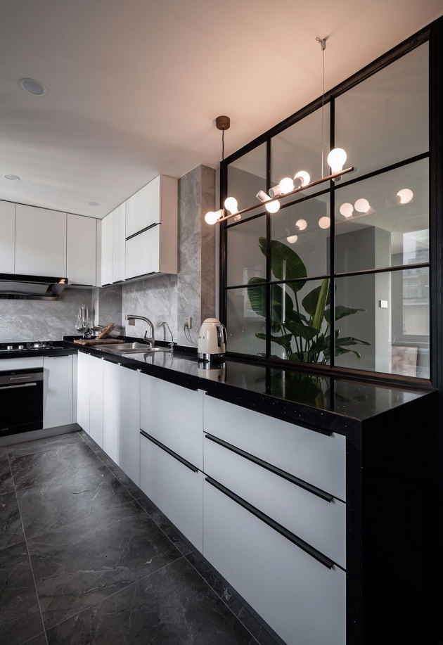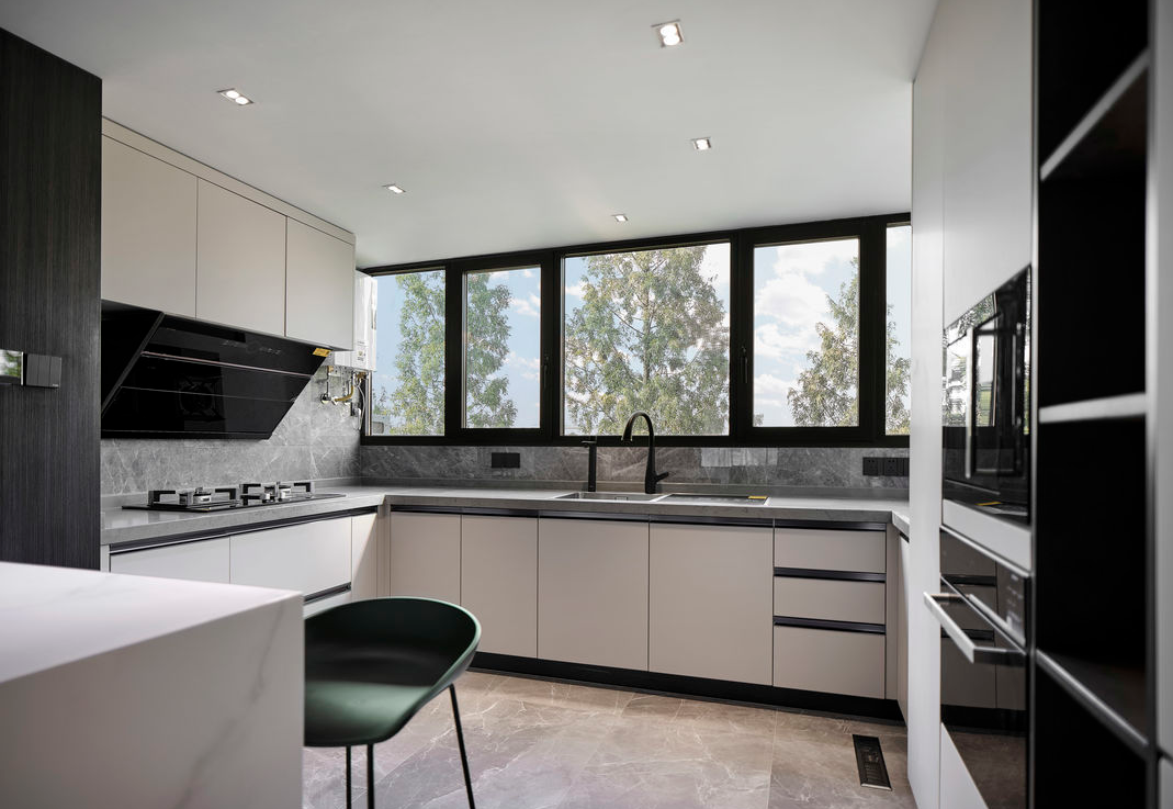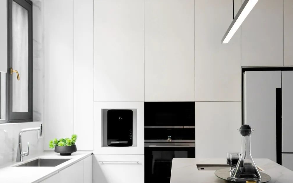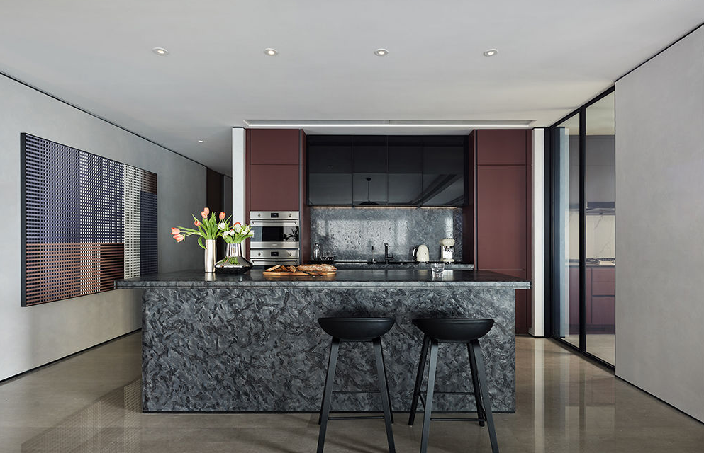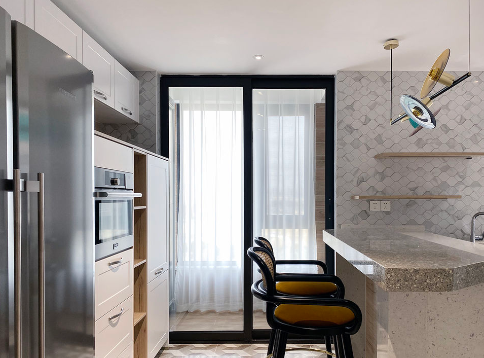 厨房中间采用中岛台设计,中岛台的另一侧是收纳柜放置厨房用品,满足屋主不喜欢多余物件放在桌面的需求。