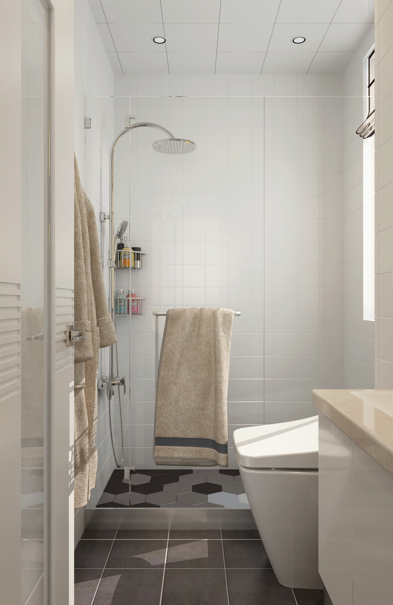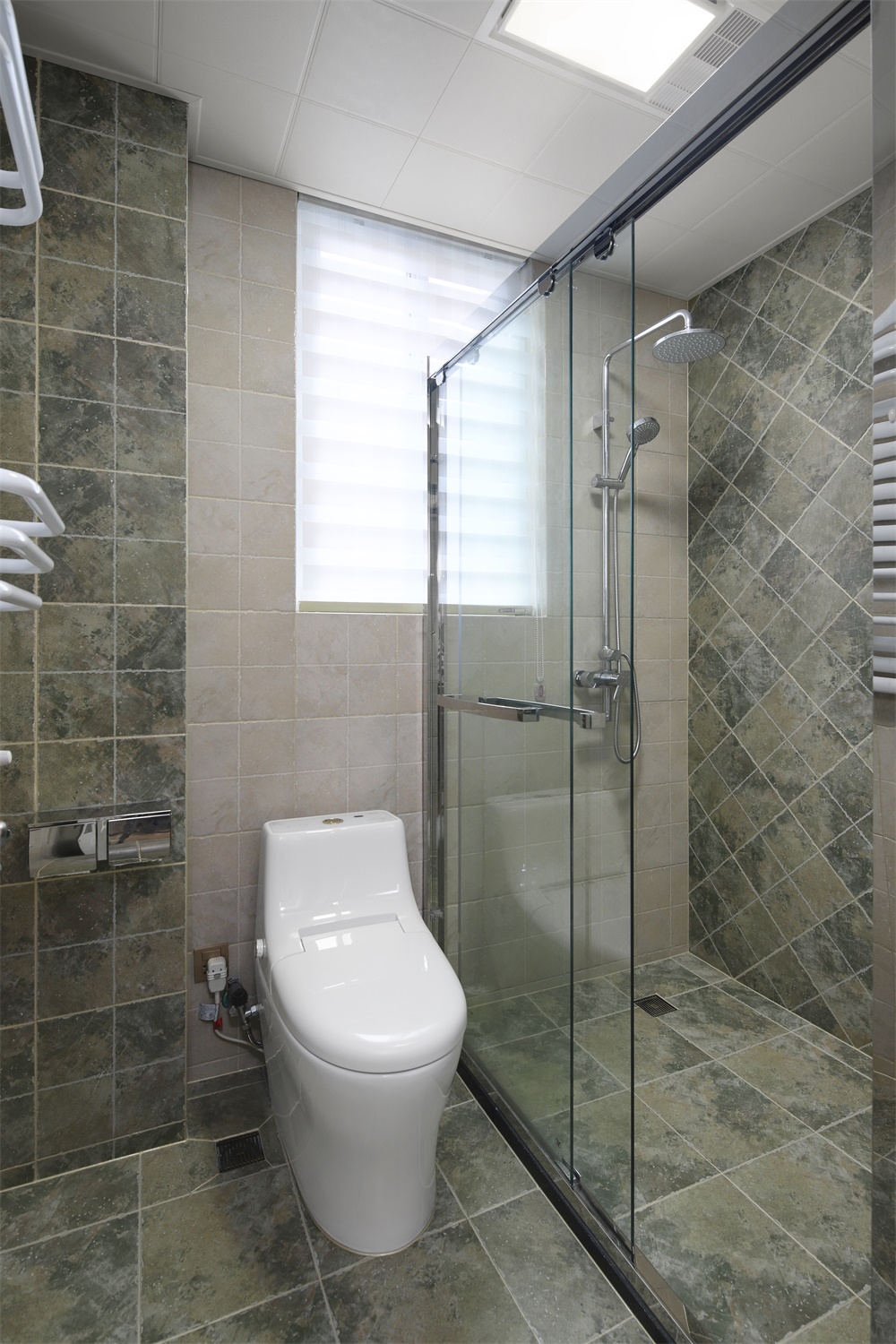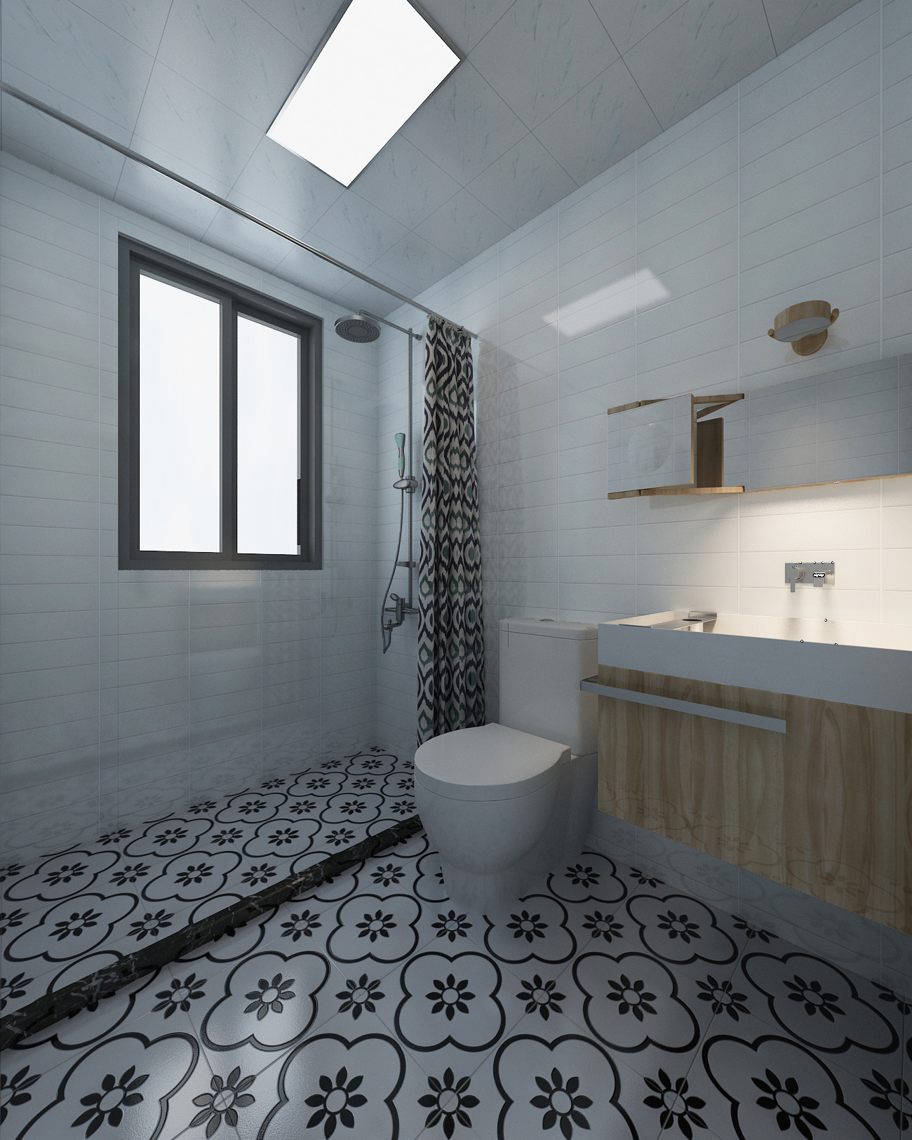 卫生间大胆使用黑白色超级大素,显得分明、简洁明净,以绿色植物作点缀,可平添不少生气