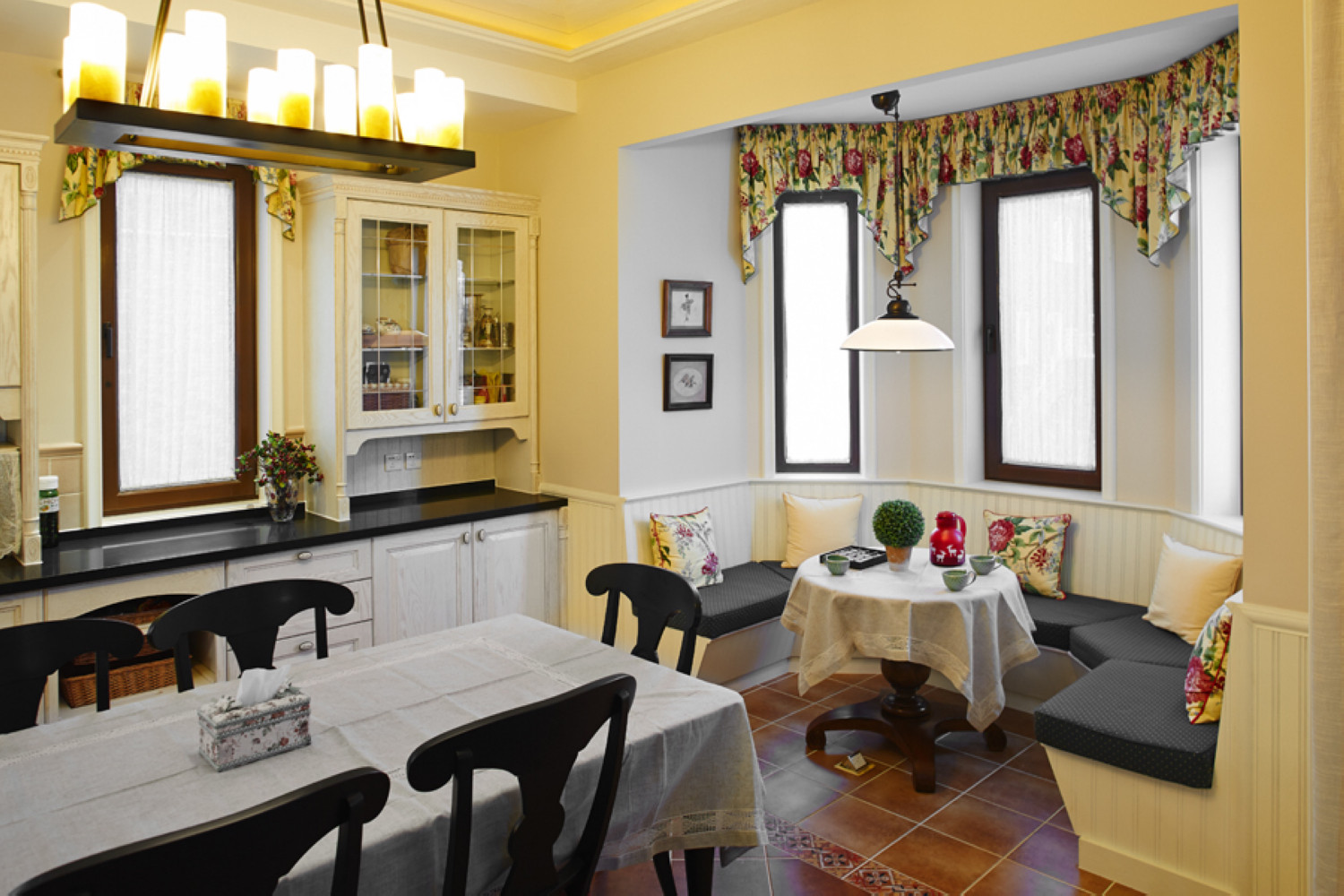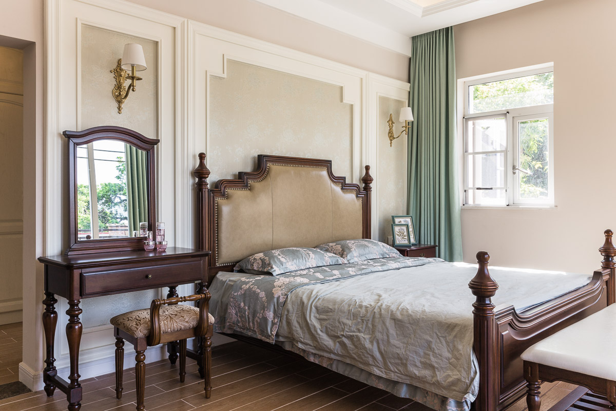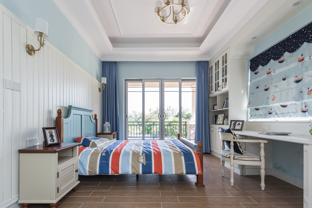 美式装修在陈设上更是丰富,宽敞的墙面是绝对不能空荡的,各种装饰画、花卉、饰品、地毯、百叶窗、还有最最知名的吊扇灯。美式喜欢用大量的实木不假,皮沙发和深色木床这些也很常见,但无论是所谓的美式乡村,还是美式现代,很少是一片黑压压的,讲究得恰恰就是个“敞亮”。