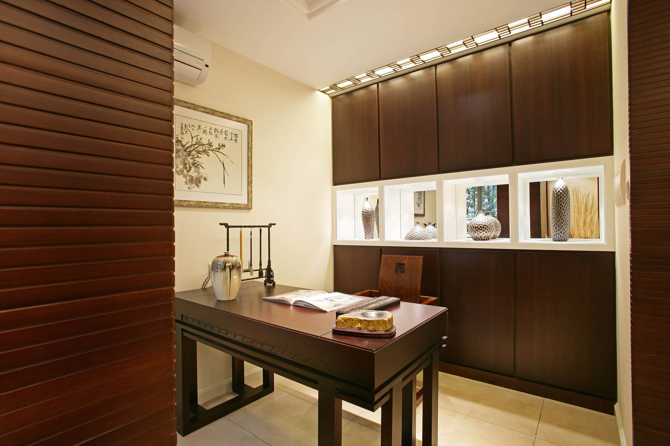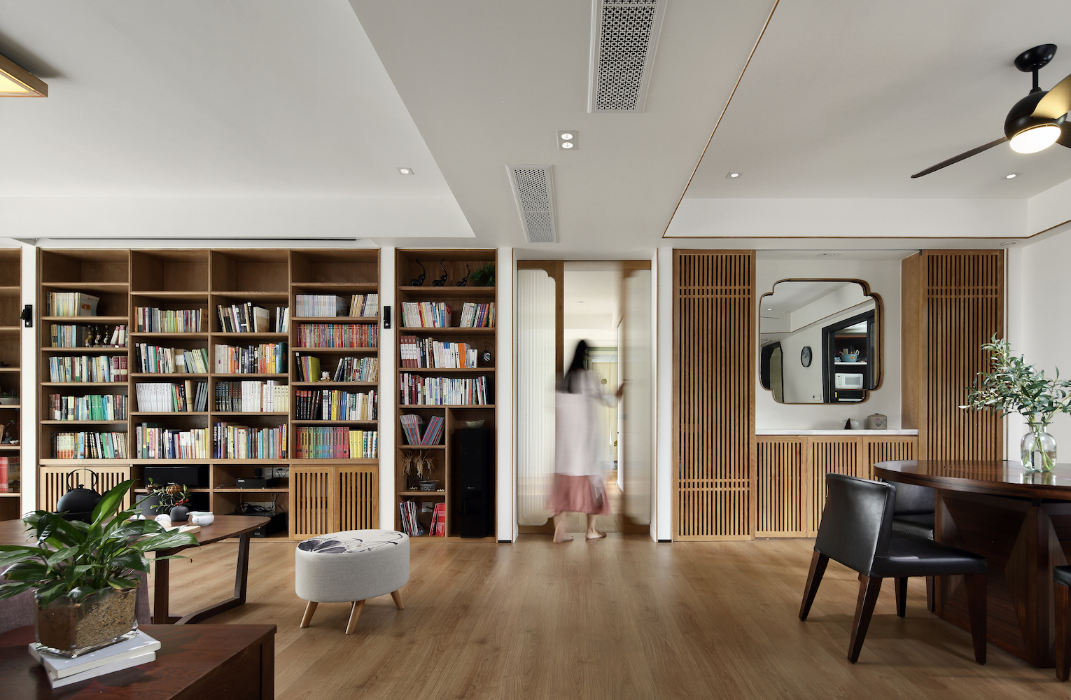 棕色的椅子搭配黑色的桌子,木质的架子和白色的定制柜互补,让空间更显明亮和简洁,混搭的布局更显功能层次感。