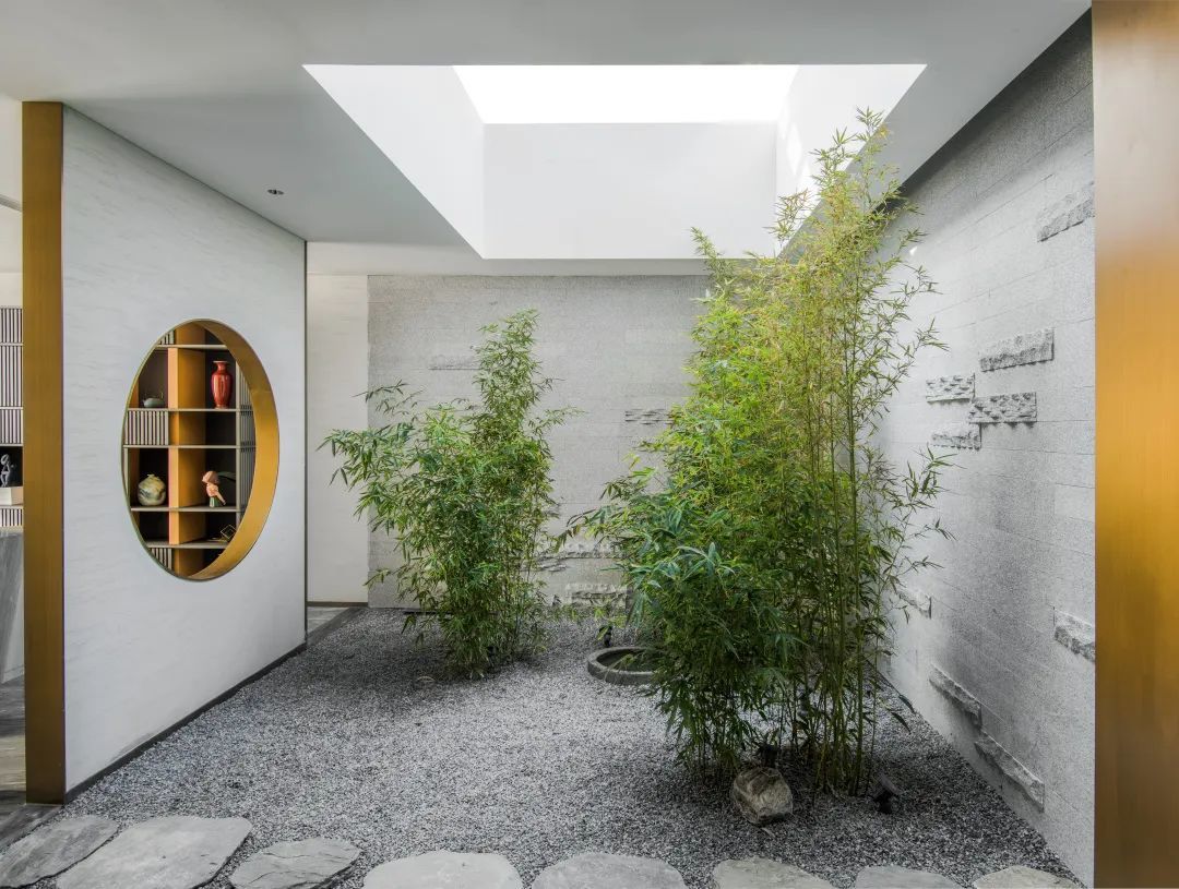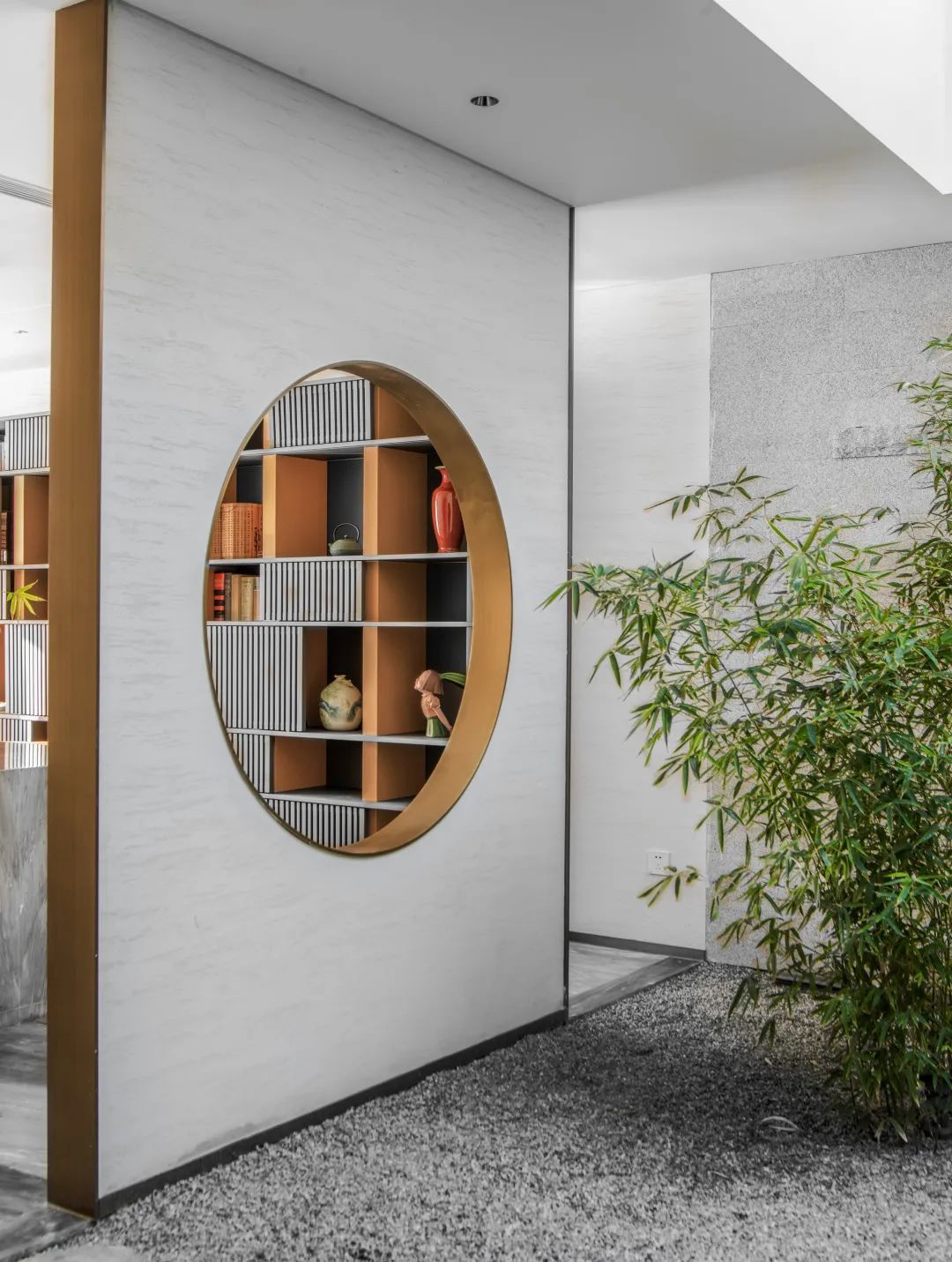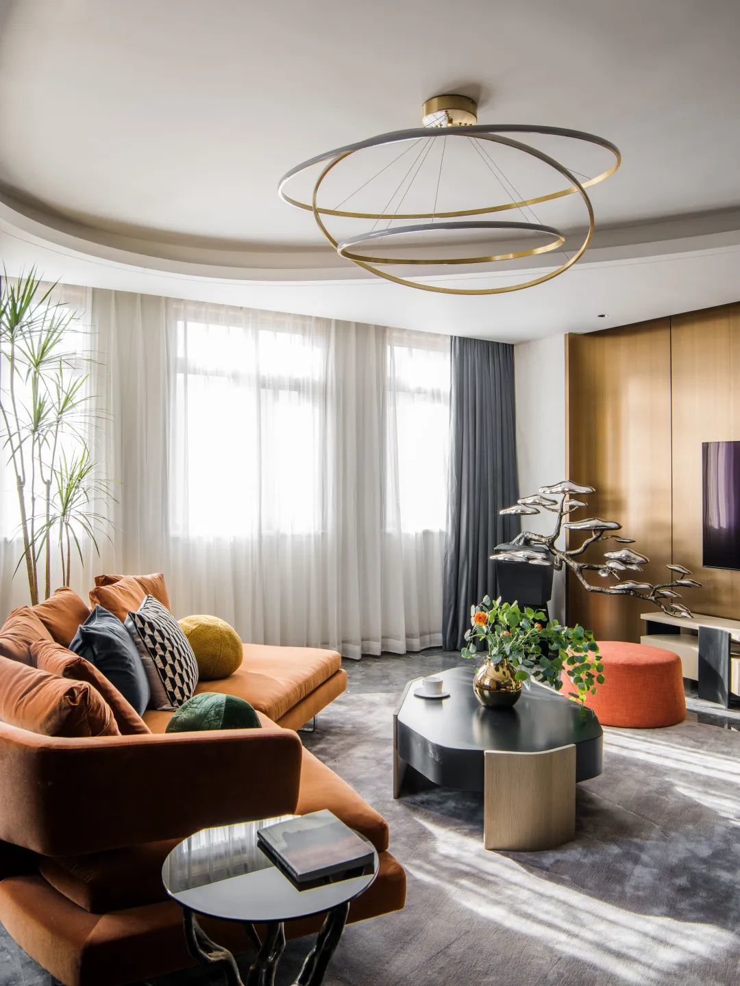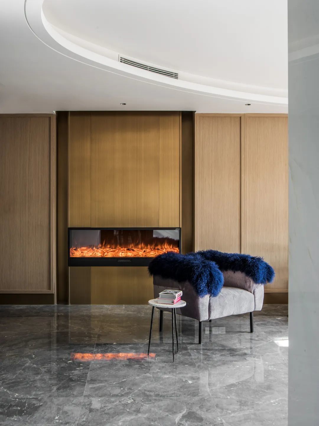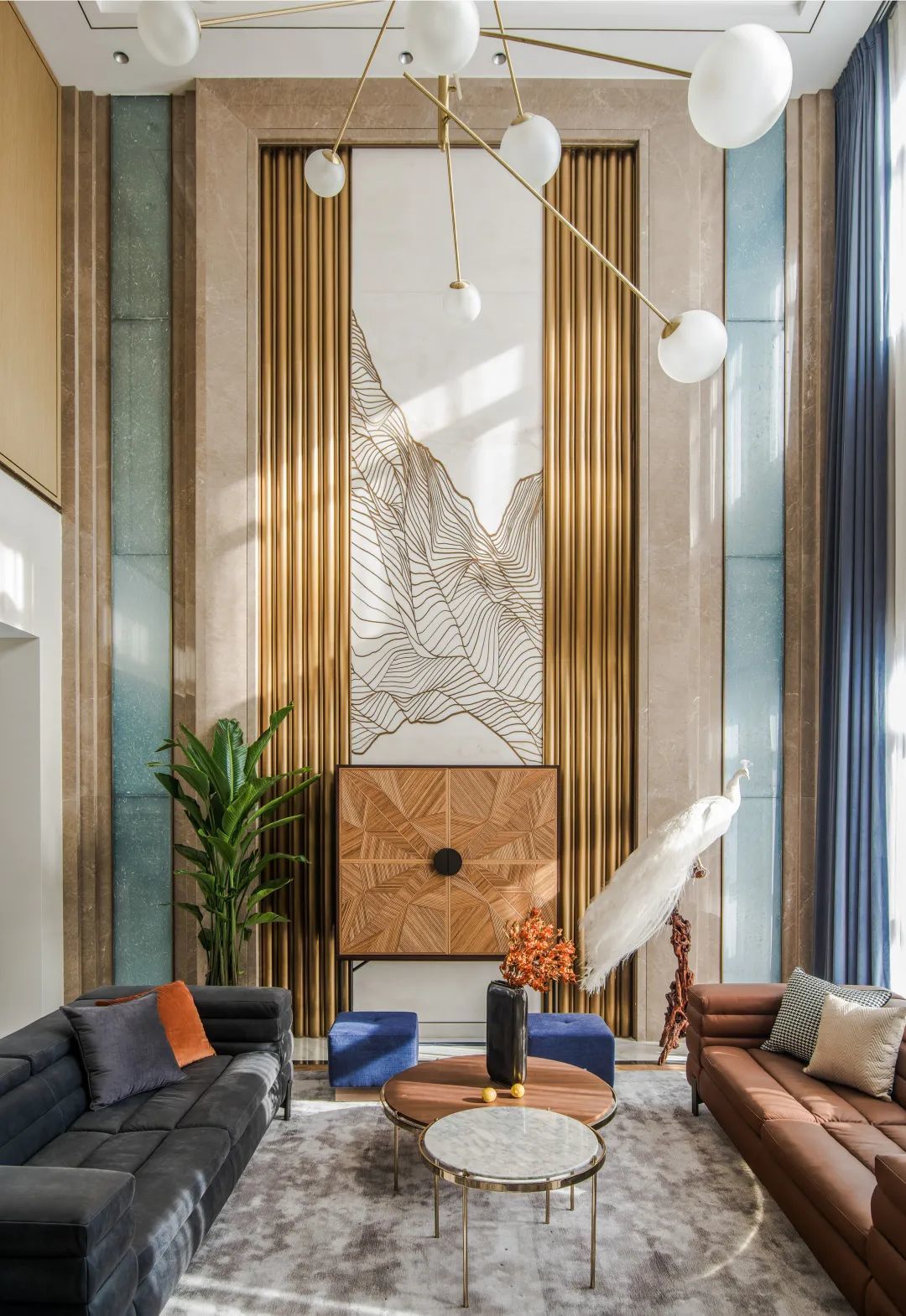 棕色与深蓝搭配的客厅,采用线条感设计,让人感觉既复古又美观独特,镂空的隔墙让功能分区更明显,却又透露出中式美学的神韵。