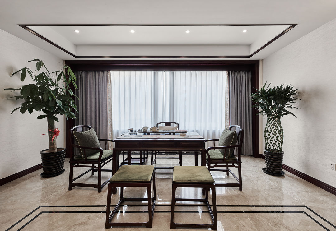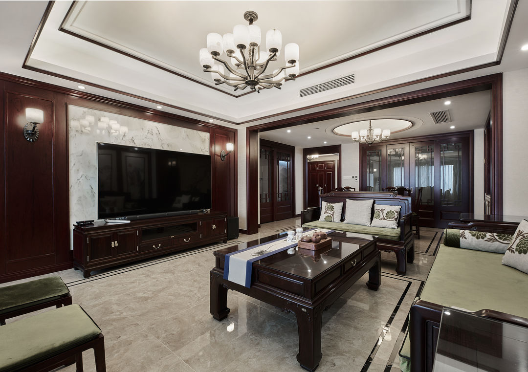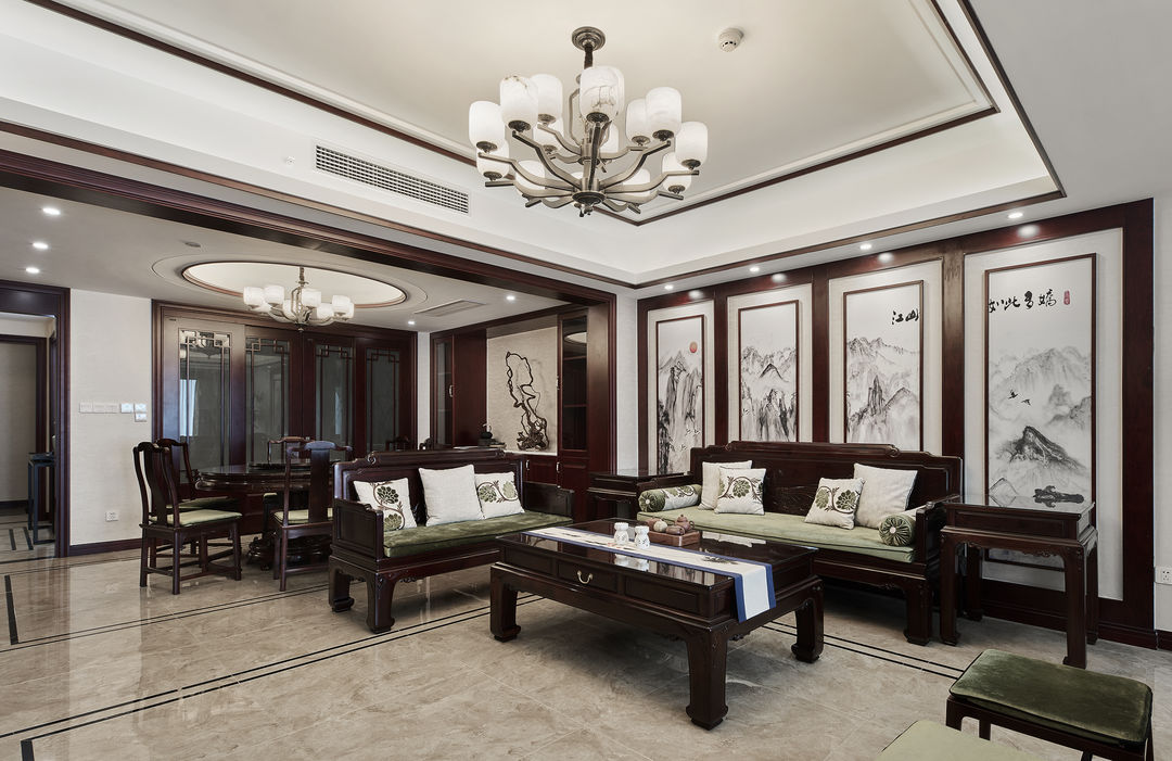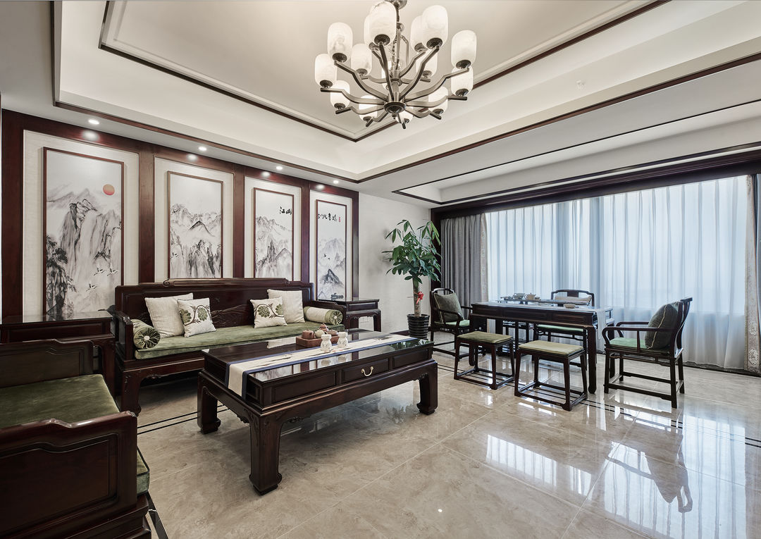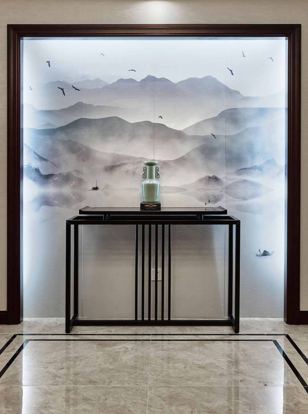 这套家居采用新中式的设计,玄关入户即是衣服水墨画,深棕色的桌面与客厅的家具呼应,营造了一个充满复古、沉稳又温馨的家。