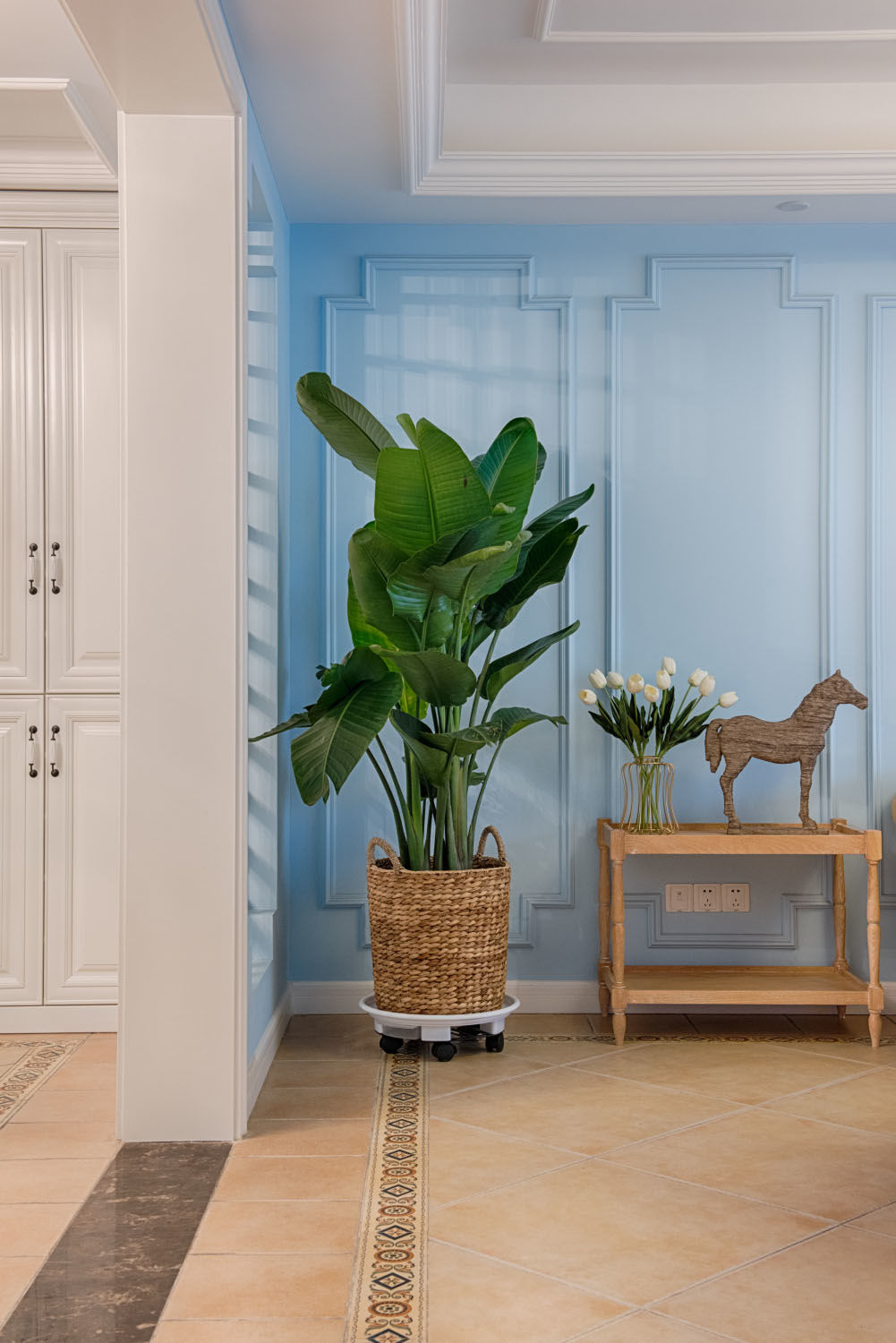 最好是选择一些素雅的图案。这样会更加突显出蓝白两色所营造出的和谐氛围