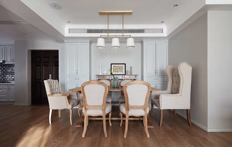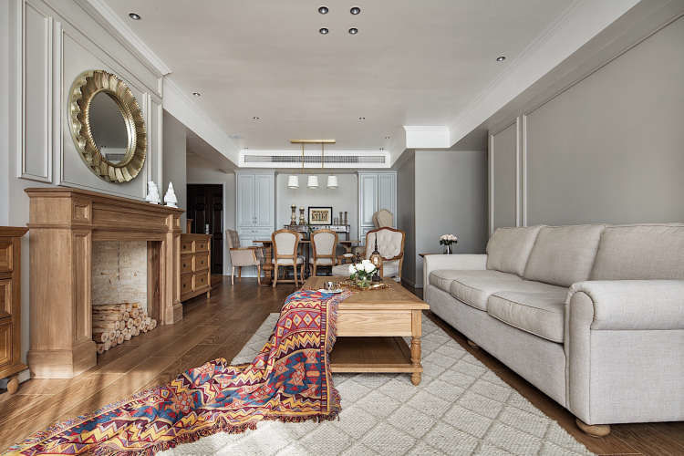 复古感的打造通过家具的材质体现,原木沙发的餐椅营造出一种贵气的宫廷感,壁炉和金属质感的装饰镜仿佛带你走入老友的家暖洋洋的。